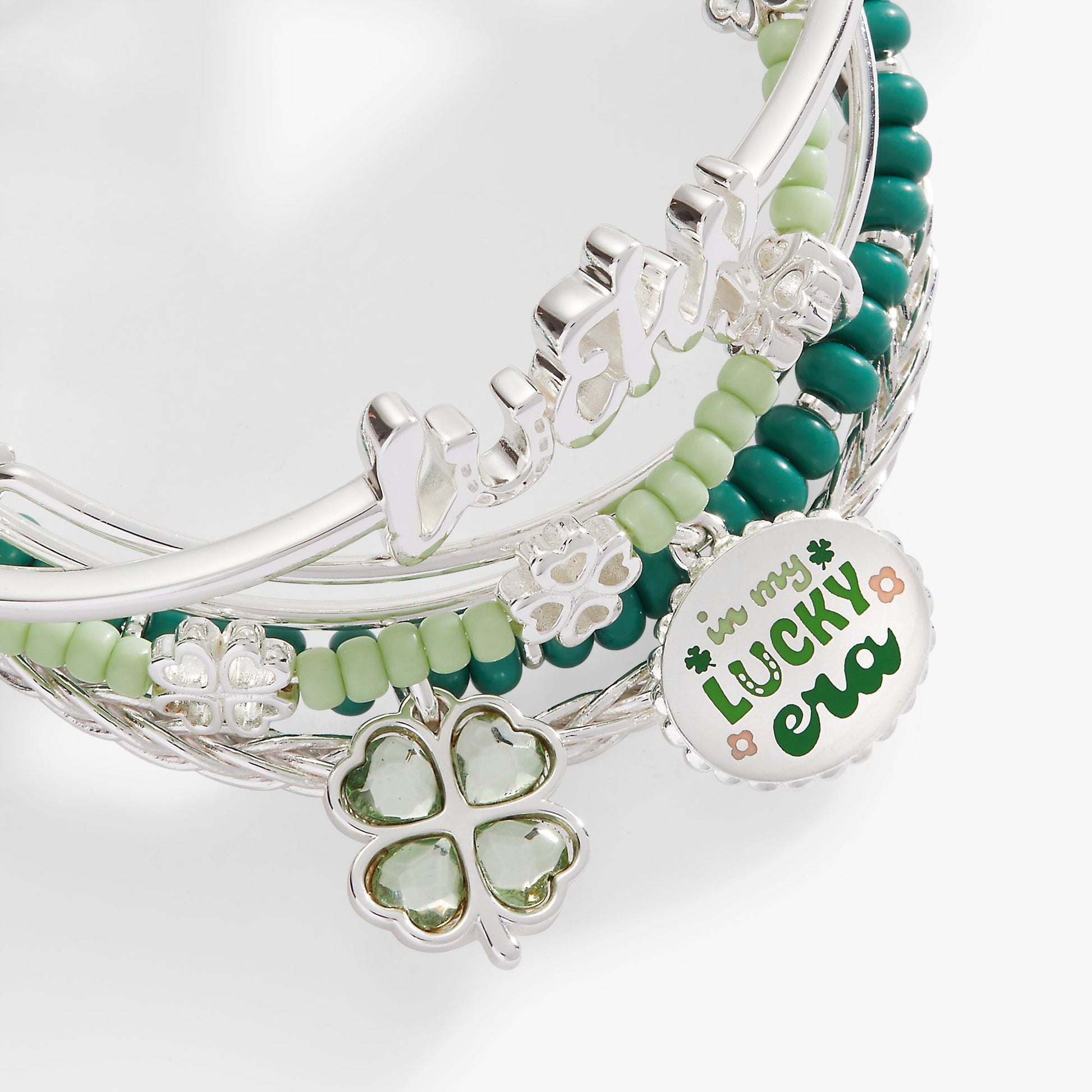 When you’re in your lucky era, you radiate positive vibes and good fortune. This set features five bracelets. One is an open cuff with an inline charm that says “Lucky” with a lucky horseshoe in place of the “u.” The other four are charm bangles on expandable wire bracelets: one has an enamel-embellished charm that says “In My Lucky Era;” one has green and silver-tone beads and a four-leaf clover with green crystals; one has inline four-leaf clover charms made from hearts, with green beads; and one is a twisted metal accent bangle. Wear it as a reminder that you make your own luck.