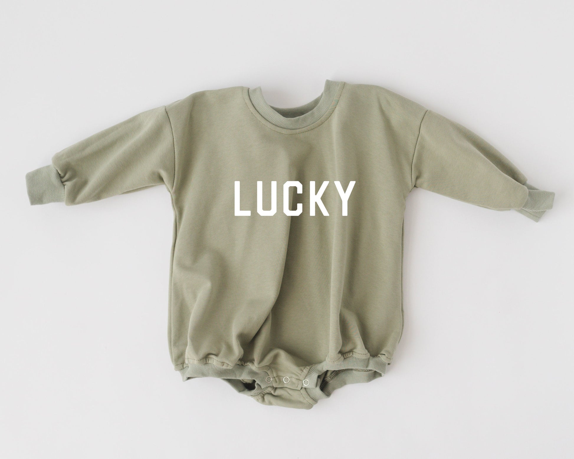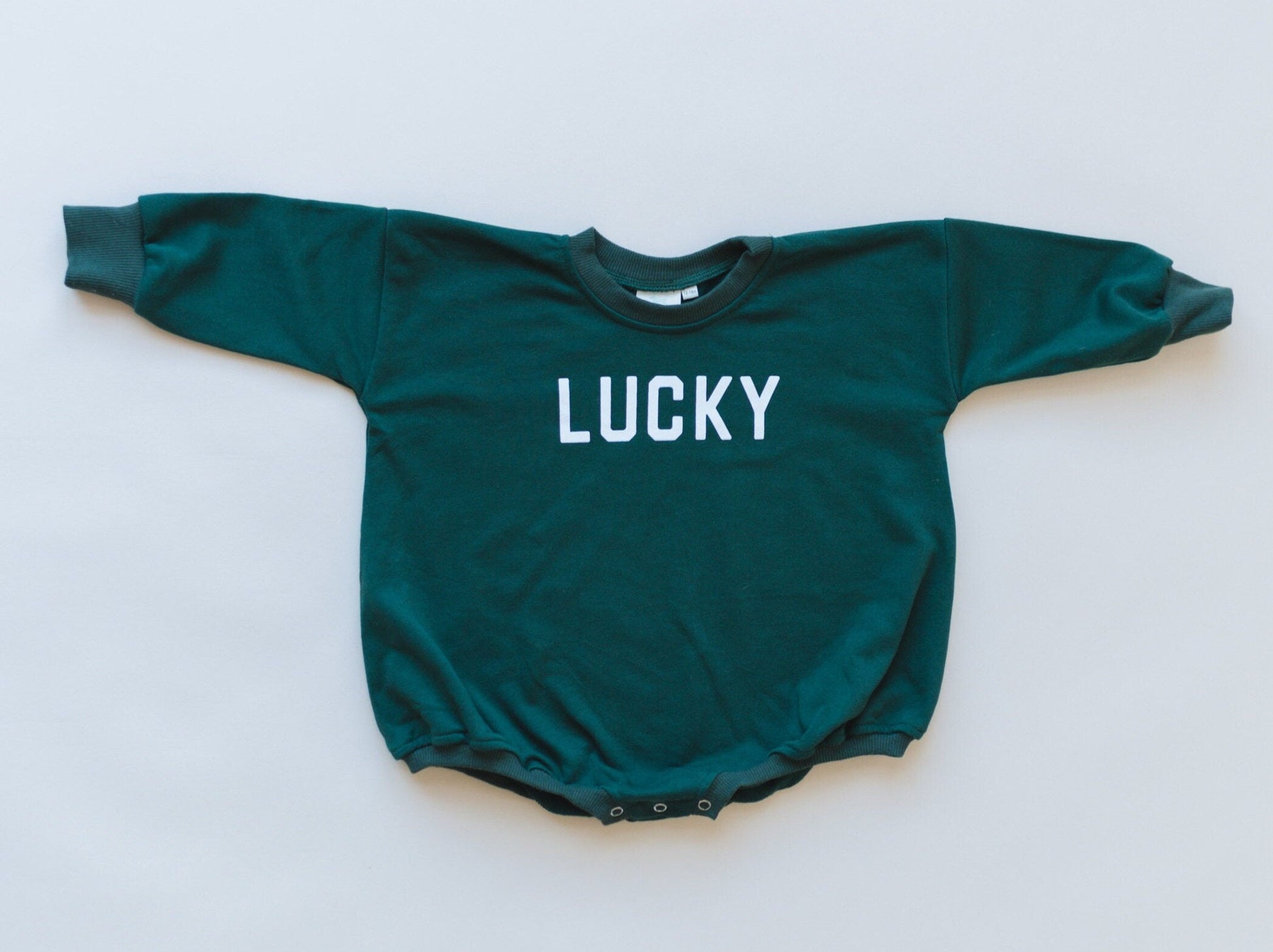 Lucky graphic sweatshirt - crewneck or romper. Lightweight terry material, 83% cotton/17% polyester.