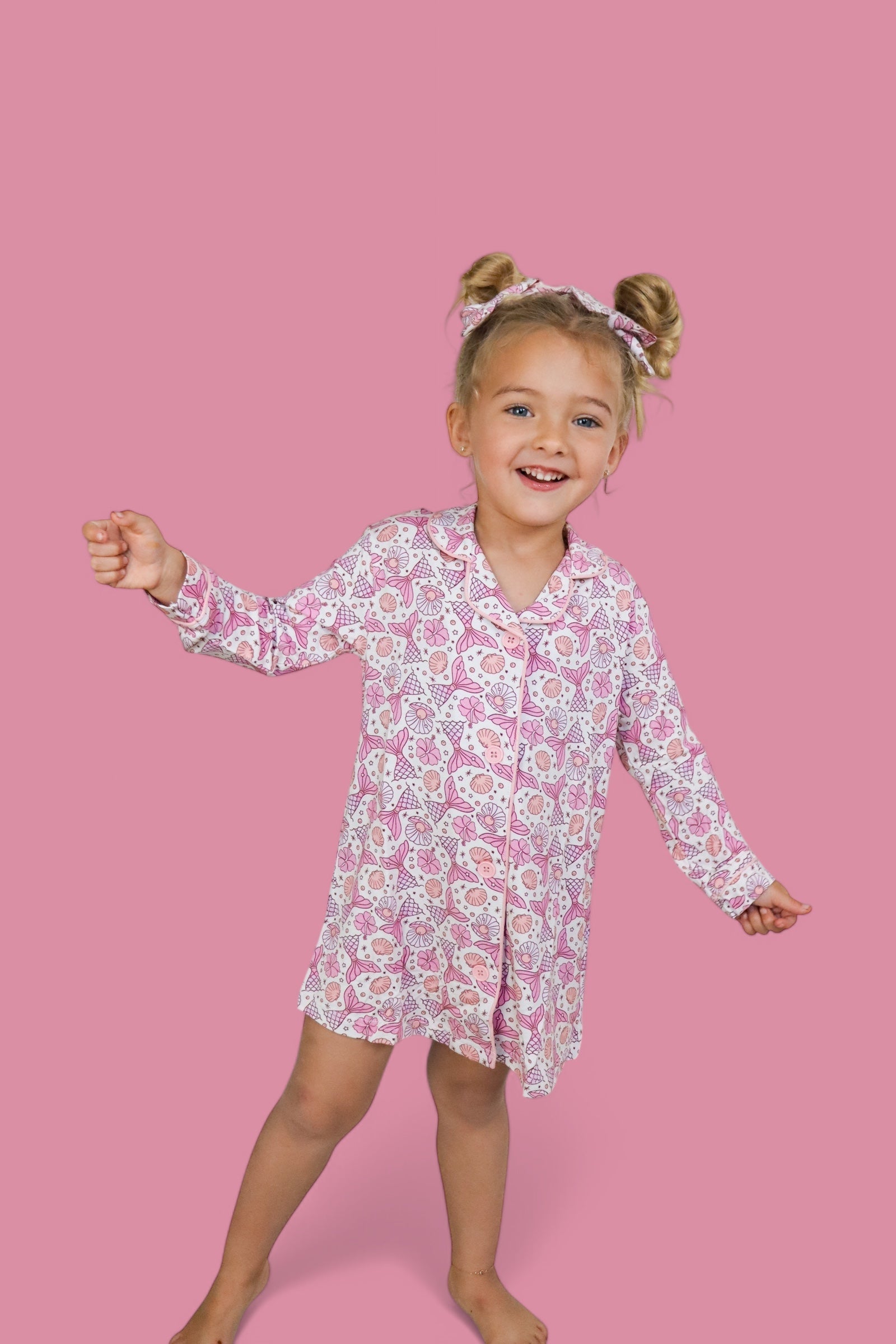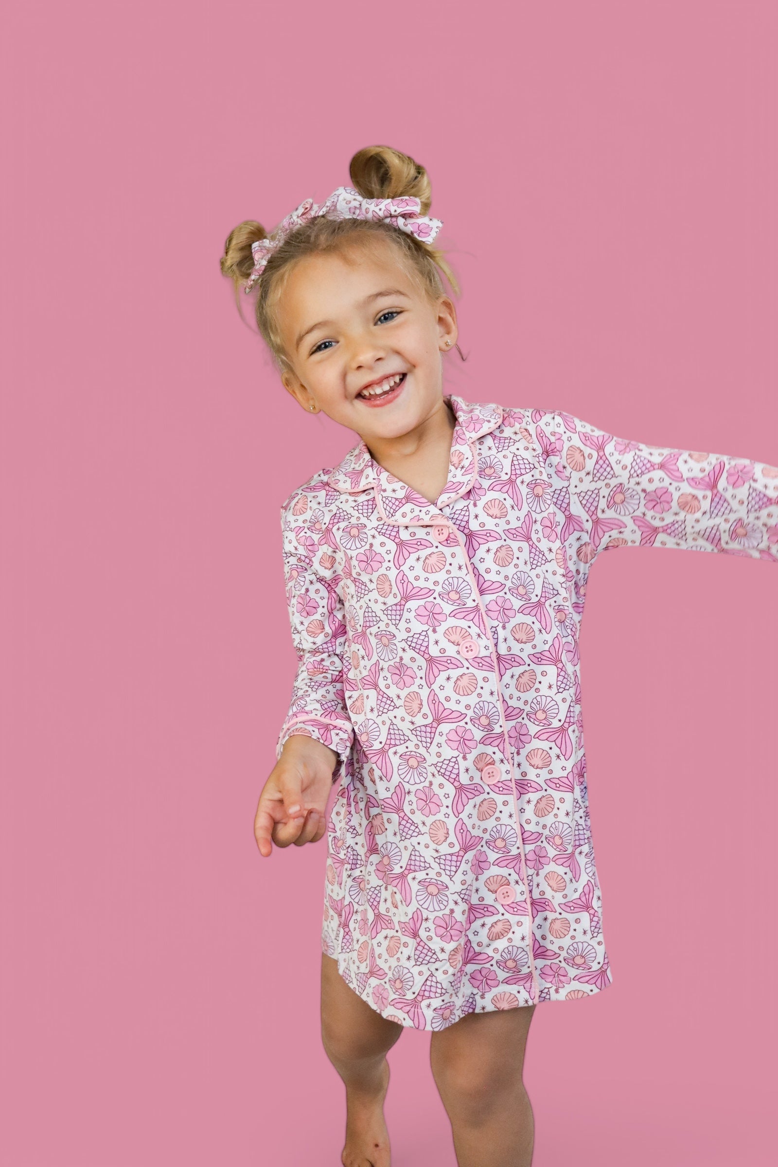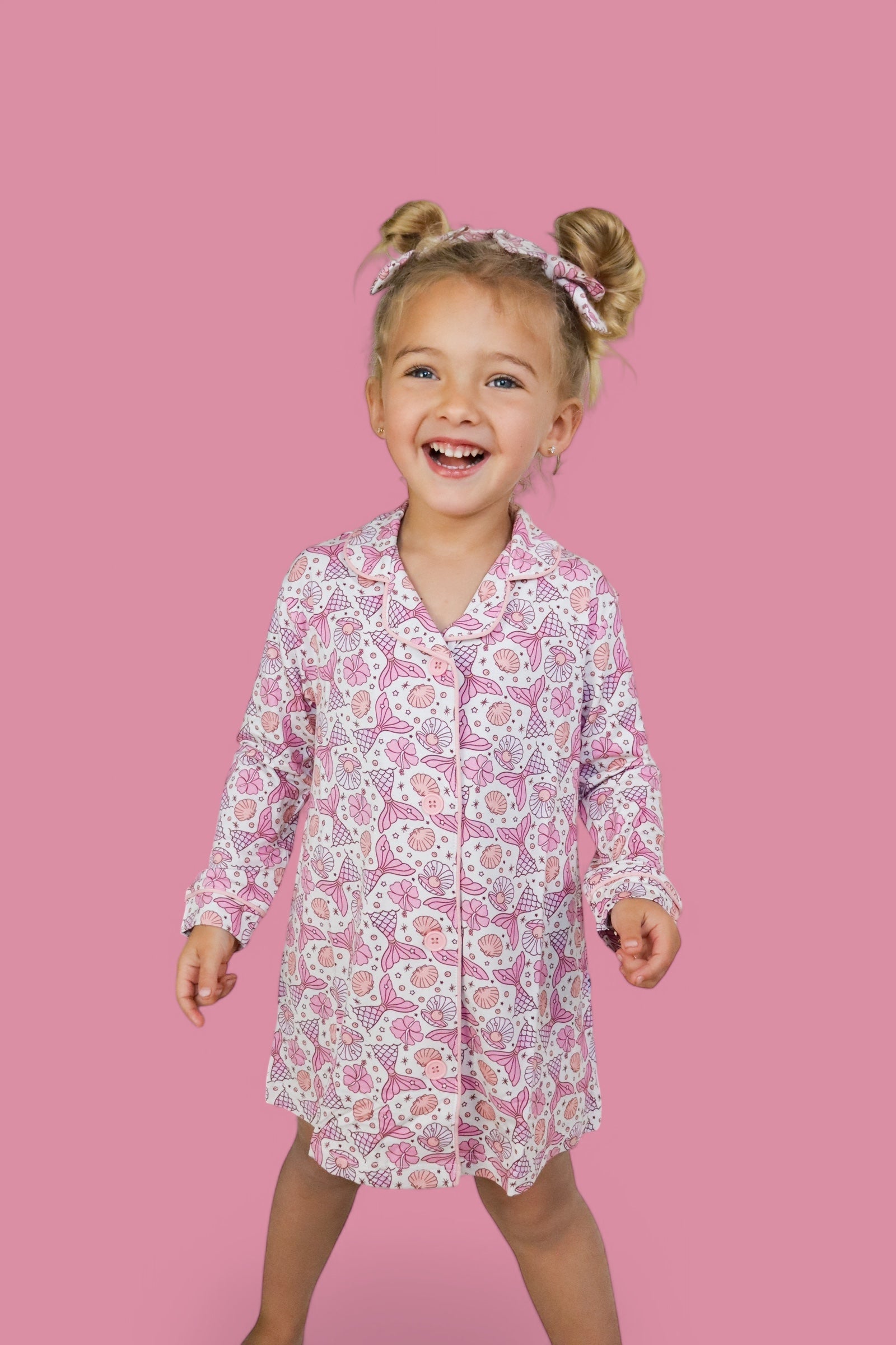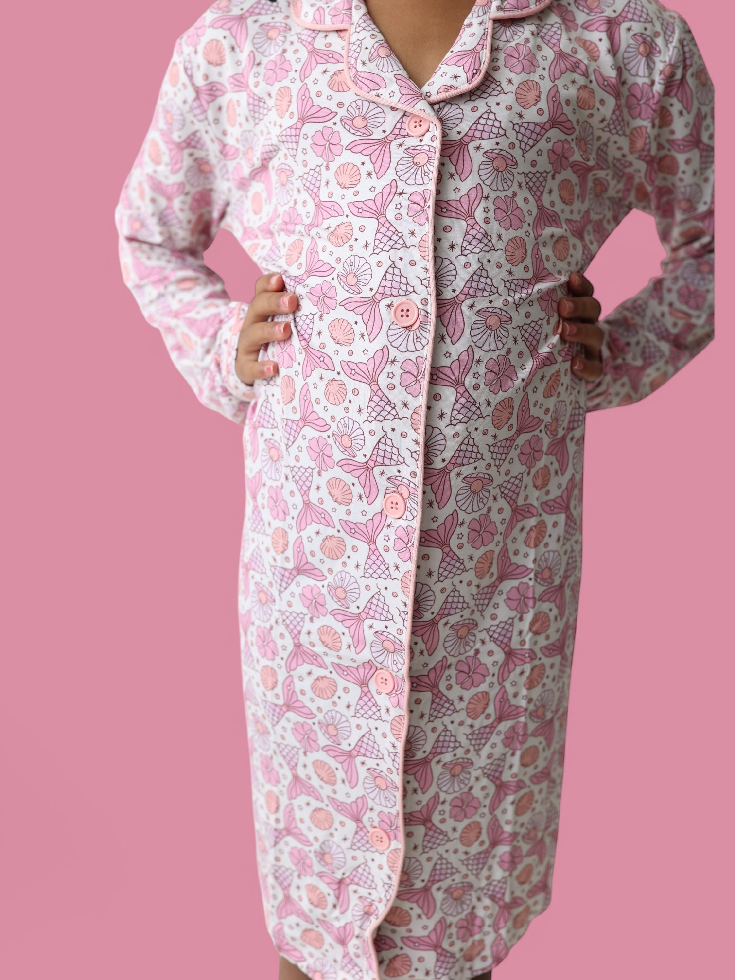 Drift off under the sea in the cozy magic of the Magical Mermaid Girl’s Dream Gown! Featuring twirling mermaid tails, sparkly stars, and sweet seashell treasures in the dreamiest shades of pink, this gown is made for snuggles, twirls, and sweet dreams.