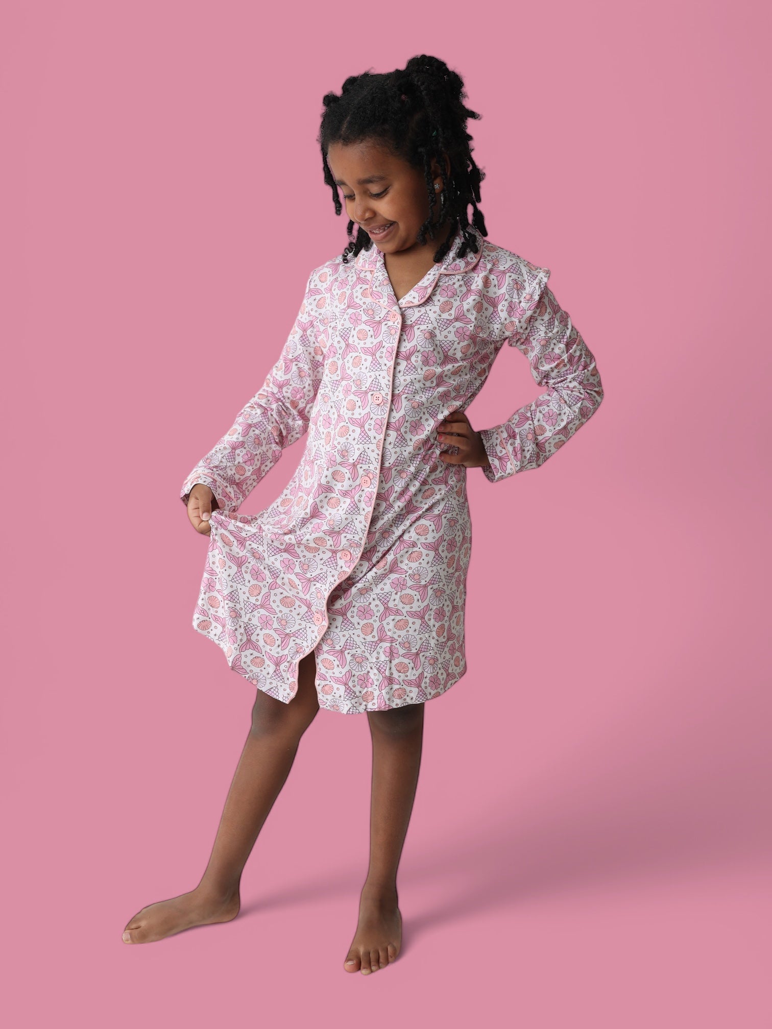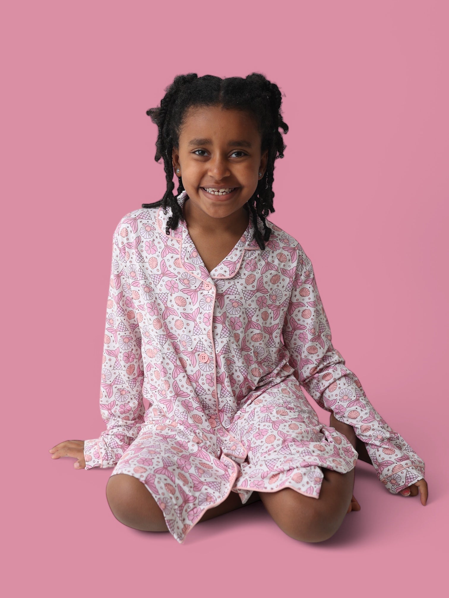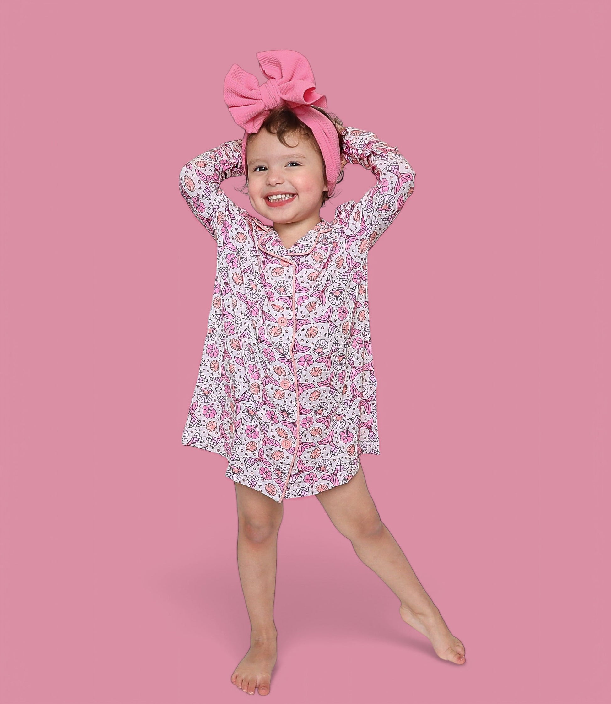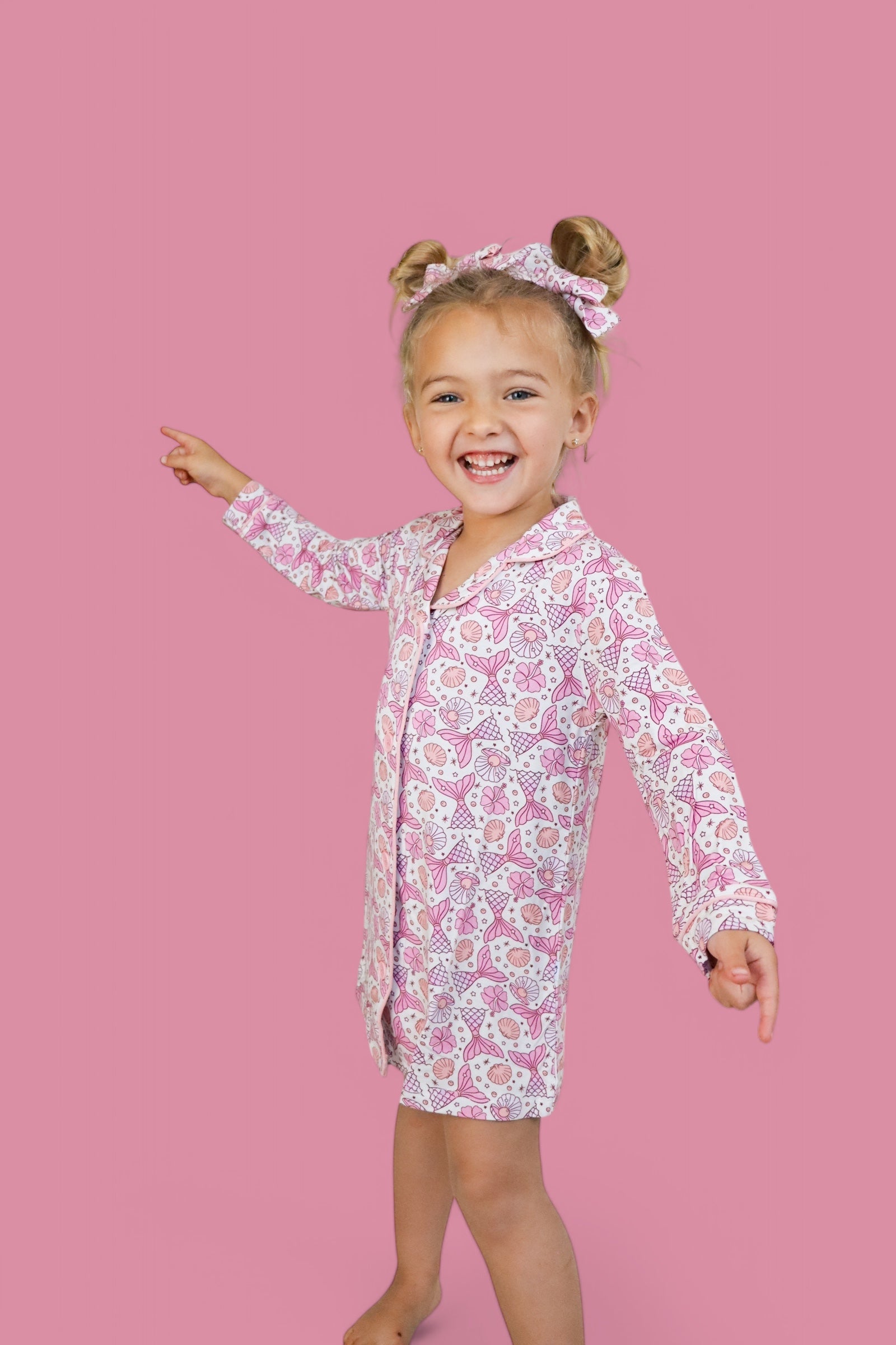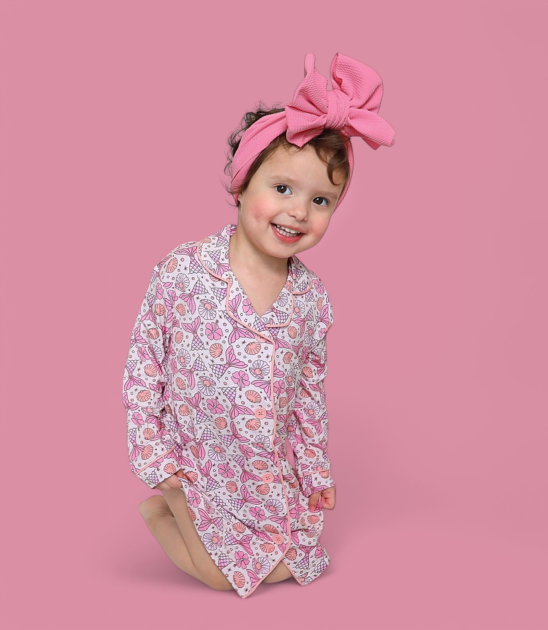 Drift off under the sea in the cozy magic of the Magical Mermaid Girl’s Dream Gown! Featuring twirling mermaid tails, sparkly stars, and sweet seashell treasures in the dreamiest shades of pink, this gown is made for snuggles, twirls, and sweet dreams.