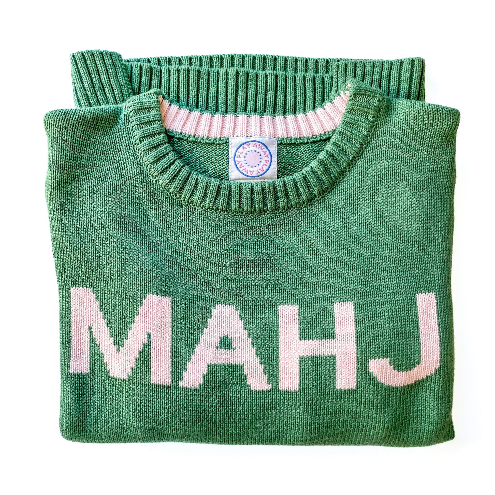 Knit MAHJ sweater- mid weight makes it a great piece year round! Available in white and baby blue or green and blush pink.