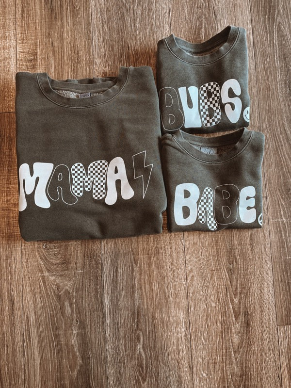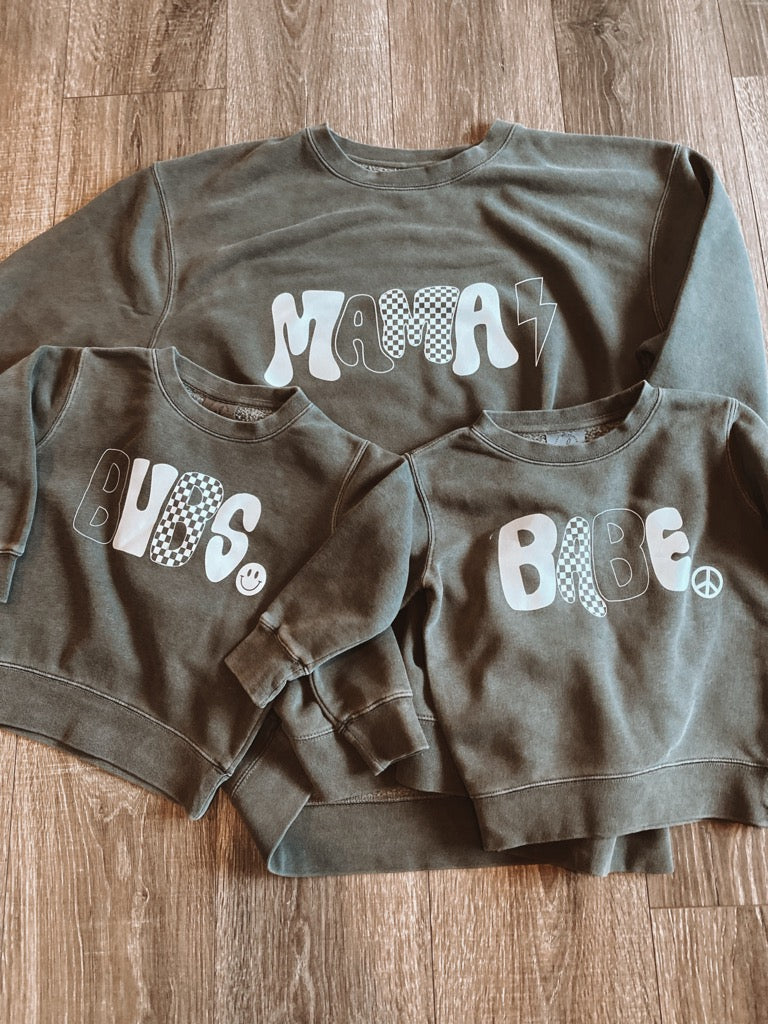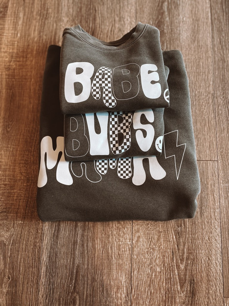 Printed on our favorite brand, Independent Trading Co. Handwritten bubble font lettering with checker design. Sleeve has an electric bolt on it as well. Don't forget to match your little one, be sure to check out our other listings.