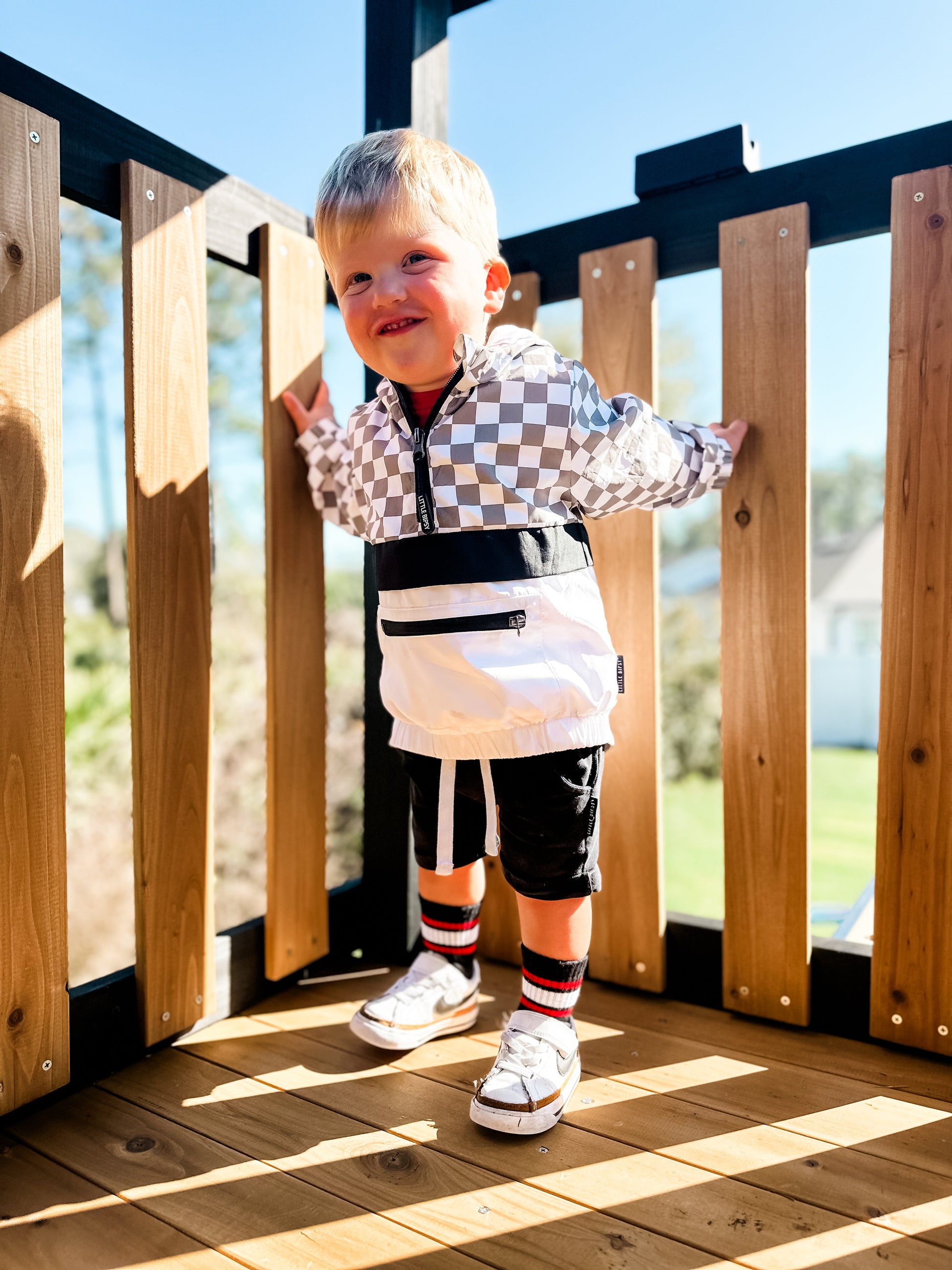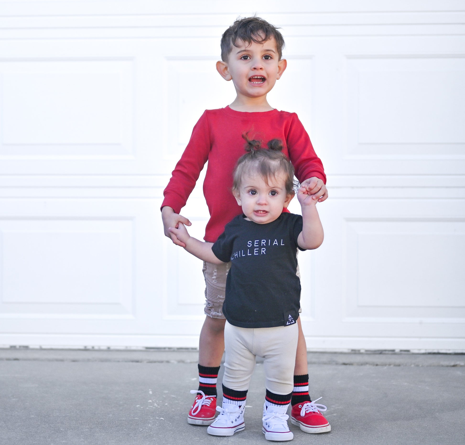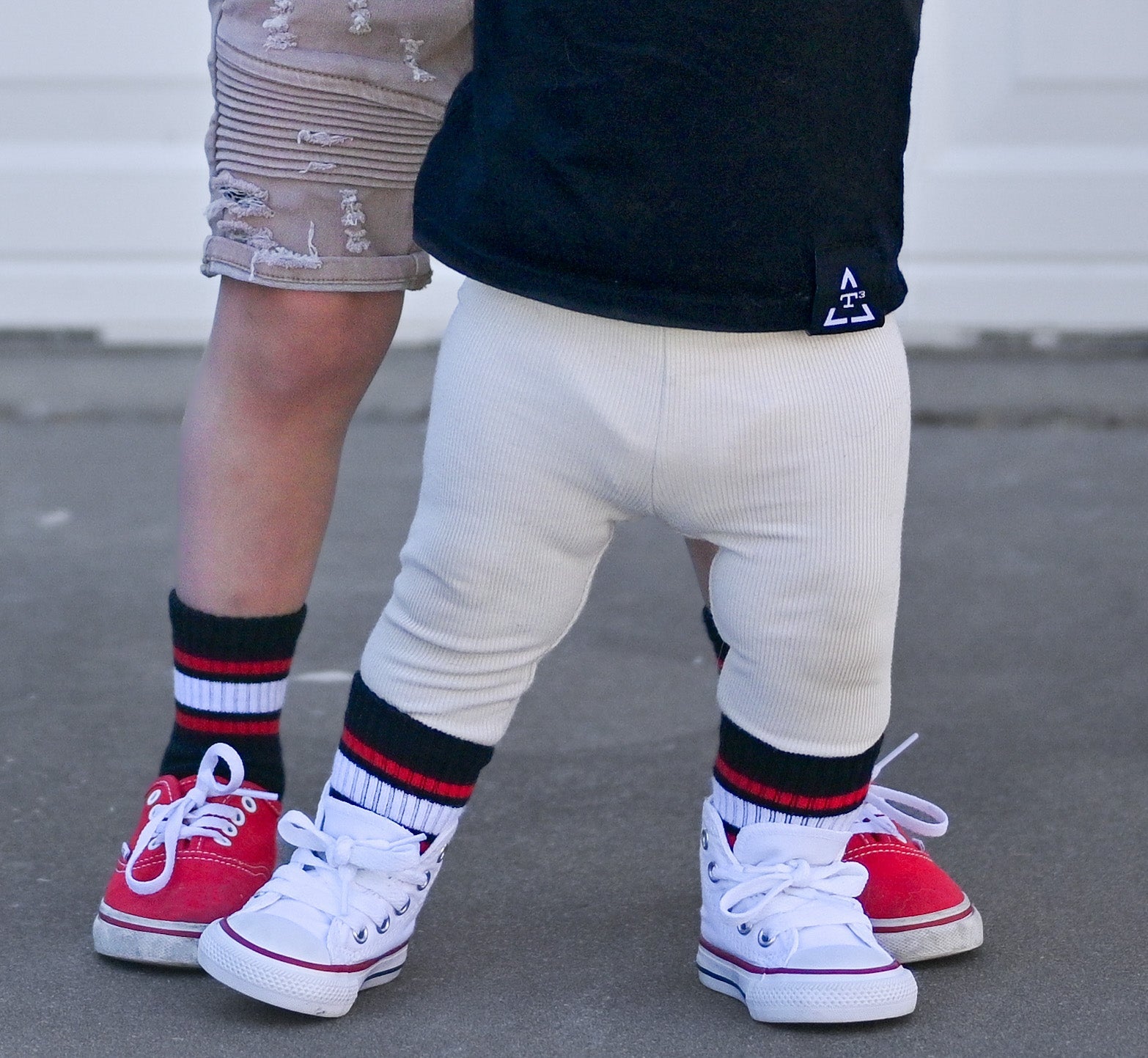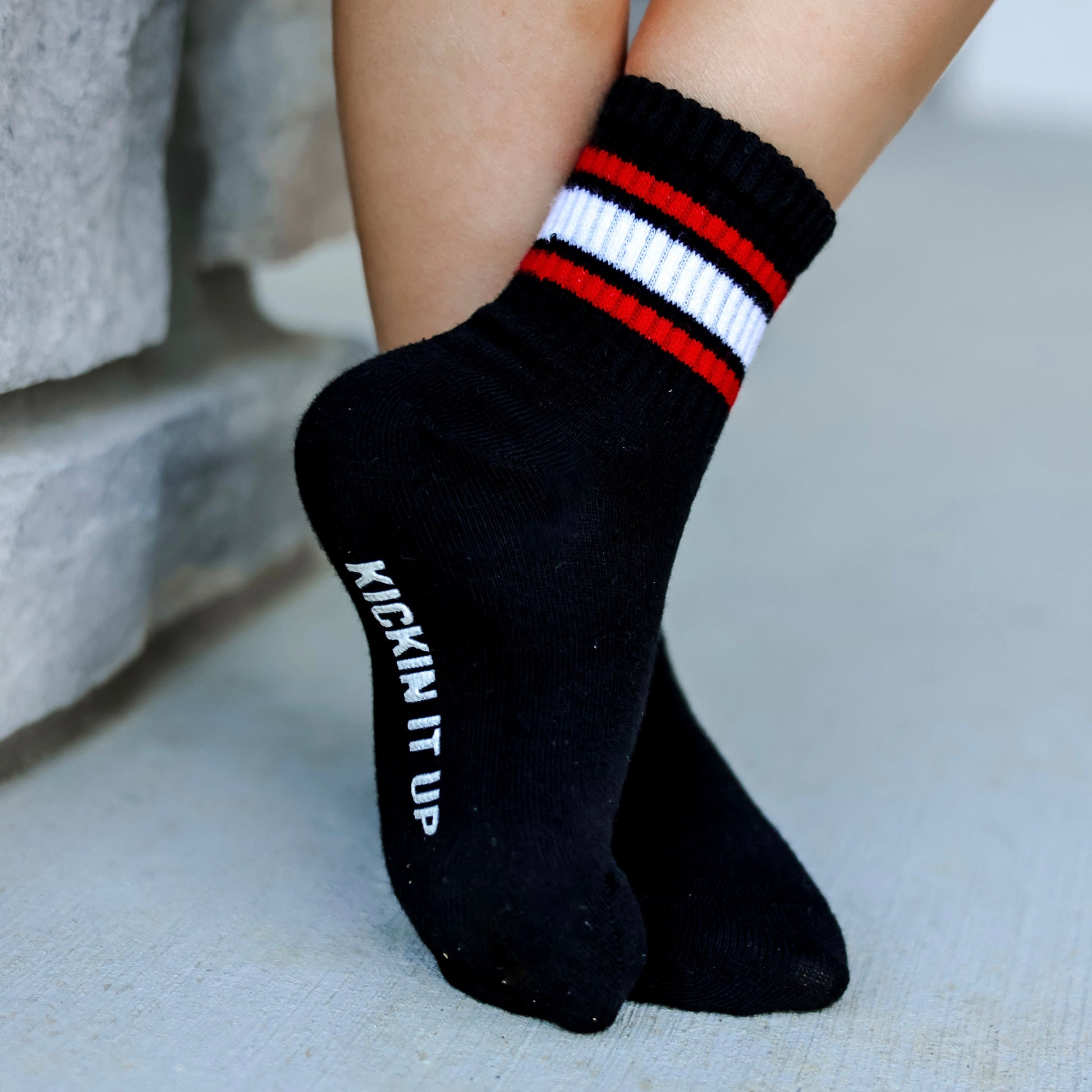 Sizes Infant/XXS, Extra Small, Small + Medium have logo grips on the bottom of the feet and size Large has a stitched logo on the bottom of the feet.
