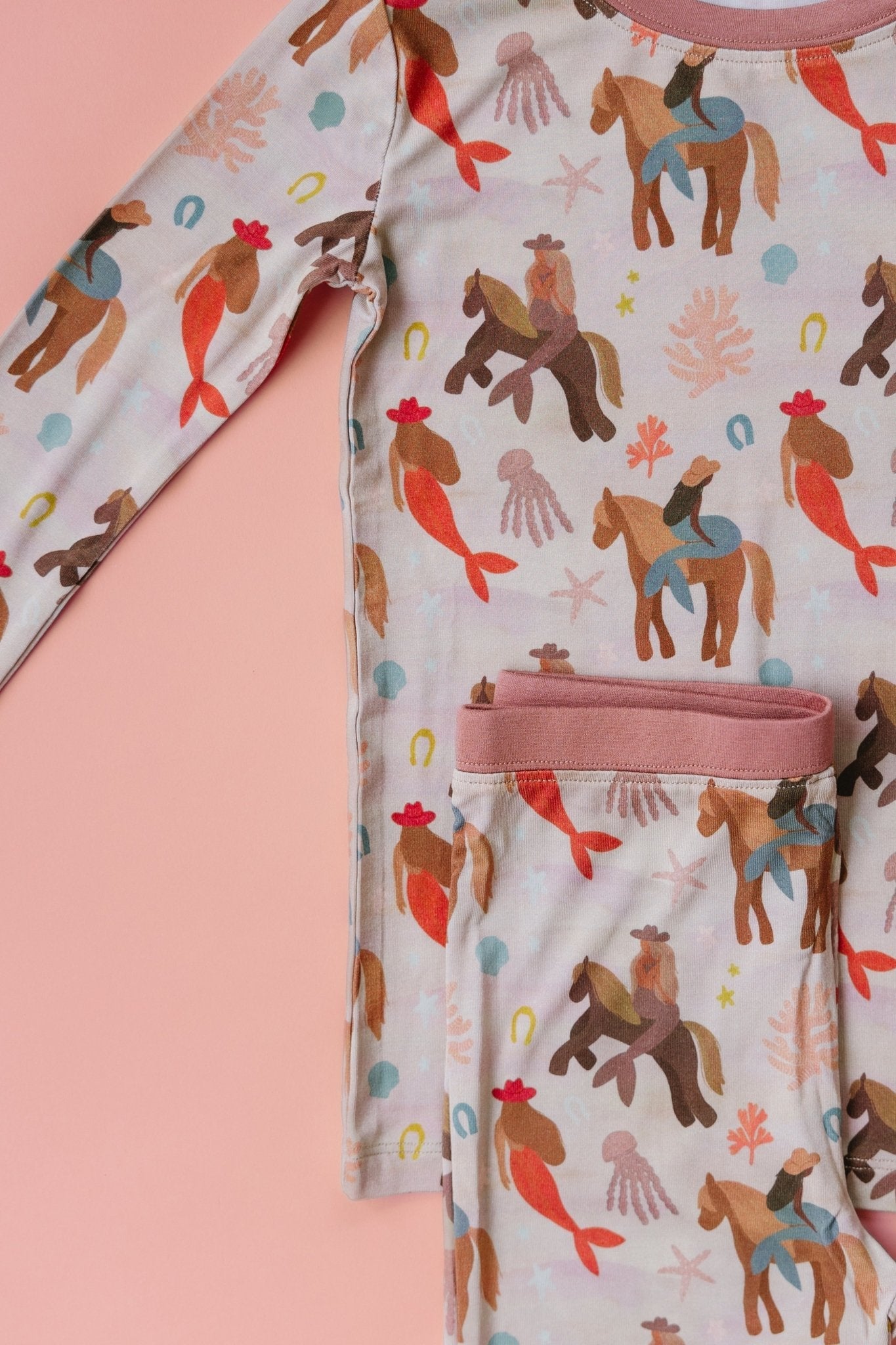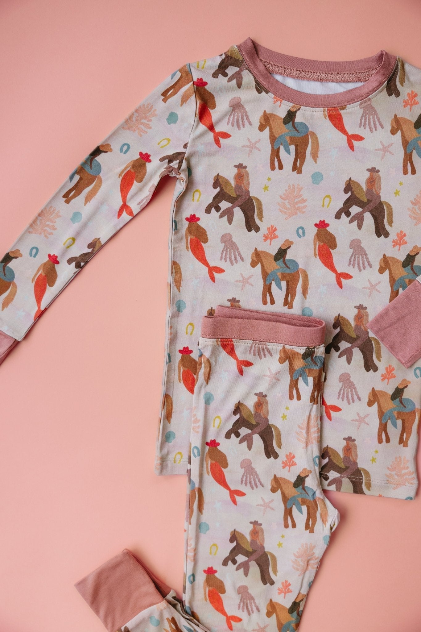 Our Mermaid Cowgirl Two-Piece Pajama Set – Toddler & Kids Set is made for cozy times, slow mornings, and everything in between. Featuring our whimsical mermaid-meets-western print, this long-sleeve top and matching pants set is made from a premium blend of 95% viscose from bamboo and 5% spandex — buttery-soft, breathable, and stretchy for all day comfort.