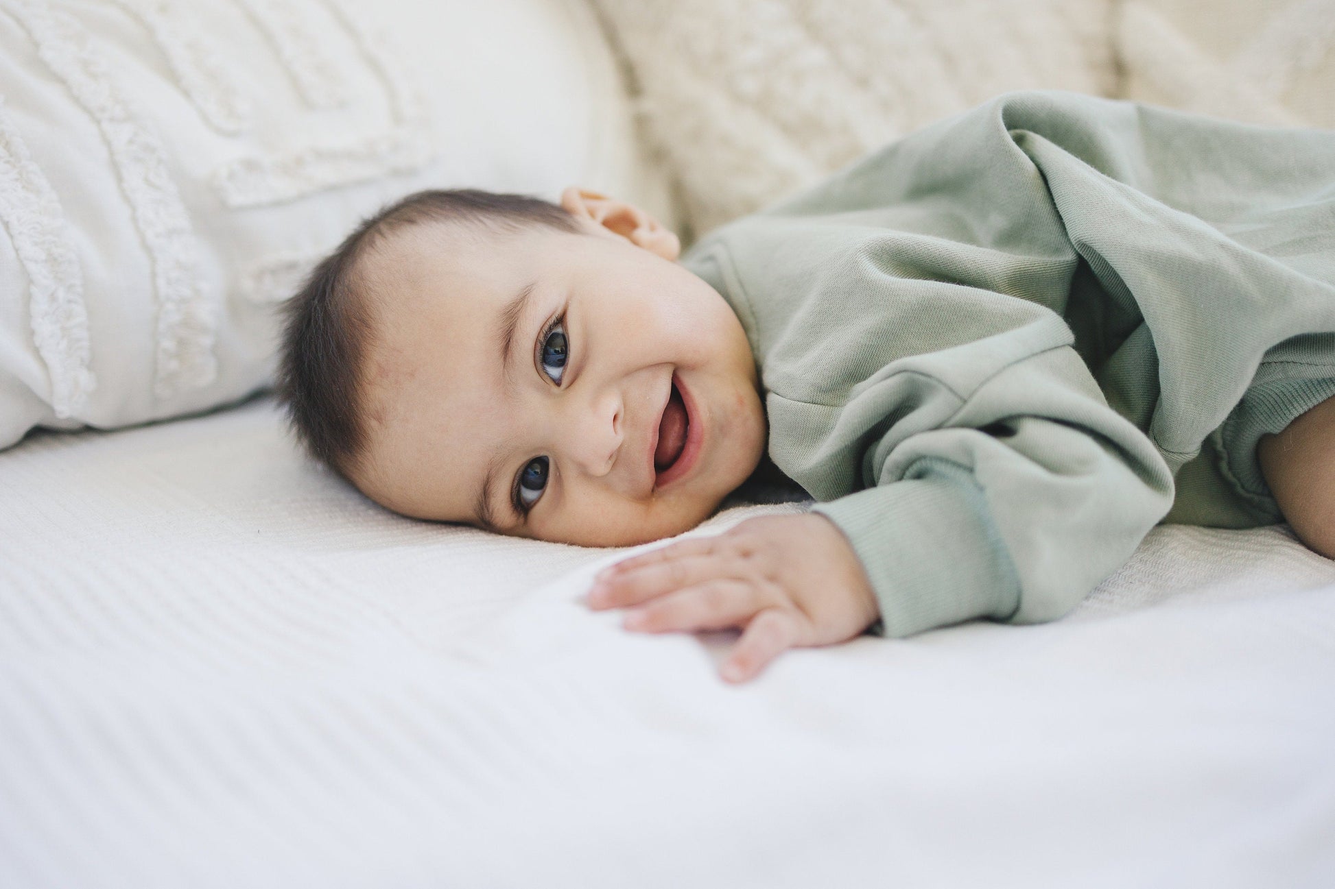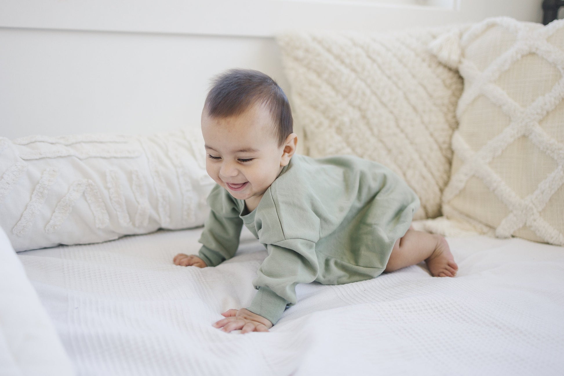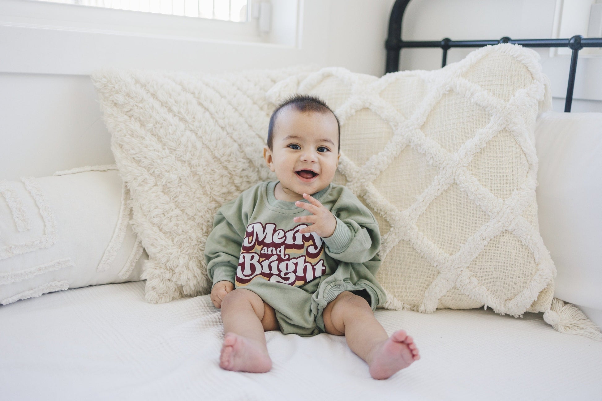Merry and Bright graphic oversized sweatshirt romper with snaps at crotch. Lightweight terry material.