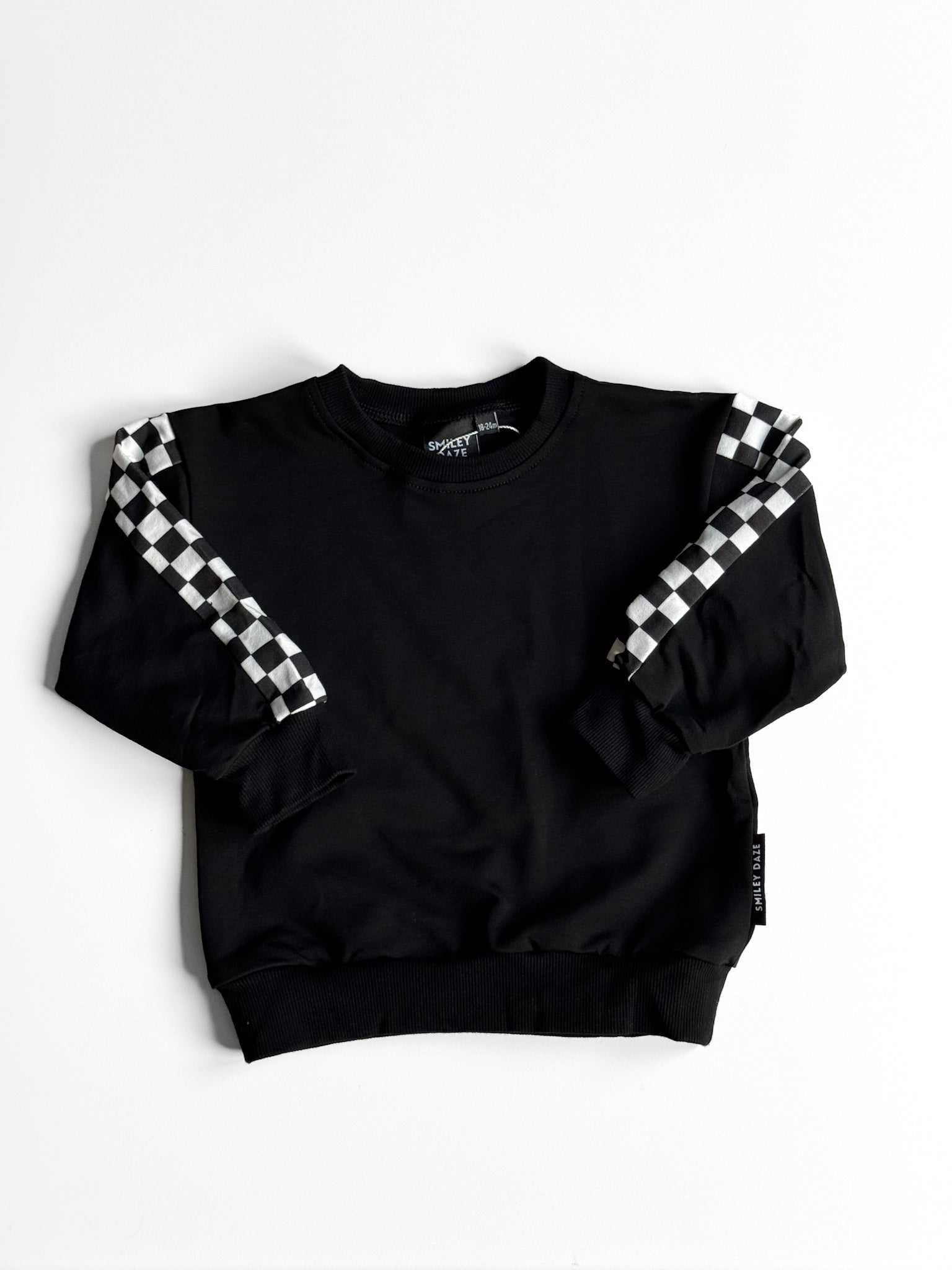 Turn up the style and let your little one lead the pack in the Midnight Crew — a bold black crewneck built for high-energy kids with high-voltage style. Featuring standout checkered sleeves and an ultra-comfy fit, this piece brings the perfect mix of cool and cozy to their everyday rotation.