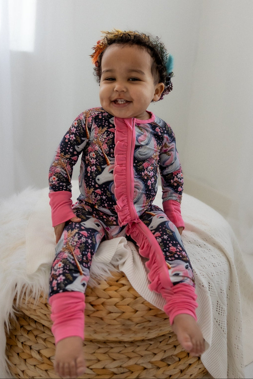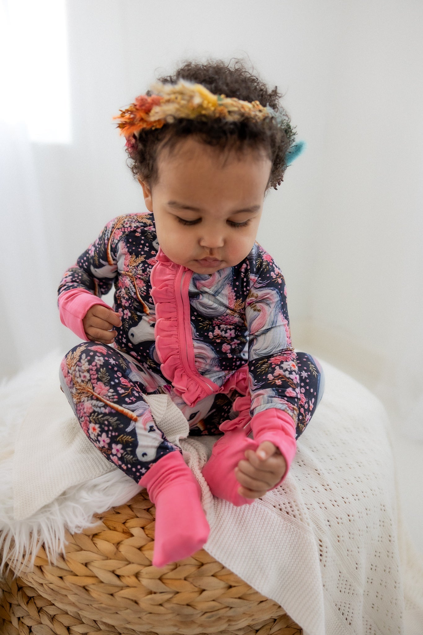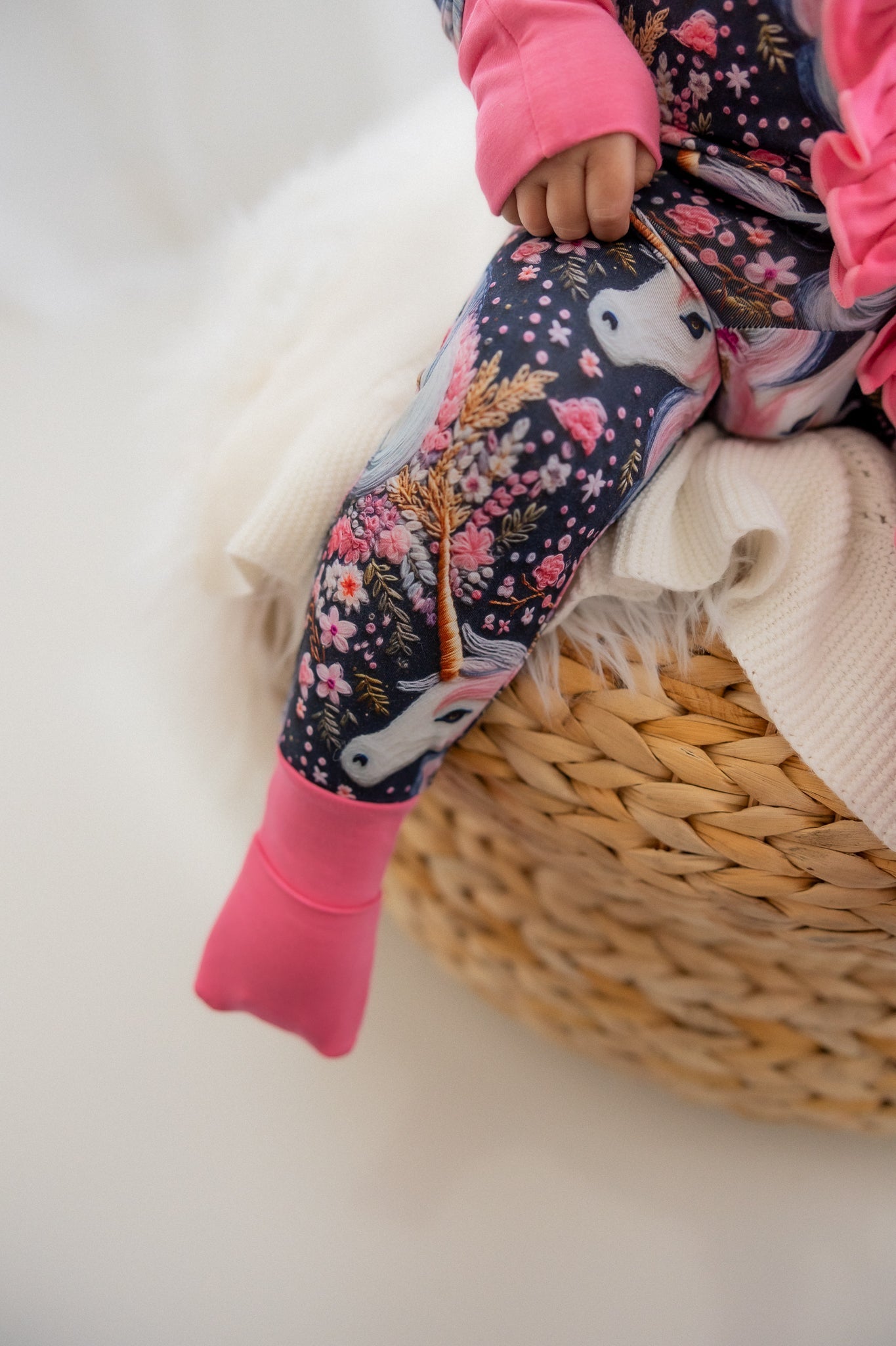 "Mila Mane" is a magical design full of gorgeous details. Delicate pink and gold flowers appear to be hand stitched across the midnight navy backdrop surrounding soft and stunning unicorns with a flowing mane and golden horn. Let their imagination run wild as they play and dream in "Mila Mane."