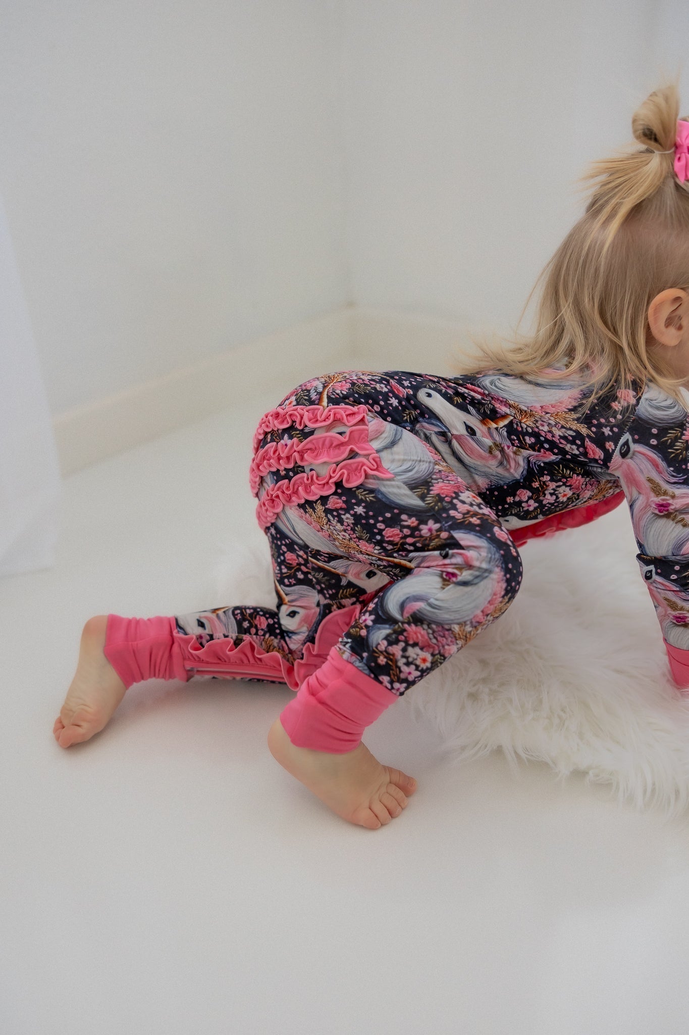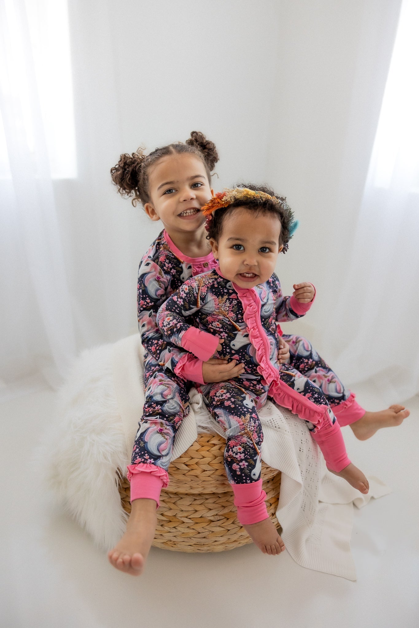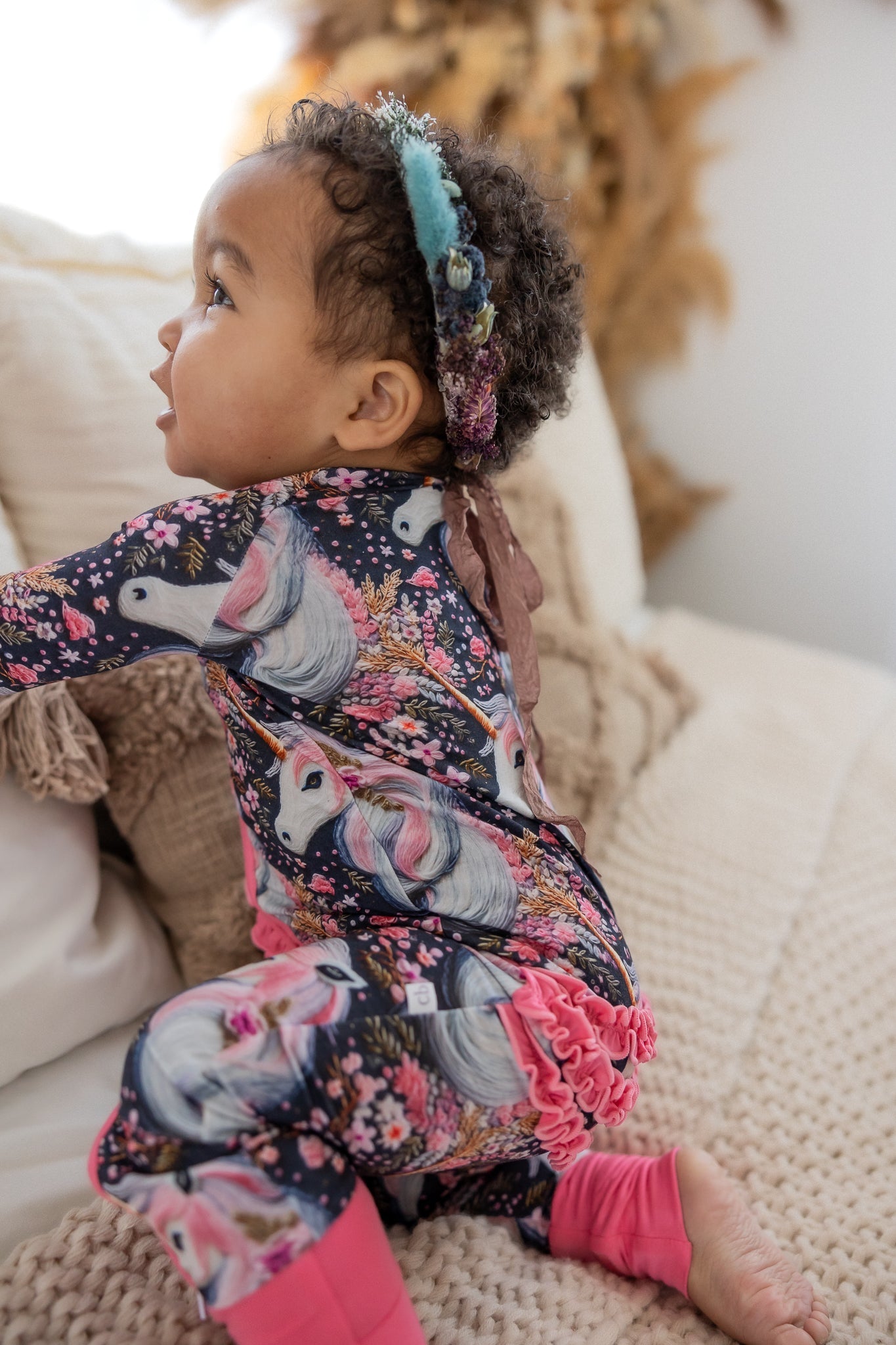 "Mila Mane" is a magical design full of gorgeous details. Delicate pink and gold flowers appear to be hand stitched across the midnight navy backdrop surrounding soft and stunning unicorns with a flowing mane and golden horn. Let their imagination run wild as they play and dream in "Mila Mane."