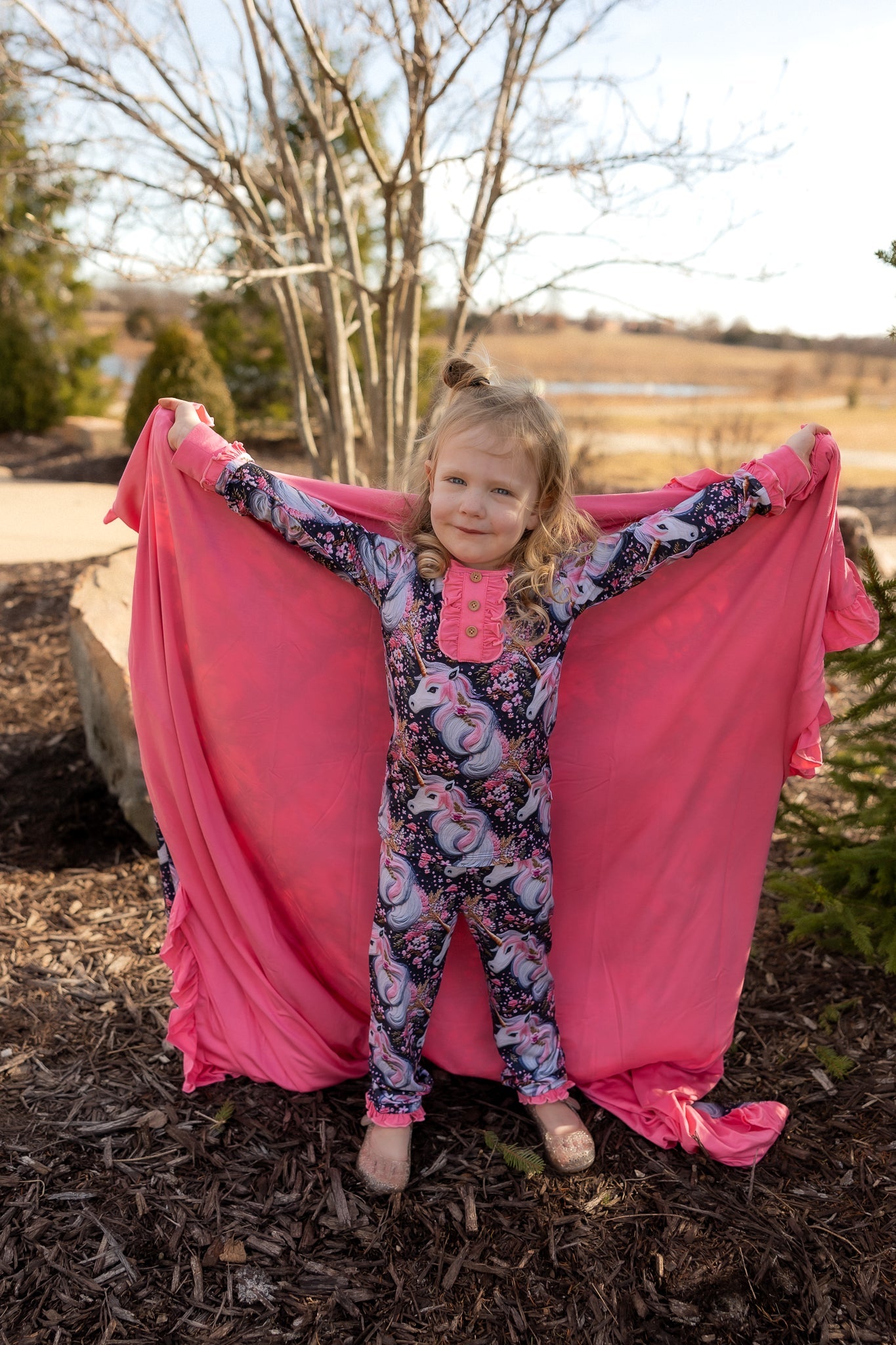 Snug fit and large cuffs on hands and feet allow for the Jammie’s to fit growing kids longer. Details such as wooden buttons and ruffles on girl patterns give these pajamas an extra touch of style.