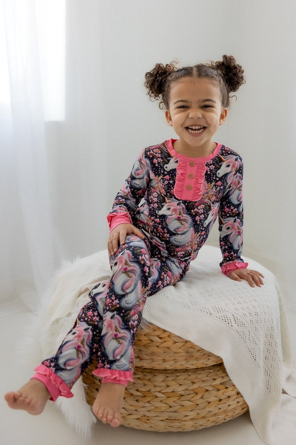 "Mila Mane" is a magical design full of gorgeous details. Delicate pink and gold flowers appear to be hand stitched across the midnight navy backdrop surrounding soft and stunning unicorns with a flowing mane and golden horn. Let their imagination run wild as they play and dream in "Mila Mane."