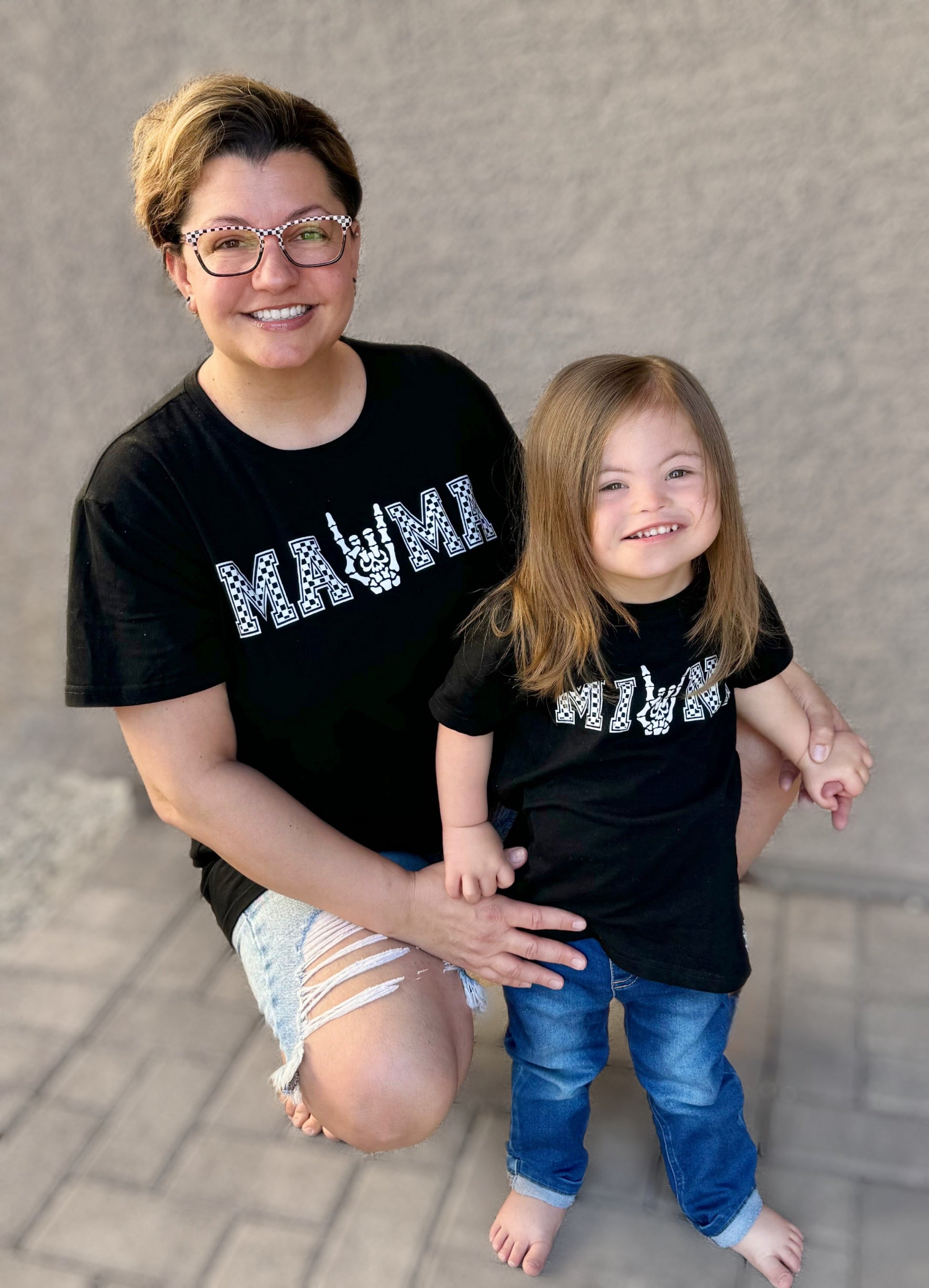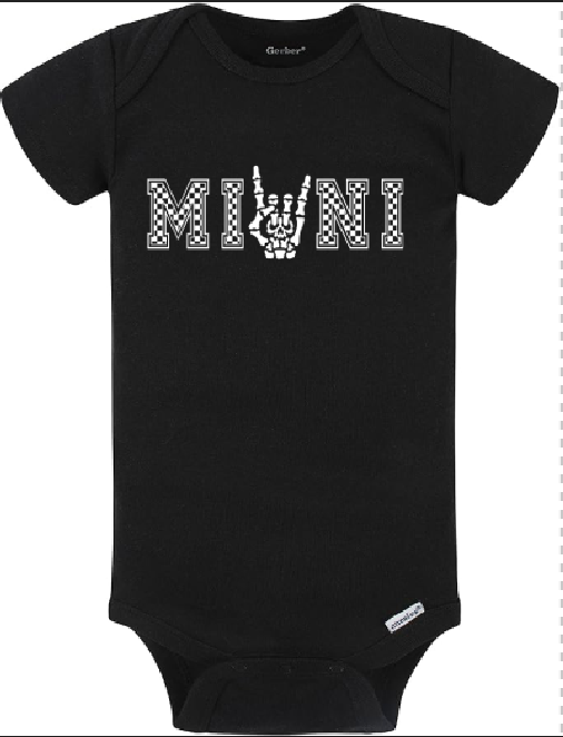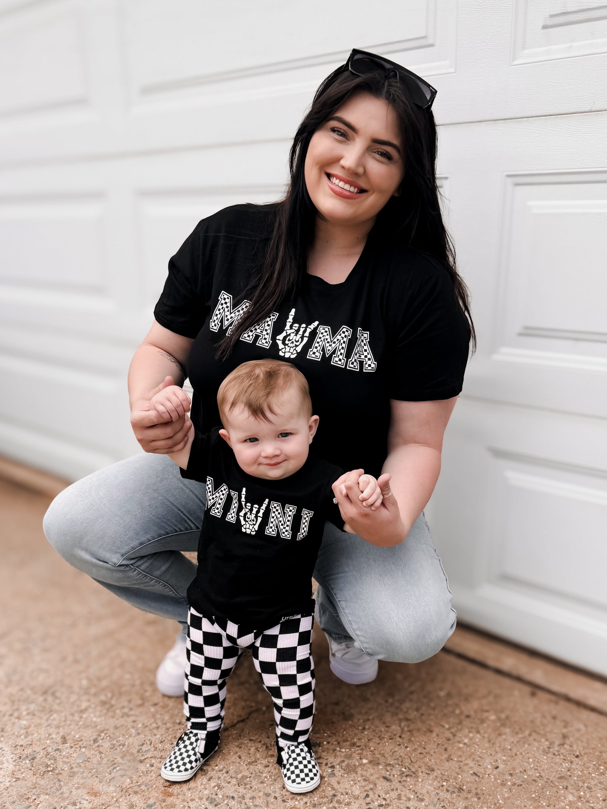 Start 'em young, rockstar! 🤘 Get your little one geared up for Mother's Day and beyond with our Mini with Horns shirt. Let them join the fun in style and match with Mama or Dada!