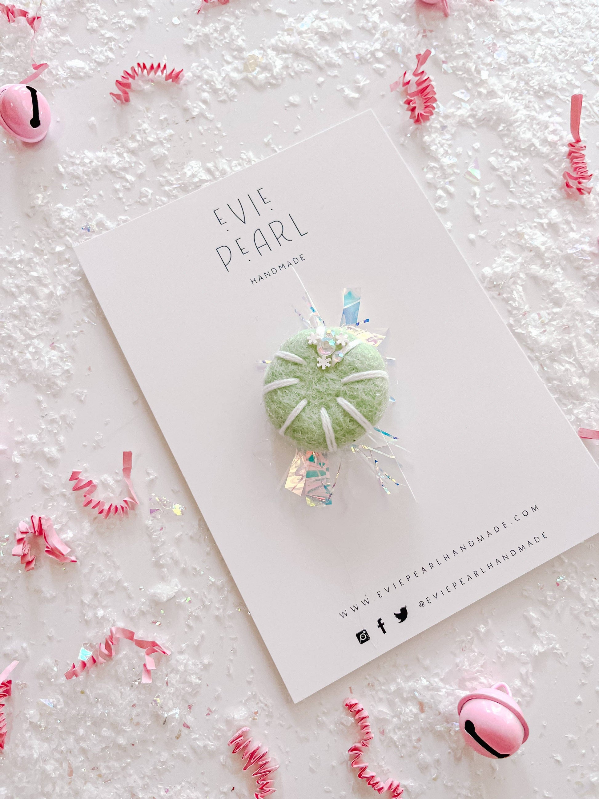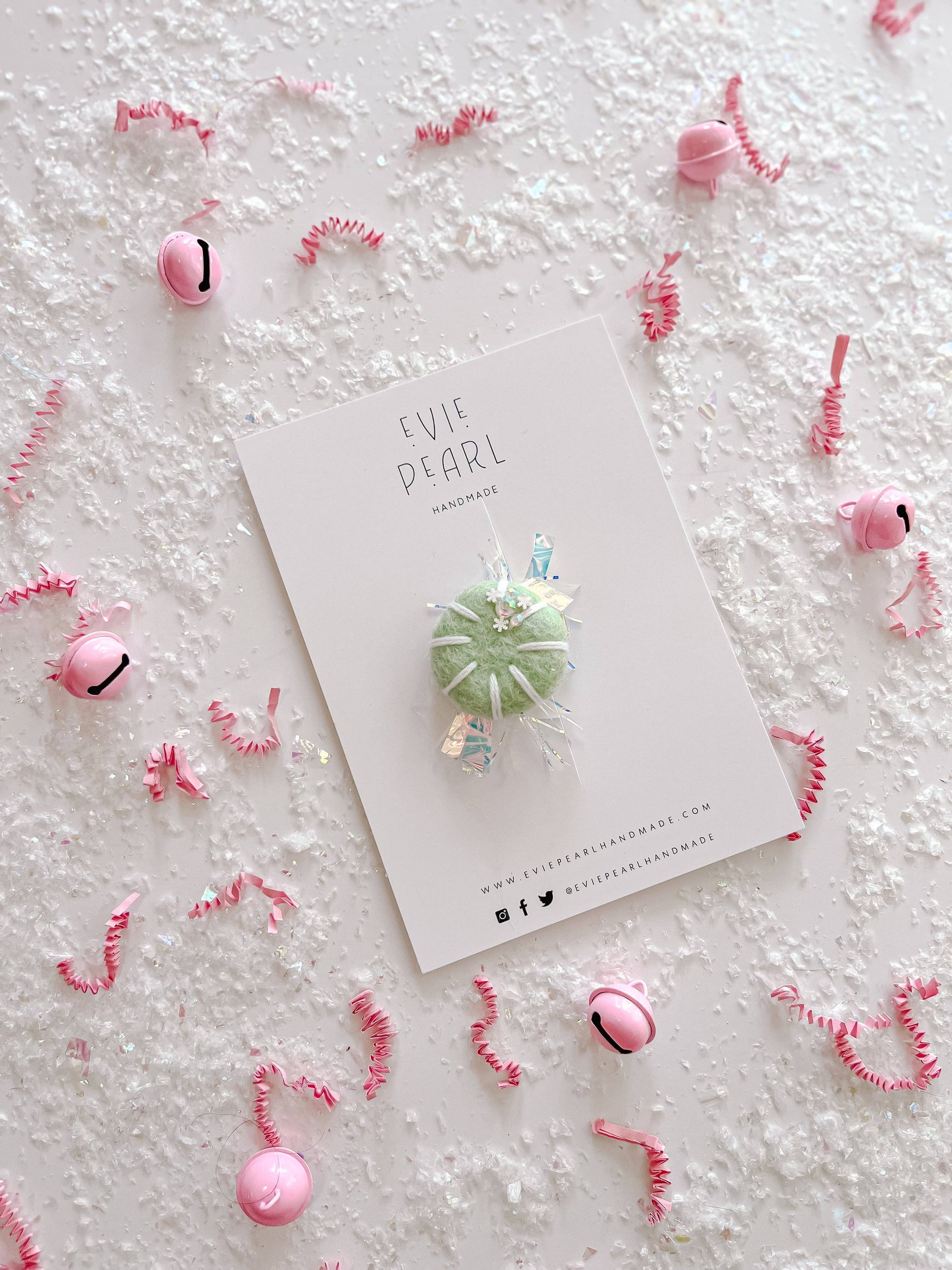 This listing is for one mint peppermint clip with tinsel. It comes on a medium alligator clip.