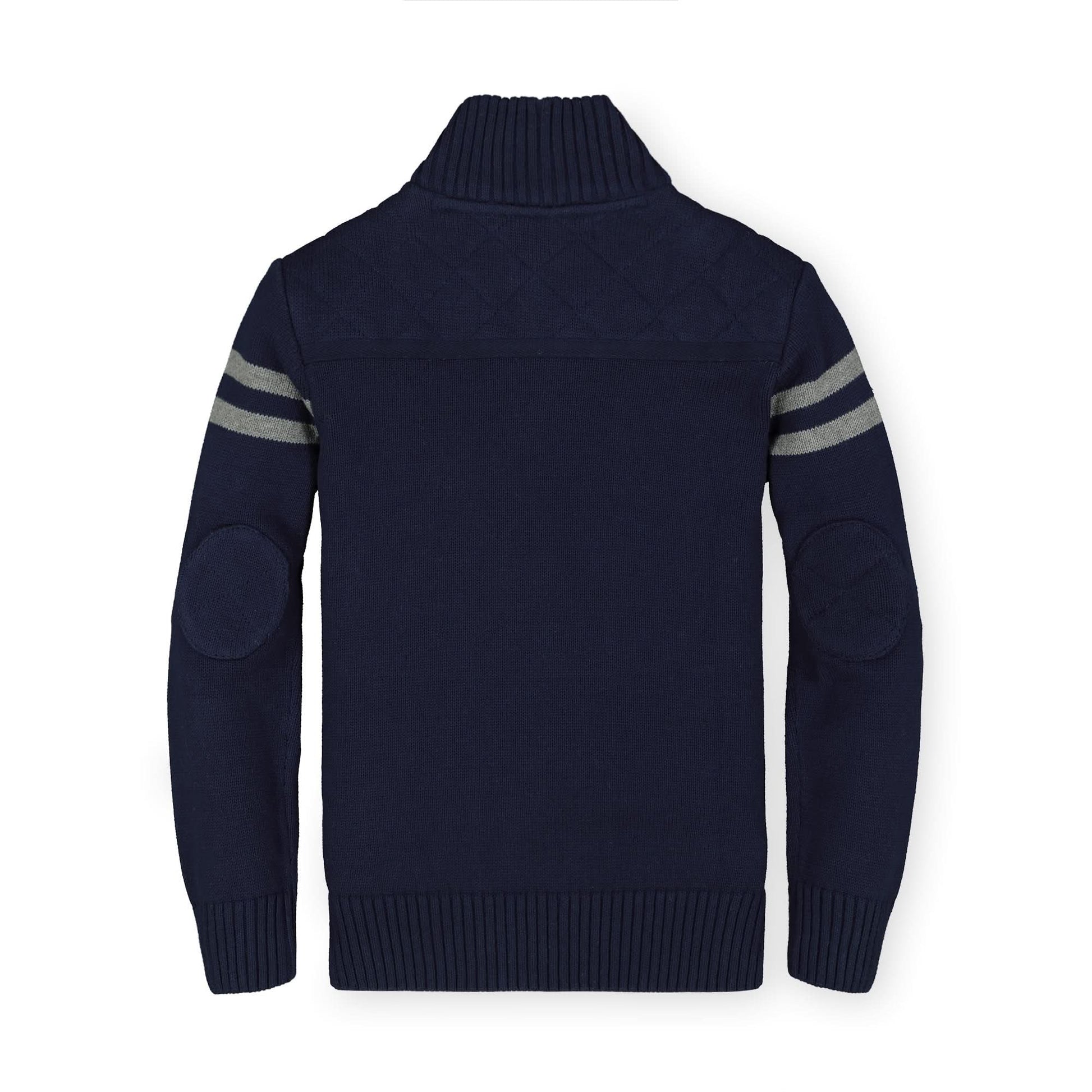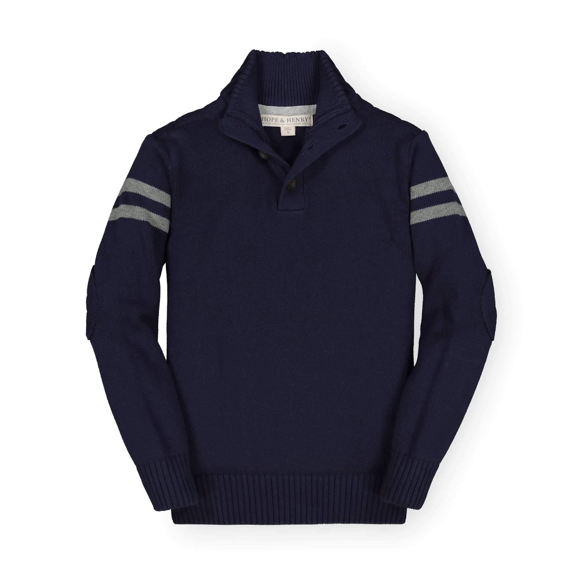 This stylish mock neck pullover in soft organic cotton will be a staple in your boy's cool weather wardrobe. Features sporty sleeve stripes, tonal elbow patches, rib trim, and a cool button placket.