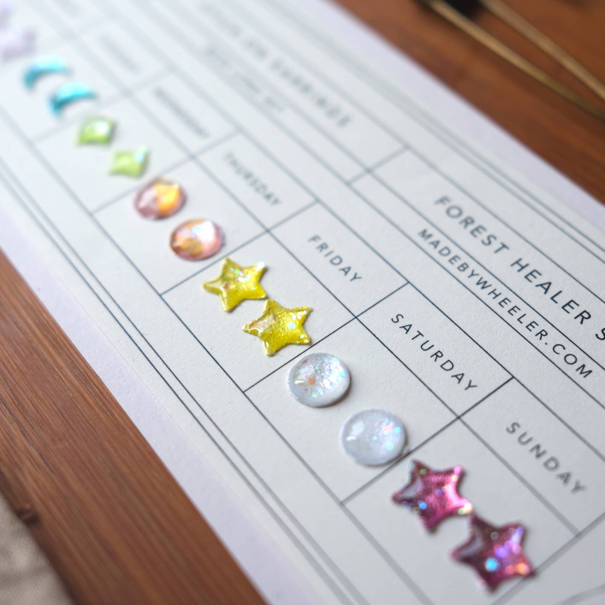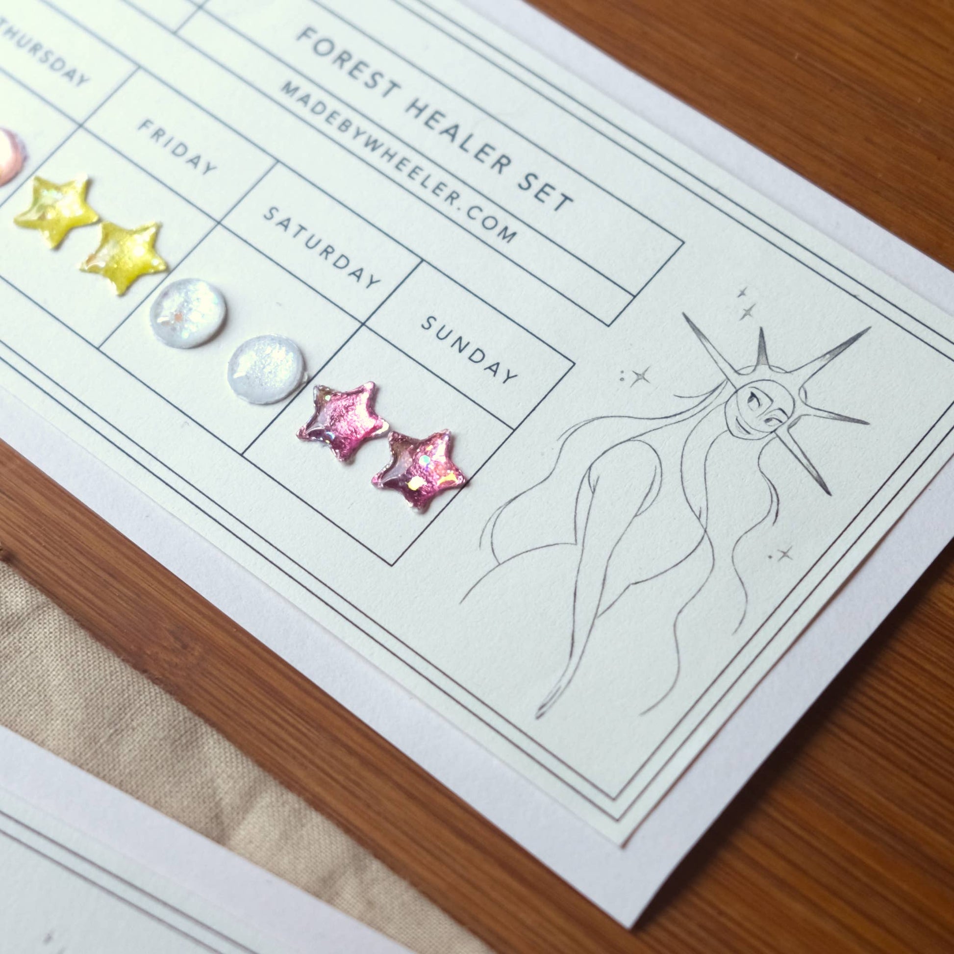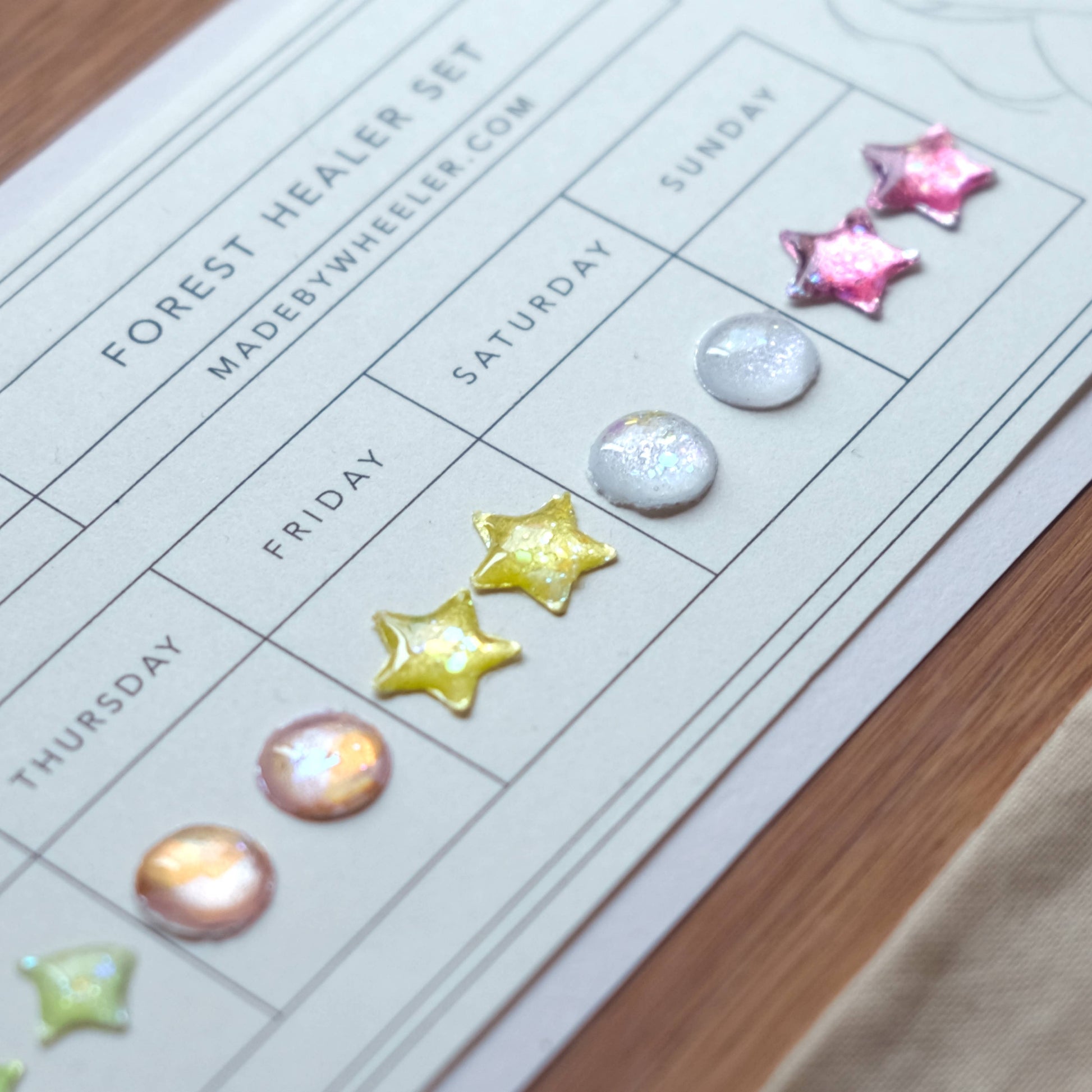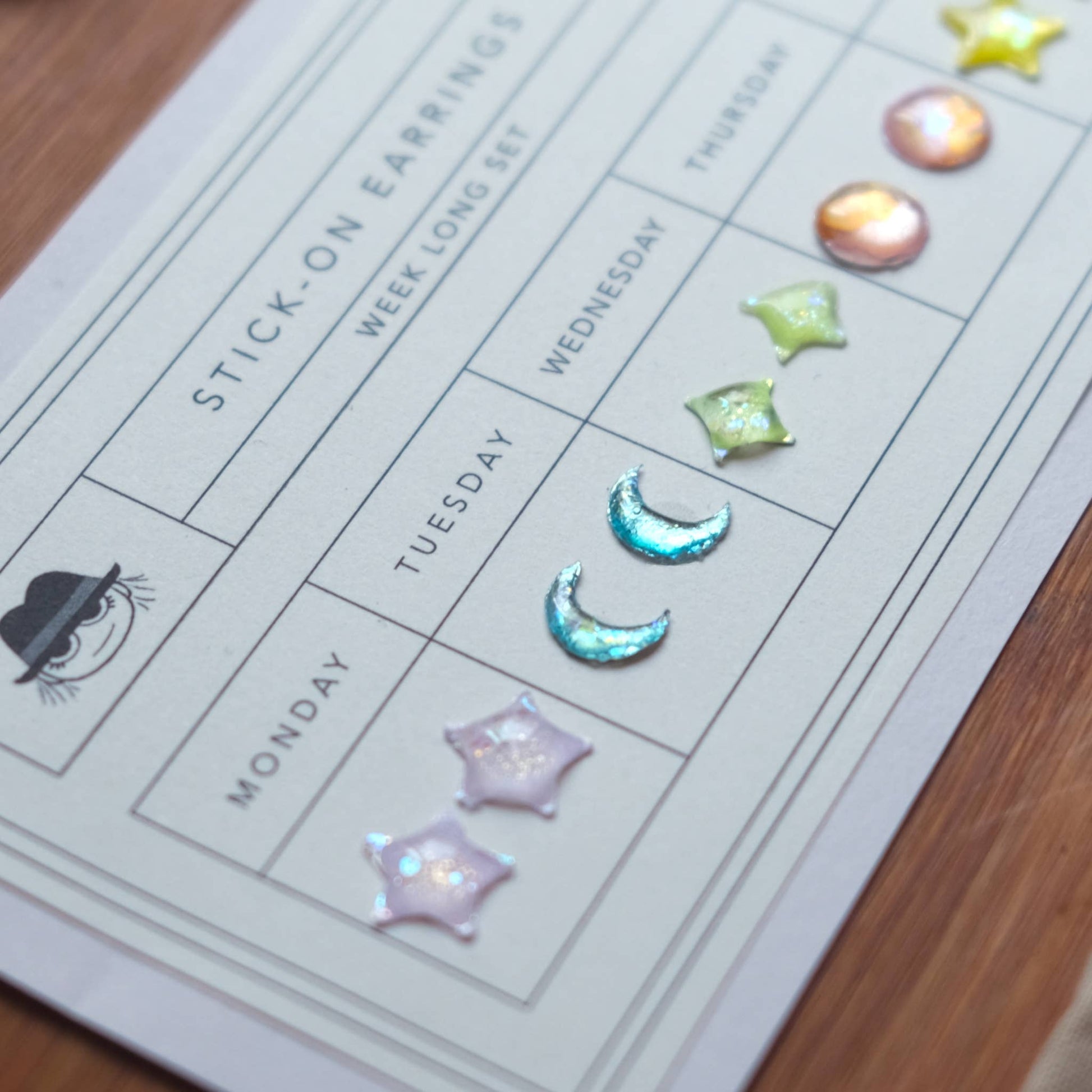A flash back to the past, this Mother of Dreams Stick-On Earring set features a new color for each day of the week! Earrings are metallic-holographic and shimmer in the light. Just peel and stick! Each stay on up to 24 hours. Since each item is handmade, please allow slight differences between orders. Items are all handmade in the USA by Made by Wheeler.