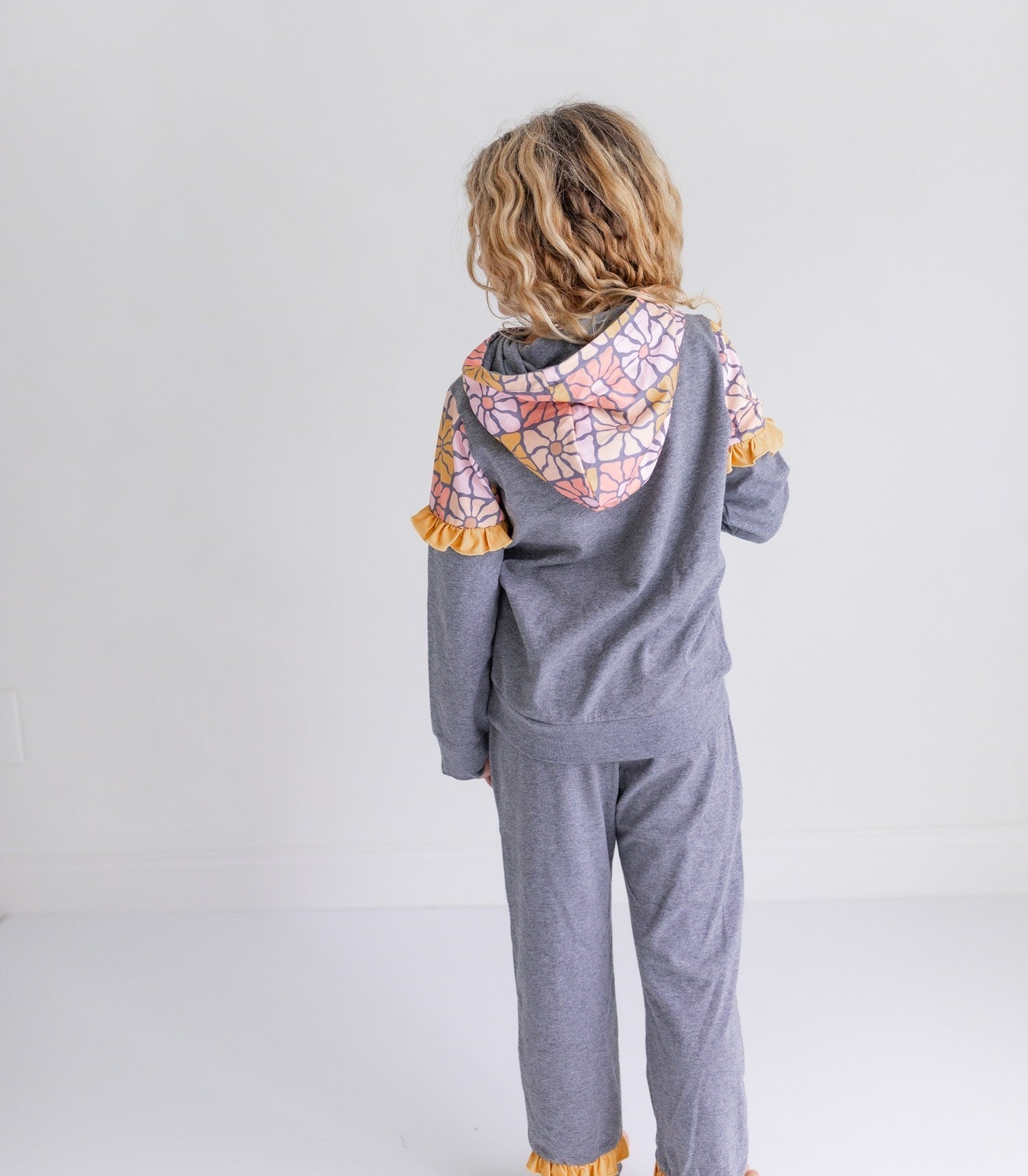Girls two piece set includes Gray, Mustard & Pink floral print ruffle hooded top with mustard ruffle trim. Gray sweat pant lounge pants with mustard ruffle trim. A great outfit for back to school and the Perfect loungewear for snuggly Fall and Winter Days!
