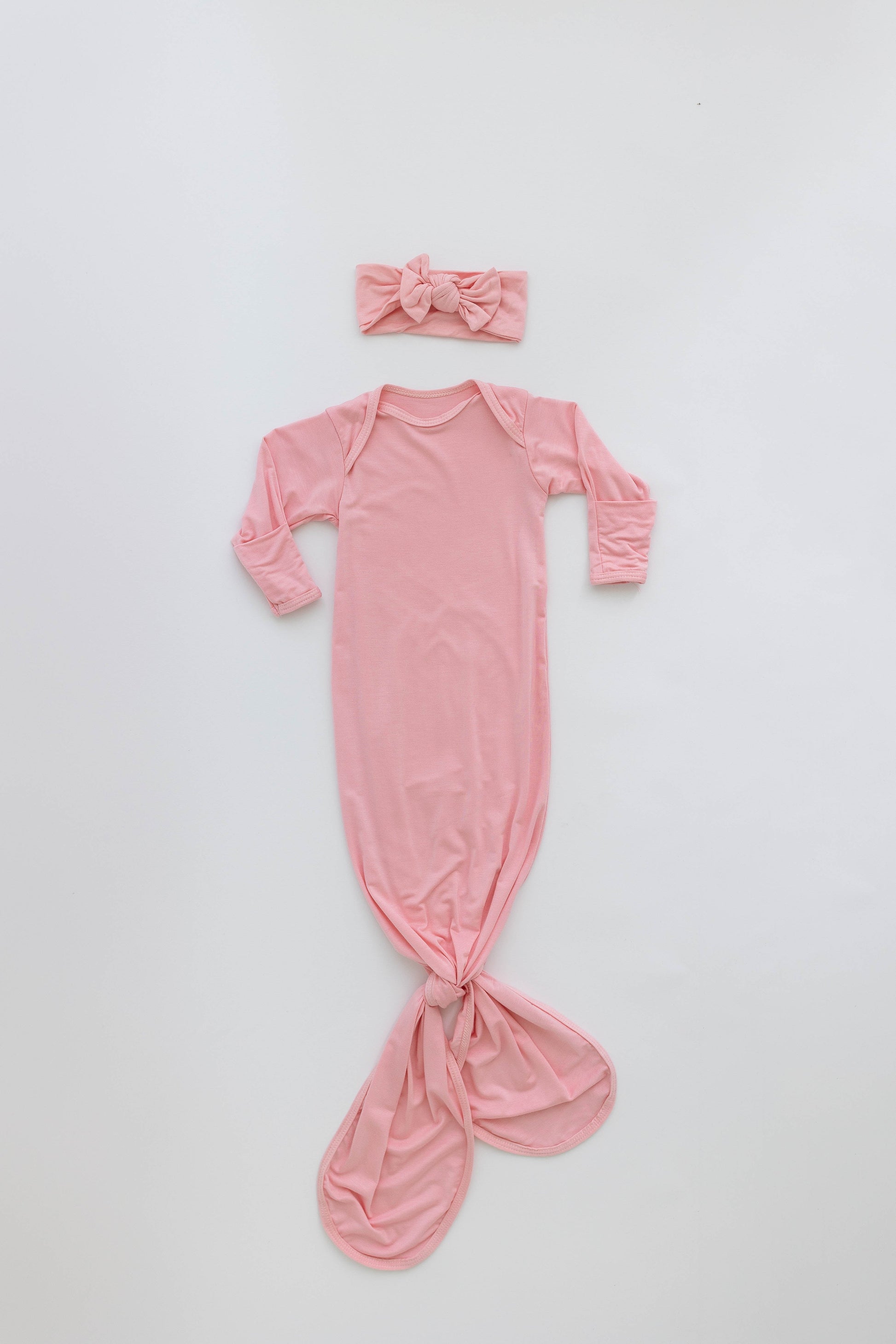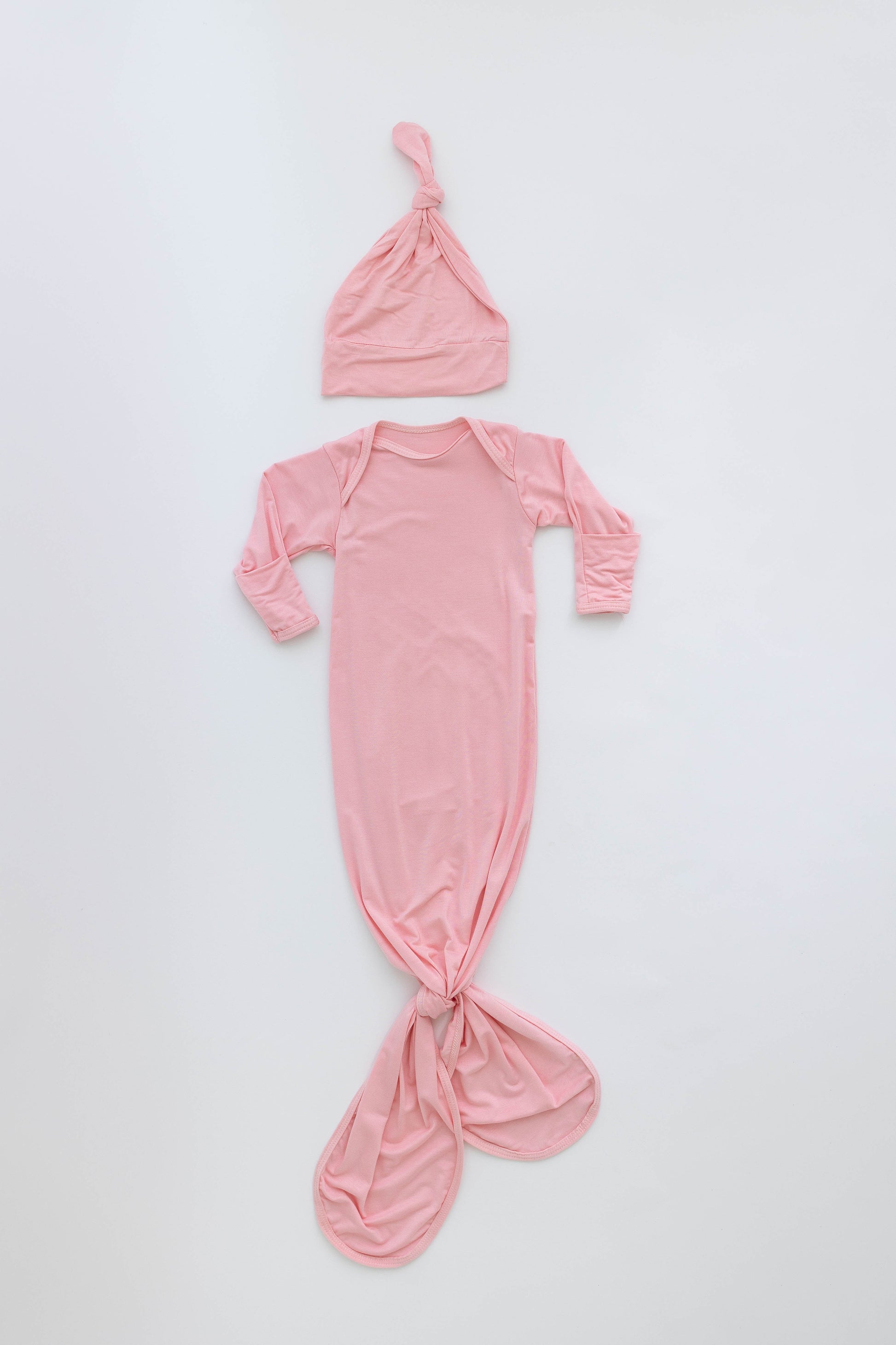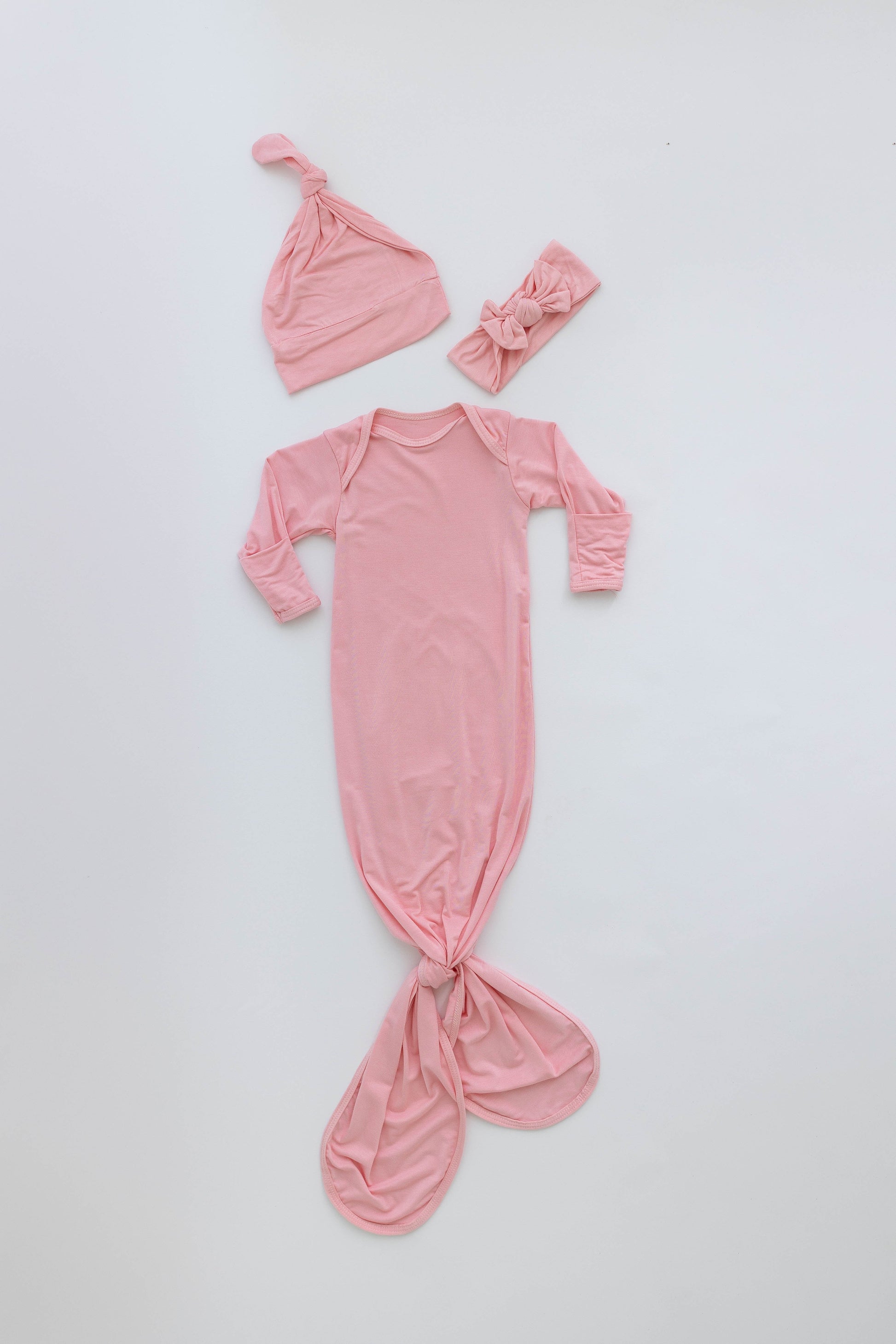Our Newborn Knotted Baby Gown and Hat Sets are made of a buttery soft Rayon/Spandex blend. The ultra-soft baby gown features built-in no-scratch mittens to protect your baby’s delicate face from fingernail scratches. The crew neck style allows you to easily pull the gown over your baby’s head and the knotted bottom of the gown makes diaper changes super easy! This set is ideal for ages newborn to 3 months old.