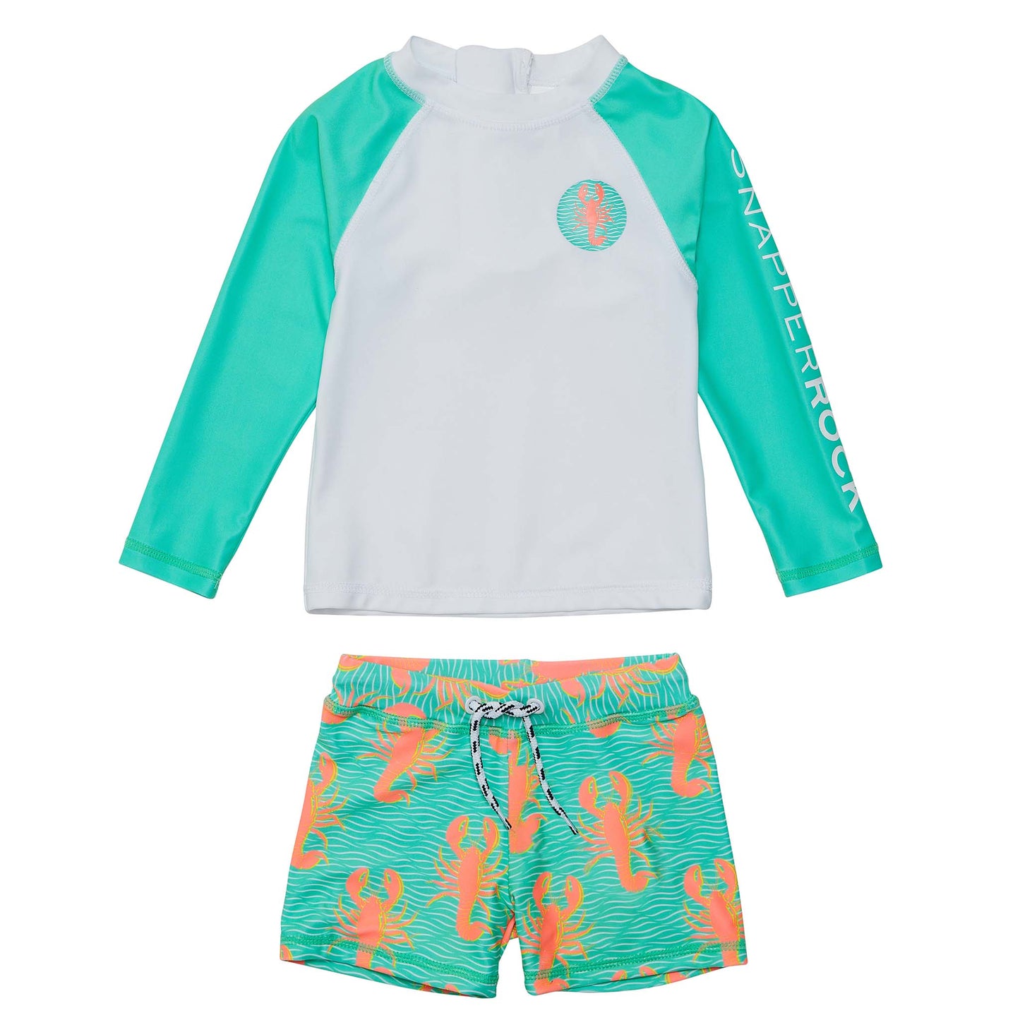 Gear up for aquatic adventures with this sun-protective rash guard top and shorts. The set features a crisp white rash top with mint sleeves and a seamless white zip, paired with lobster print swim shorts equipped with a navy and white fleck drawcord. This ensemble is perfect for active beach days.