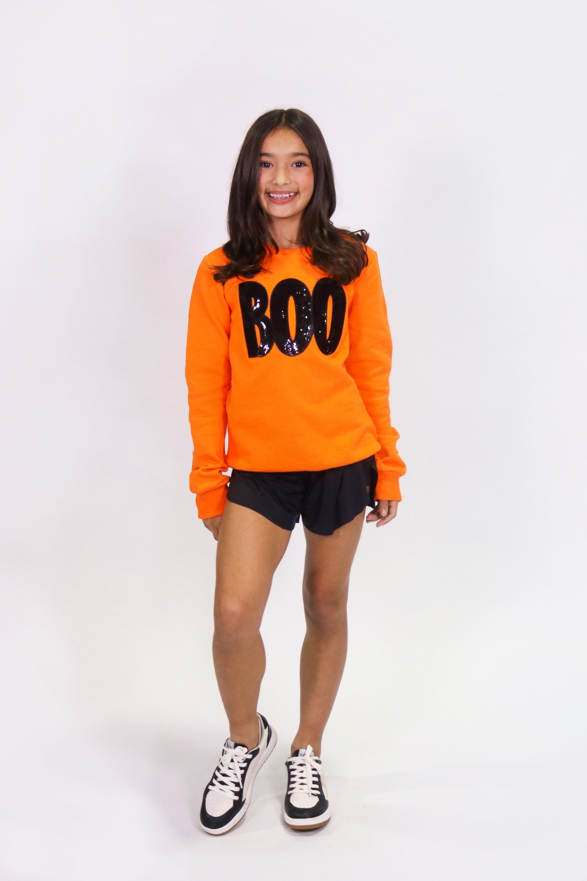 Get cozy this Halloween with the Orange Boo Sweatshirt! Featuring playful black sequin details that add a spooky sparkle, this comfy sweatshirt is perfect for festive nights and casual days alike. Embrace the spirit of the season while staying warm and stylish in this fun, eye-catching piece.