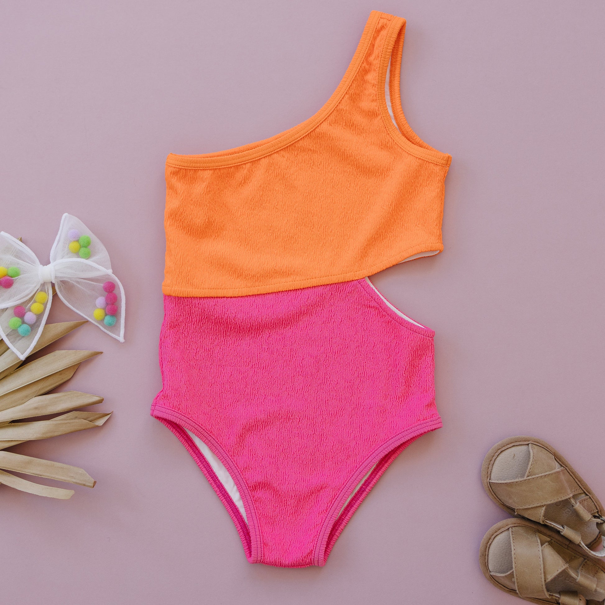 This super cute cutout swim suit is perfect for summer. The BRIGHT color and fun cutout is just what you need to see your child in and out of water!