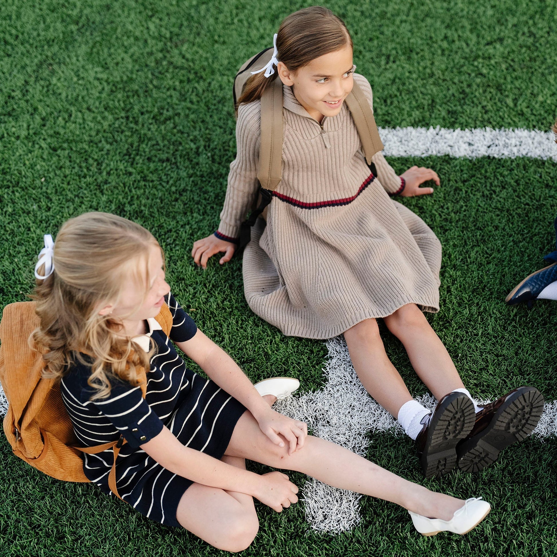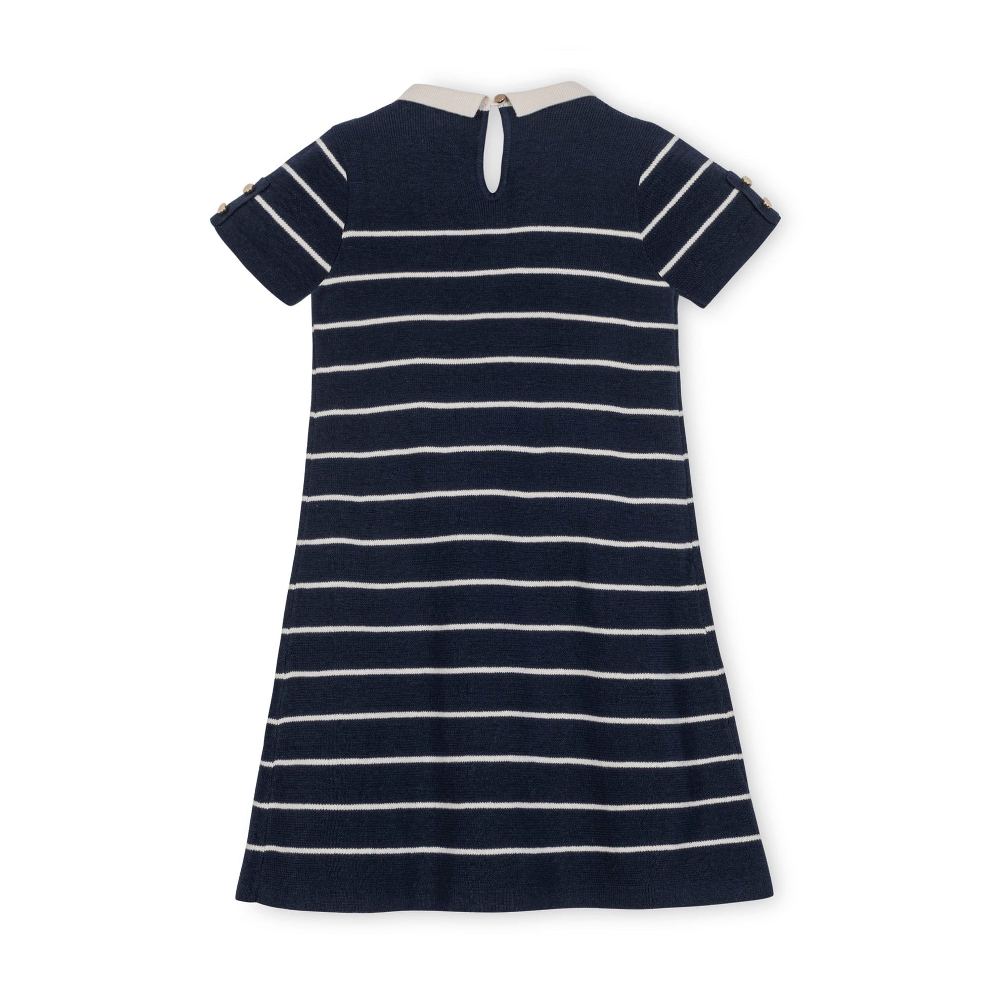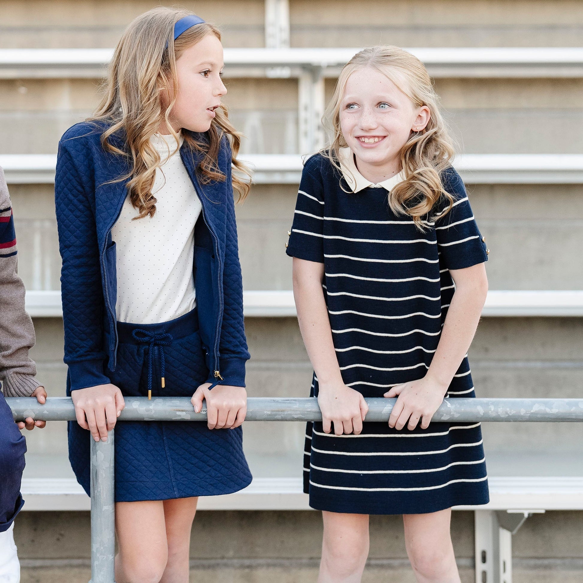 The perfect transitional fall dress for when school is back in session and the days can waver between warm to cool. Crafted from soft organic cotton in a beautiful full-bodied milano stitch. A knit peter pan collar and gold buttons at the back neck closure and cuffs add the finishing touch.