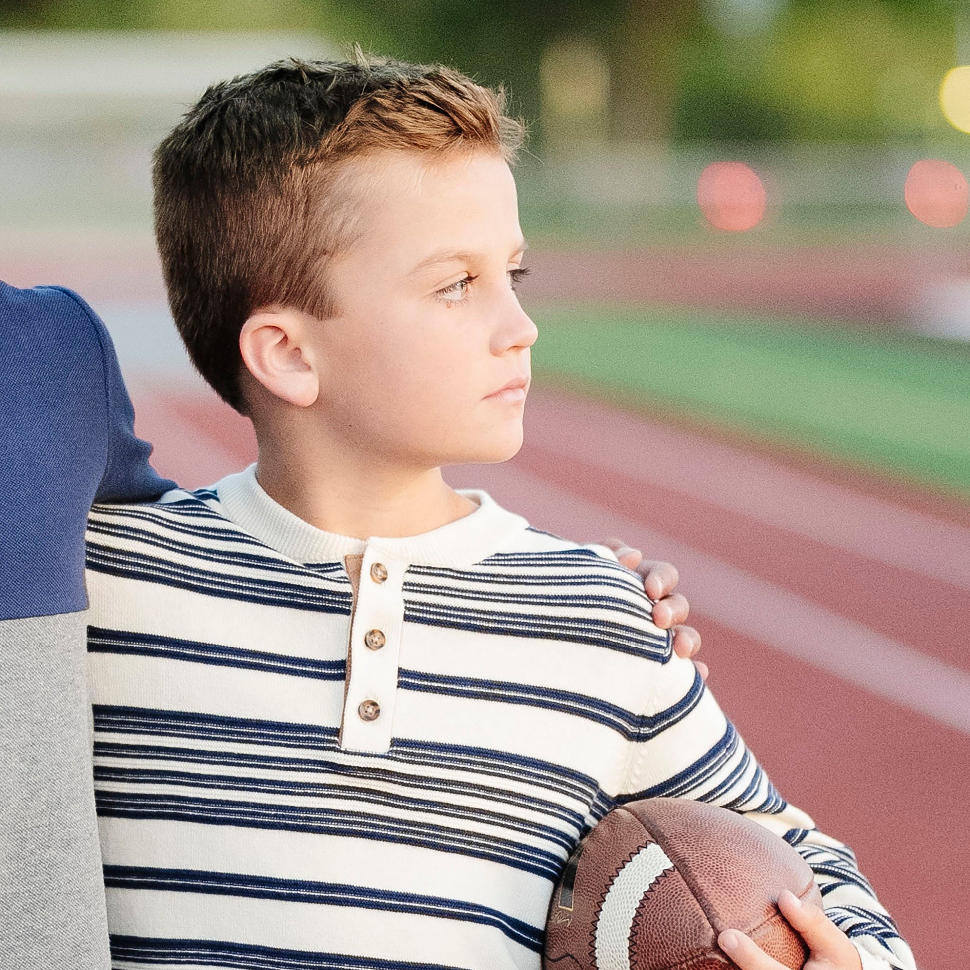 - Henley button placket. Faux suede elbow patches.