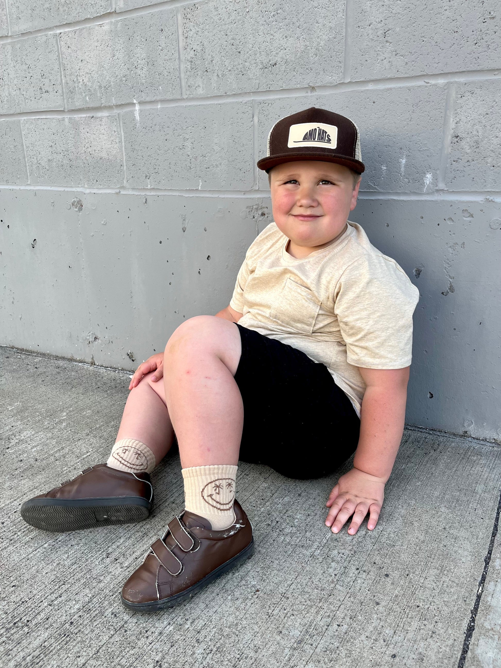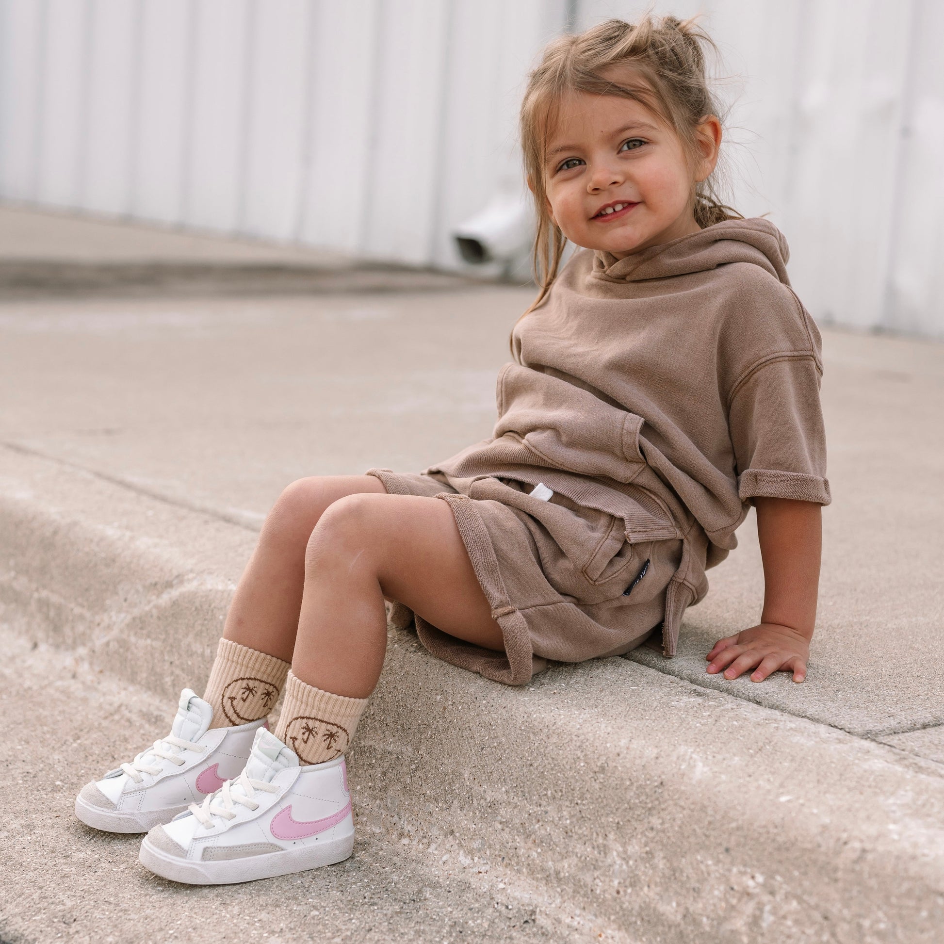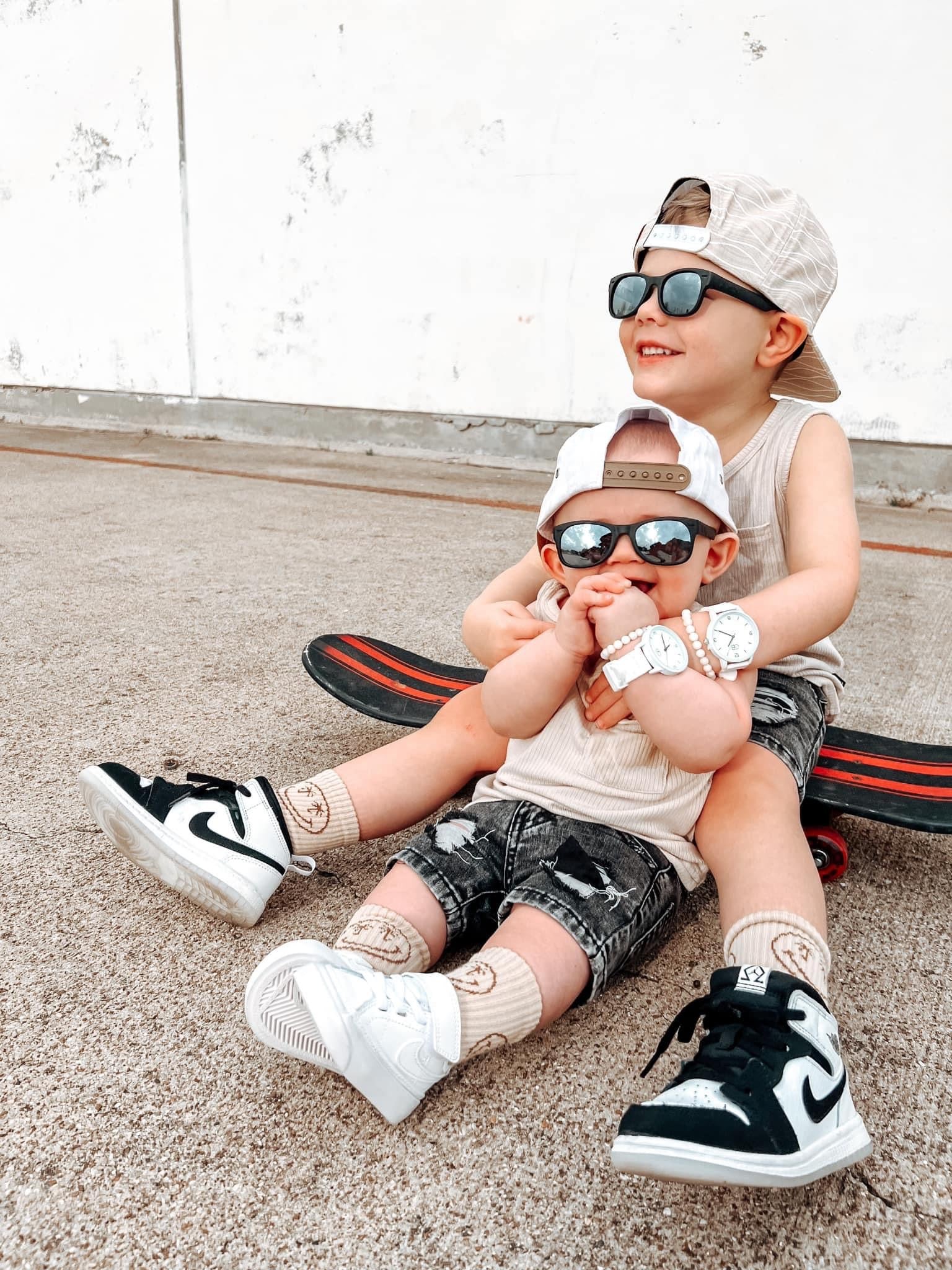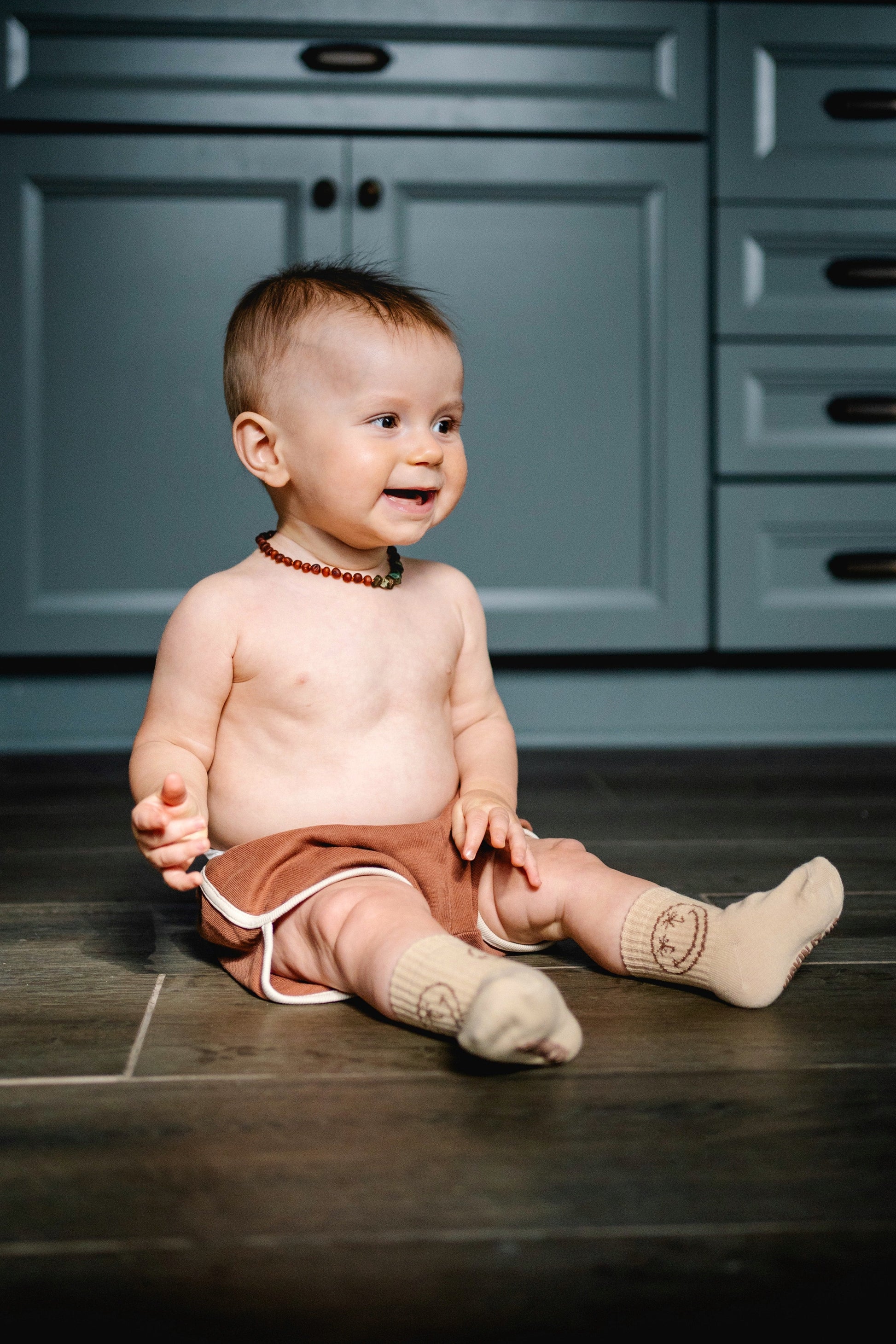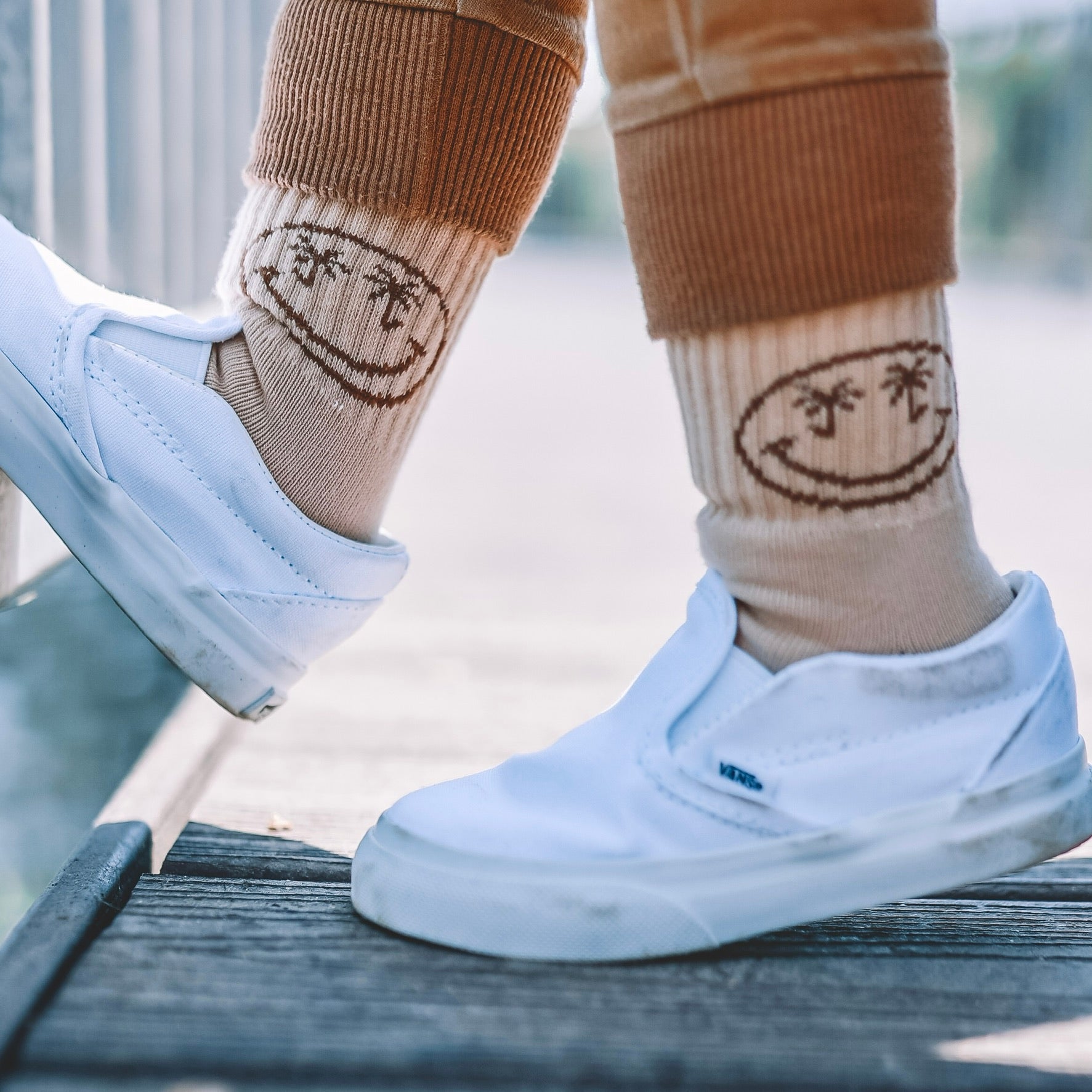 Sizes Infant/XXS, Extra Small, Small + Medium have logo grips on the bottom of the feet and size large have a stitched logo on the bottom of the feet.