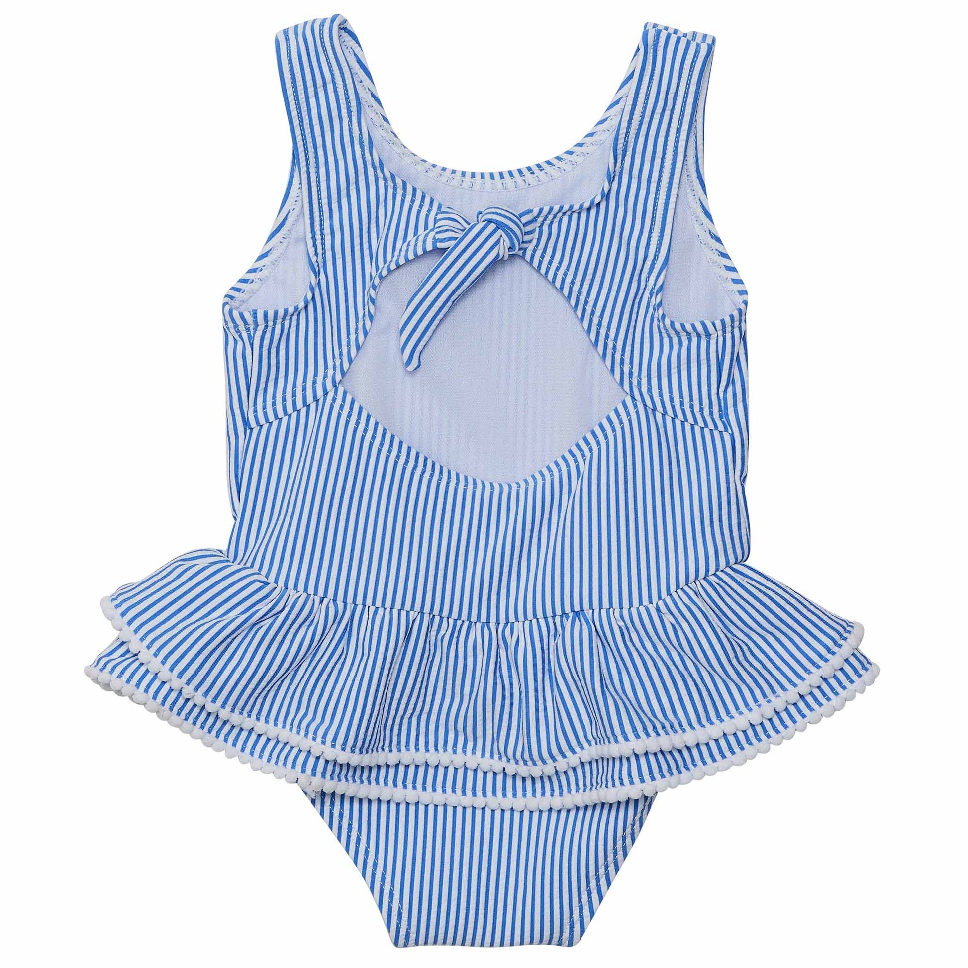 Bring a touch of Parisian charm to the beach with this skirted swimsuit, designed in blue and white seersucker stripes. The double-layered frill skirt is accented with white mini pompoms, and the airy open back with a bow detail adds a cute flair perfect for stylish seaside play.