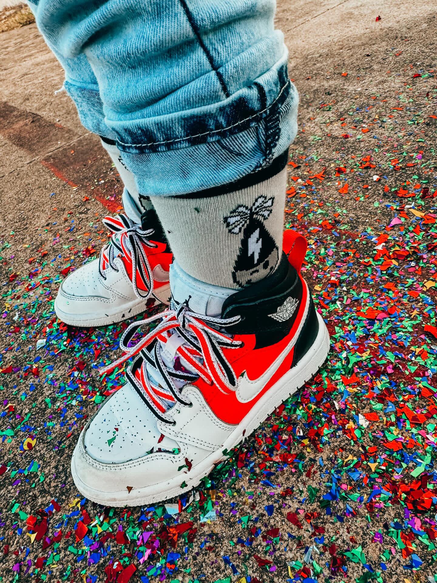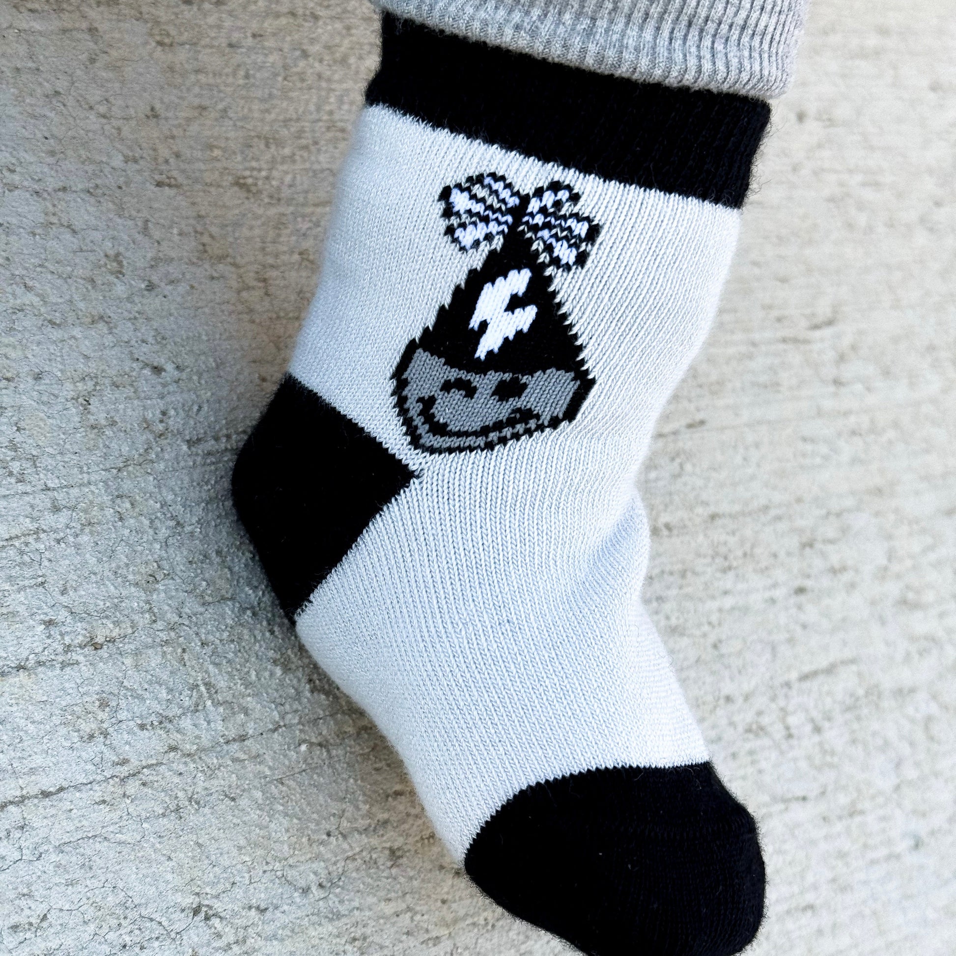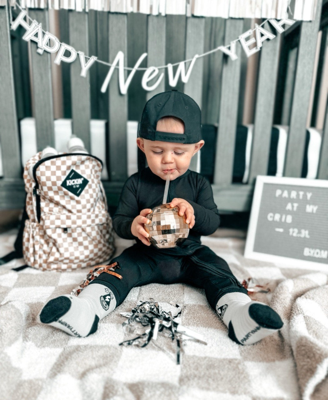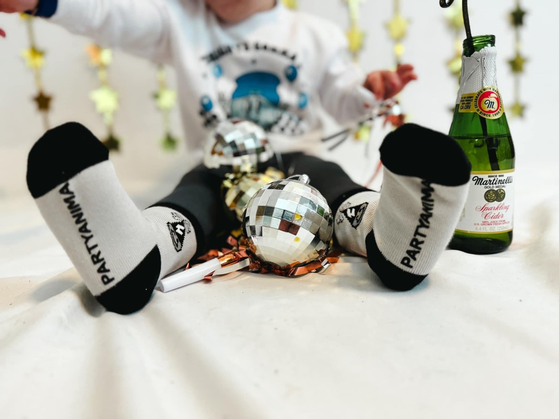 Sizes Infant/XXS, Extra Small, Small + Medium have "Party Animal" grips on the bottom of the feet and size large have a stitched "Party Animal" on the bottom of the feet.