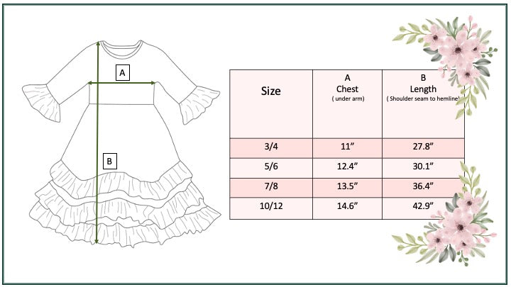 Girls peach, rust, blue, and sage floral print long sleeve dress with triple ruffle hem detail. Fabric is very soft and comfy with lots of stretch. Perfect for Fall & Winter!