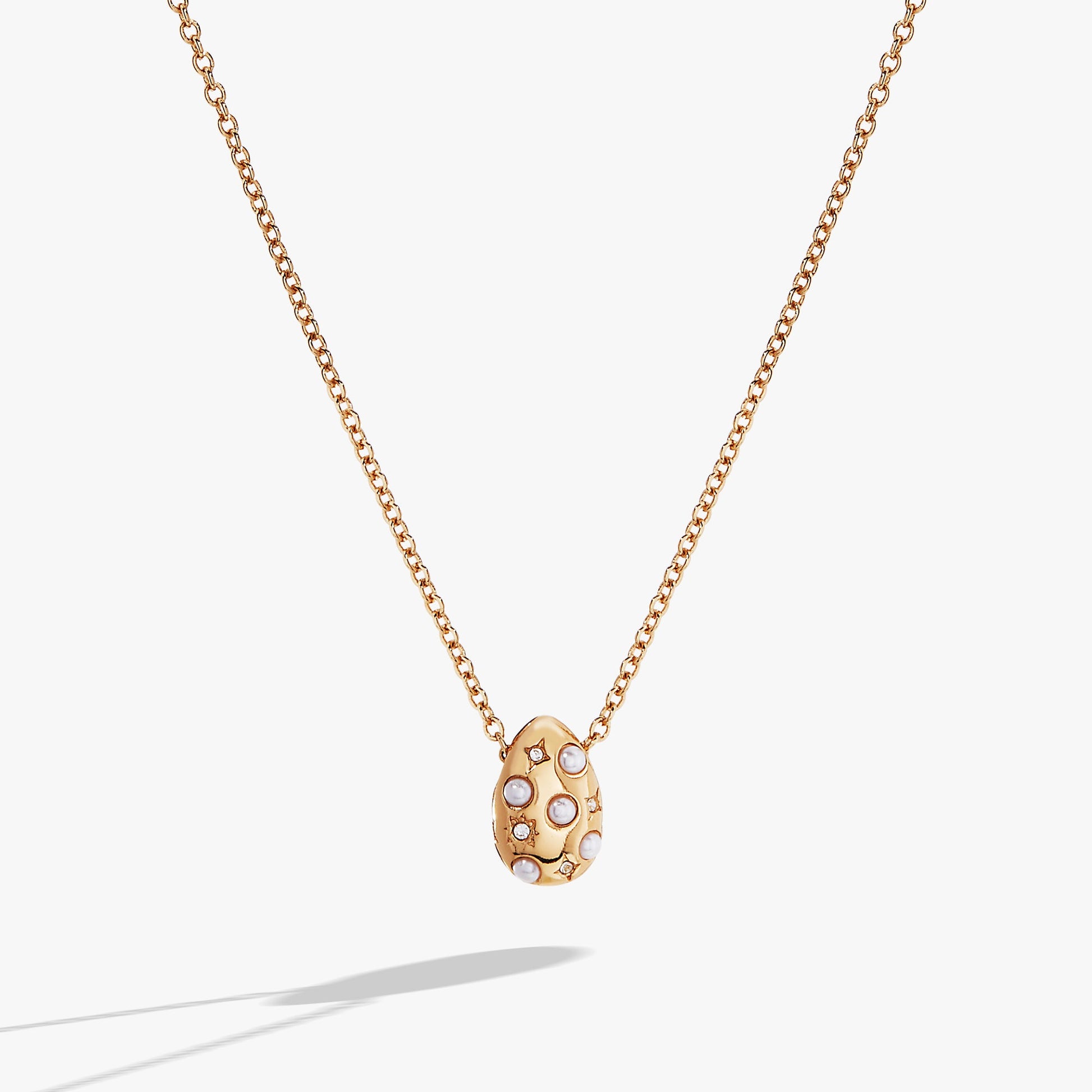 Add a luminous touch to any look with this Pearl and Crystal Pendant Necklace. This charm necklace features a pendant with pearl and clear crystals and an etched starburst pattern on an adjustable-length chain. Wear it for an unmatched glow.