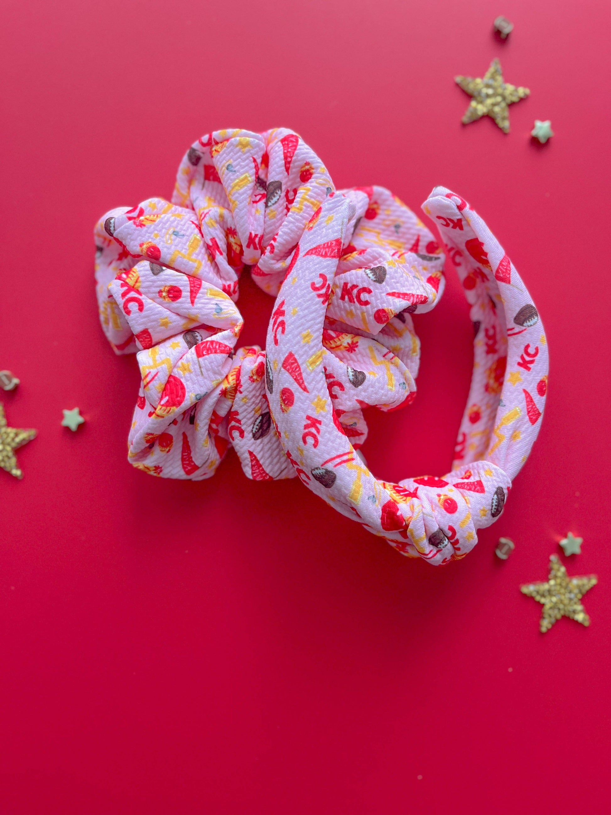 Scrunchies: Complete your game day look with our oversized scrunchies, designed for Kansas City Chiefs fans! Made from soft bullet fabric, these scrunchies feature the Evie Pearl Handmade logo and are perfect for girls, teens, and women. Whether you're heading to a Red Friday event, a tailgate party, or cheering on the Chiefs, these scrunchies offer both comfort and style. Their oversized design adds a bold touch to any outfit, making them a must-have accessory for showing off your team spirit. Shop now and elevate your game day hair!