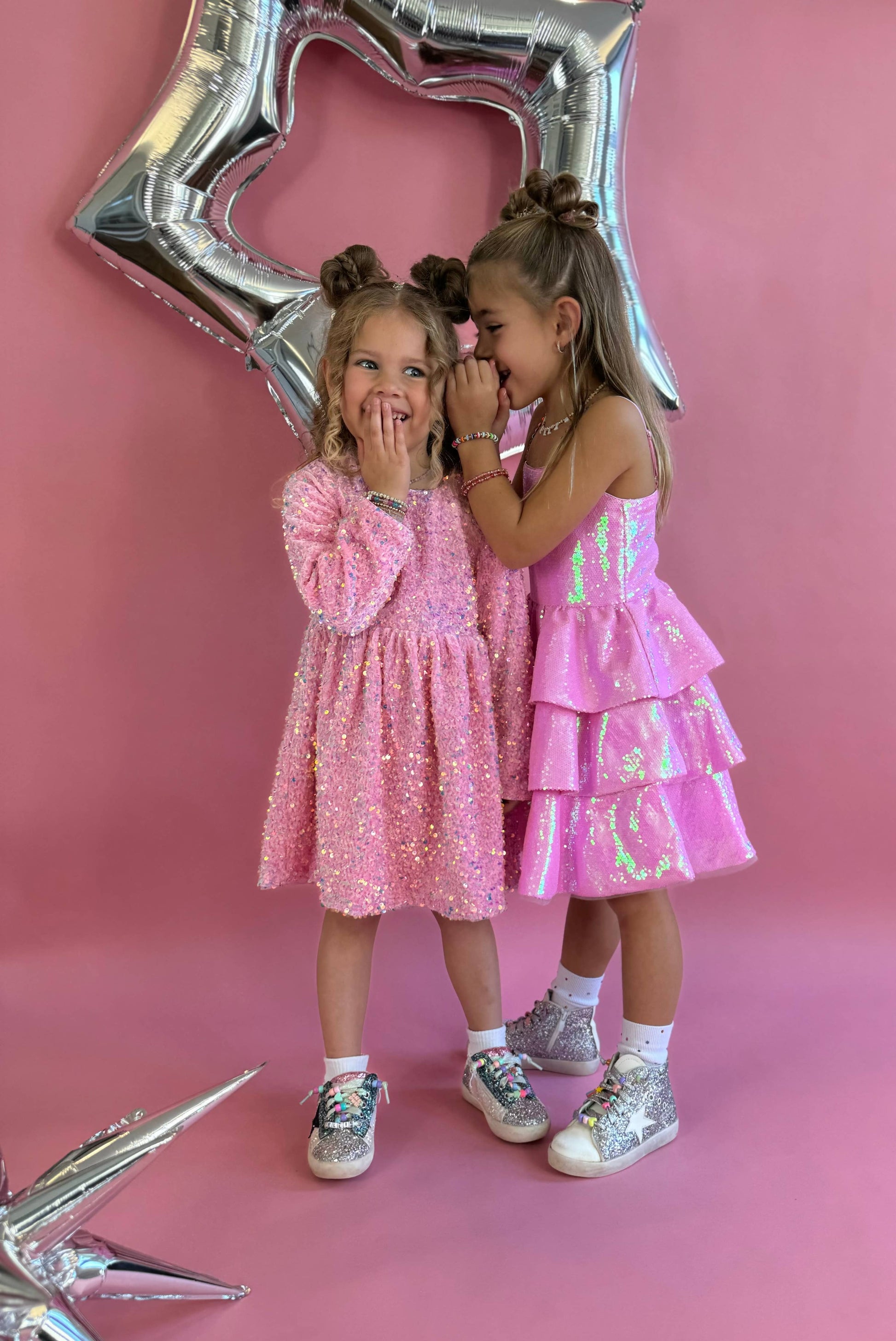 This pink sequin dress is adorned with sewn on gems on the adustable strap. Lining is a satin polyester. ✨