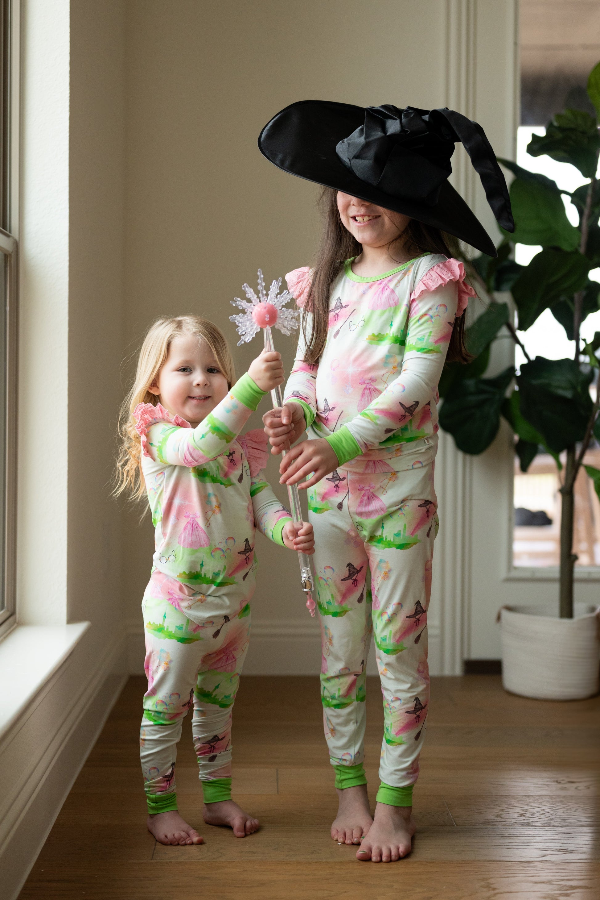 “We can’t all come and go by bubble,” but your little girl can feel like a good witch in our pink and green collection inspired by Wicked. It features a whimsical pattern consisting of Elphaba’s glasses and infamous witch hat, G(a)linda-esque bubbles and, of course, the Emerald City itself!