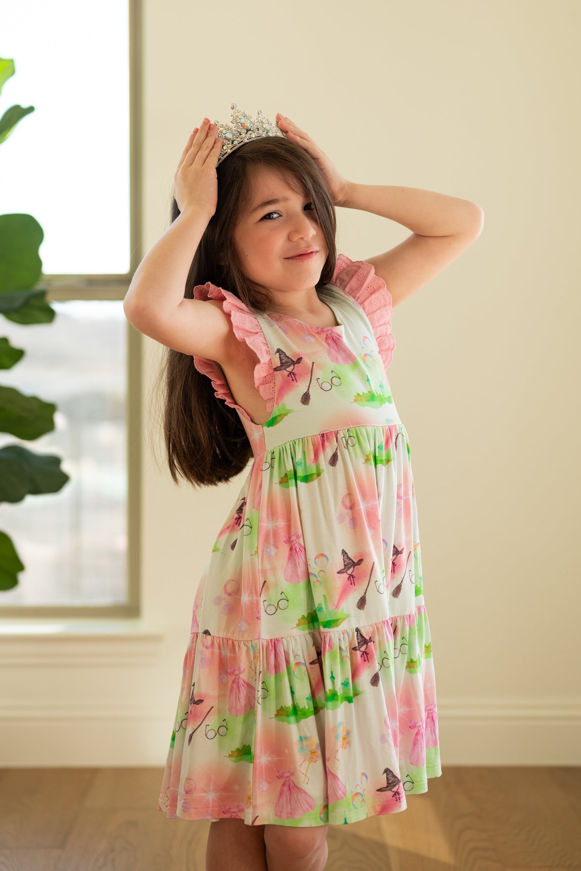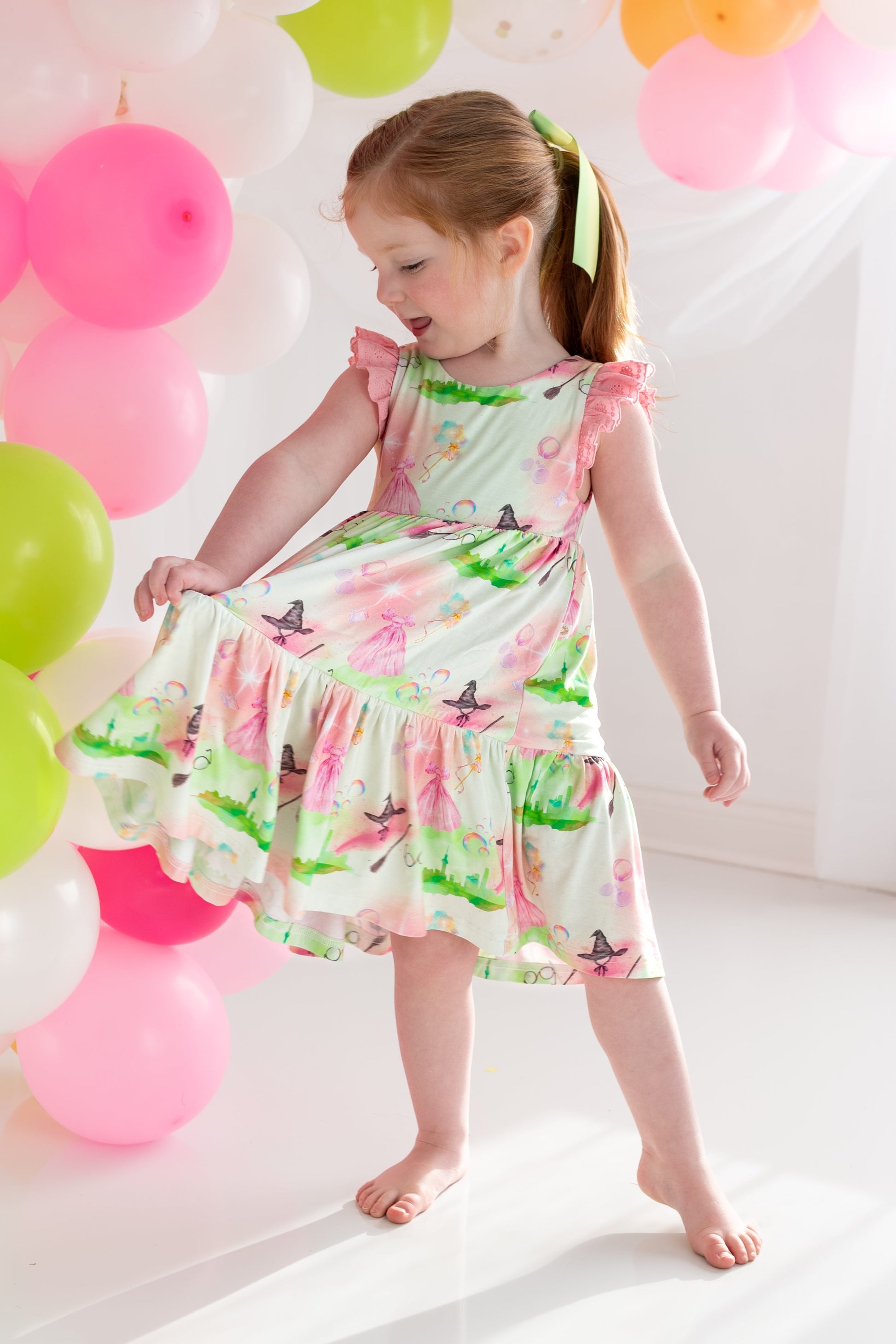 “We can’t all come and go by bubble,” but your little girl can feel like a good witch in our pink and green collection inspired by Wicked. It features a whimsical pattern consisting of Elphaba’s glasses and infamous witch hat, G(a)linda-esque bubbles and, of course, the Emerald City itself!