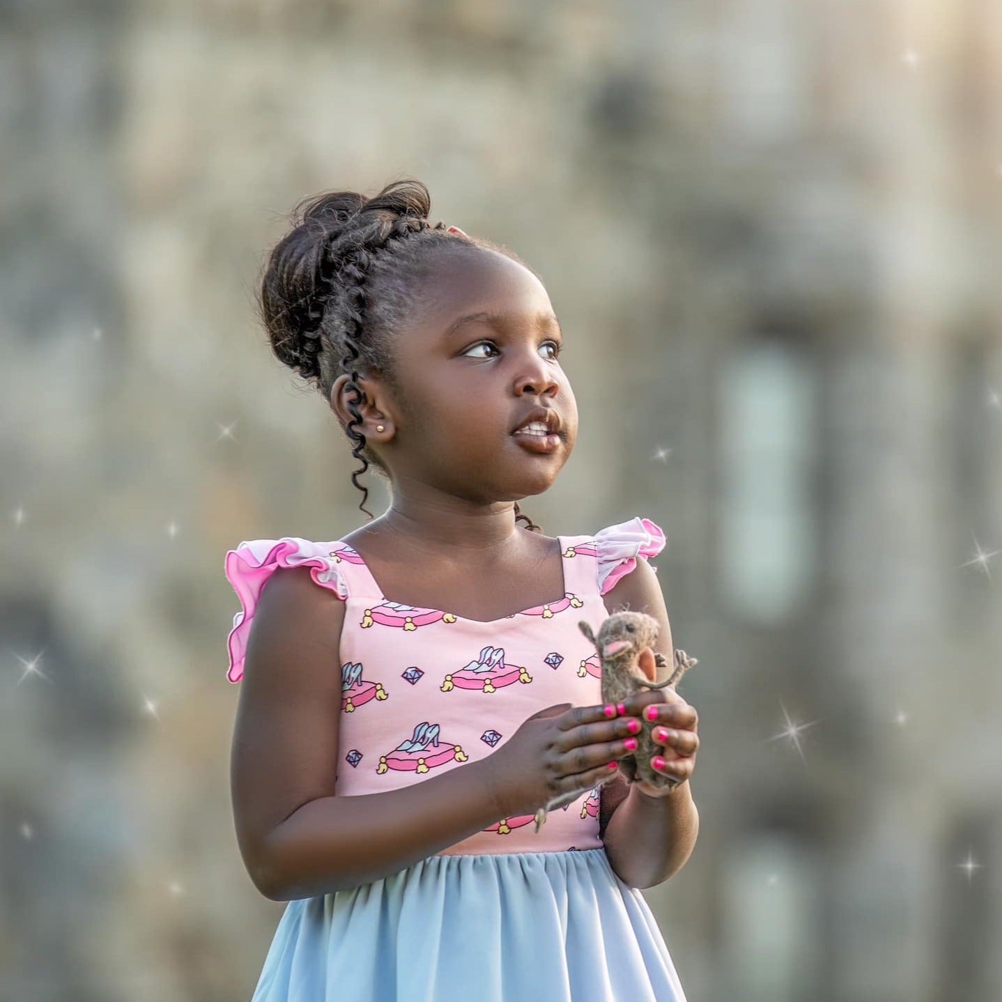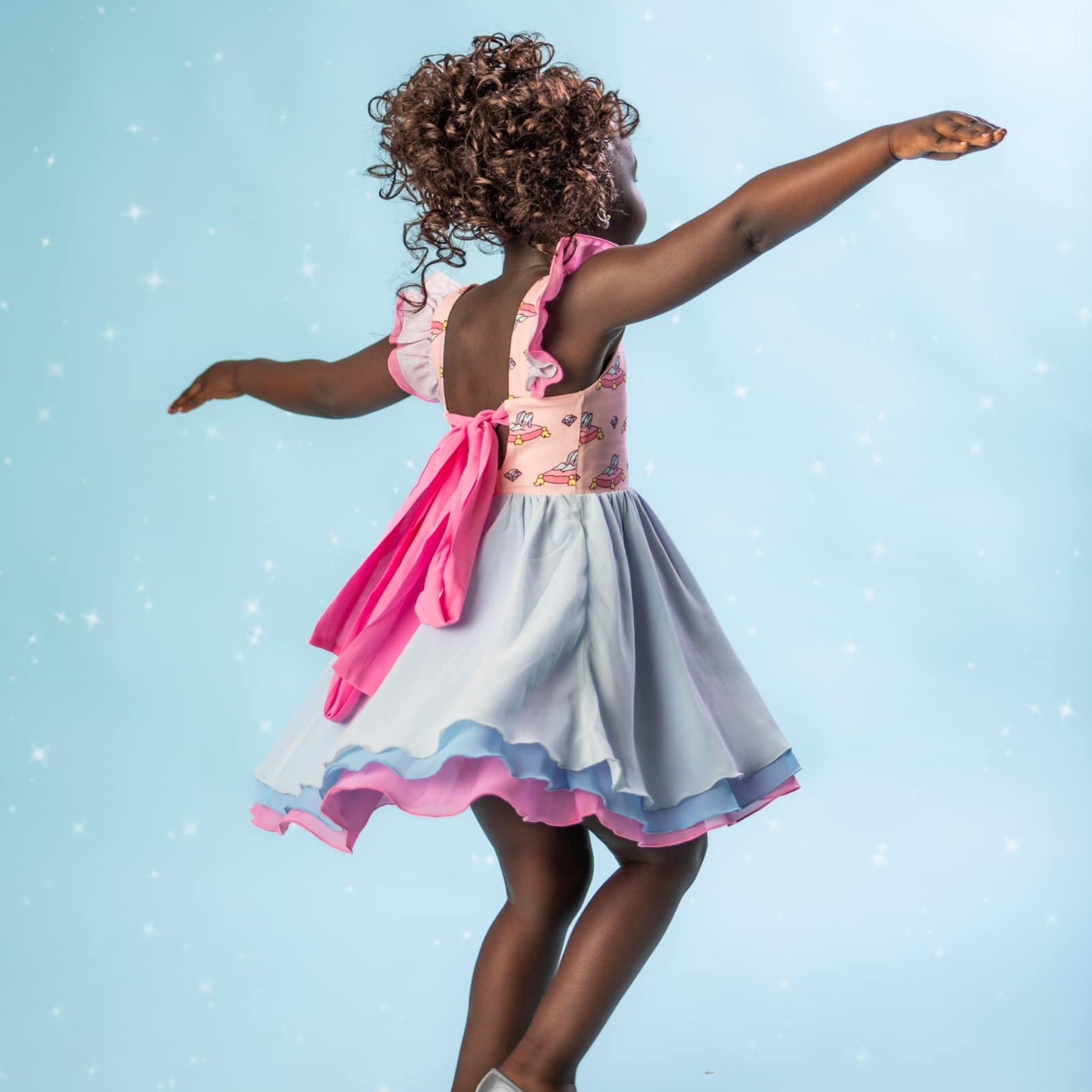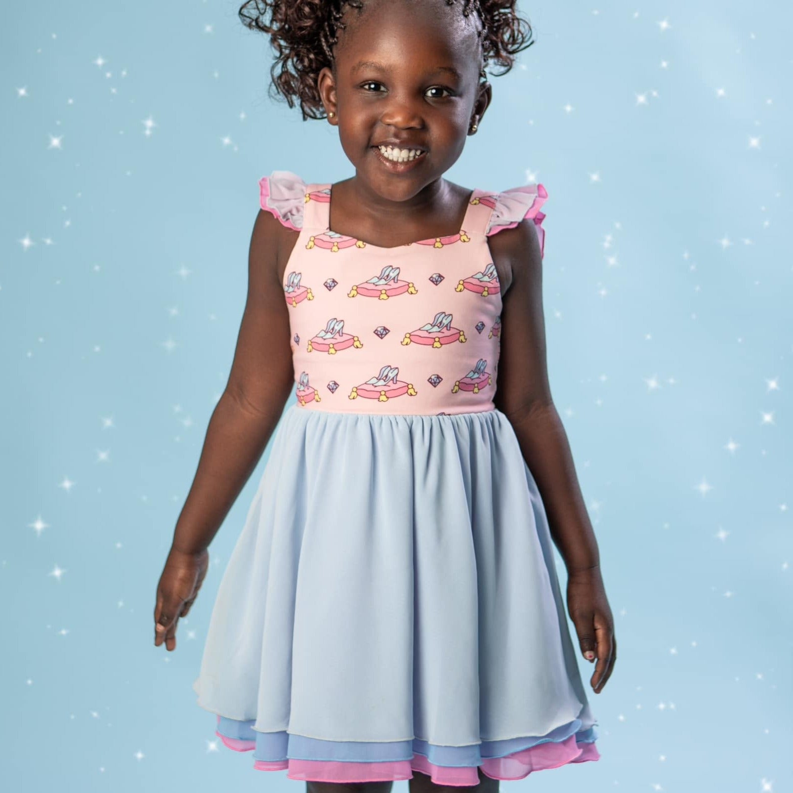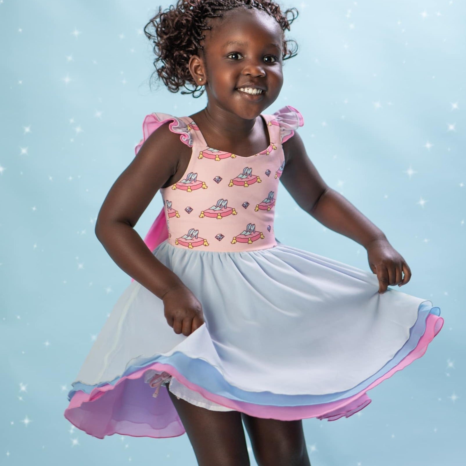 Cinderella inspired Princess twirl, with crystal shoes print on the chest and layers of blue and pink chiffon.