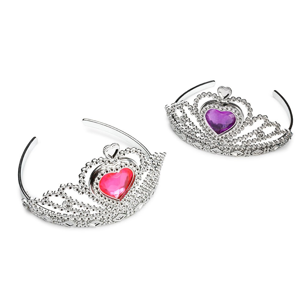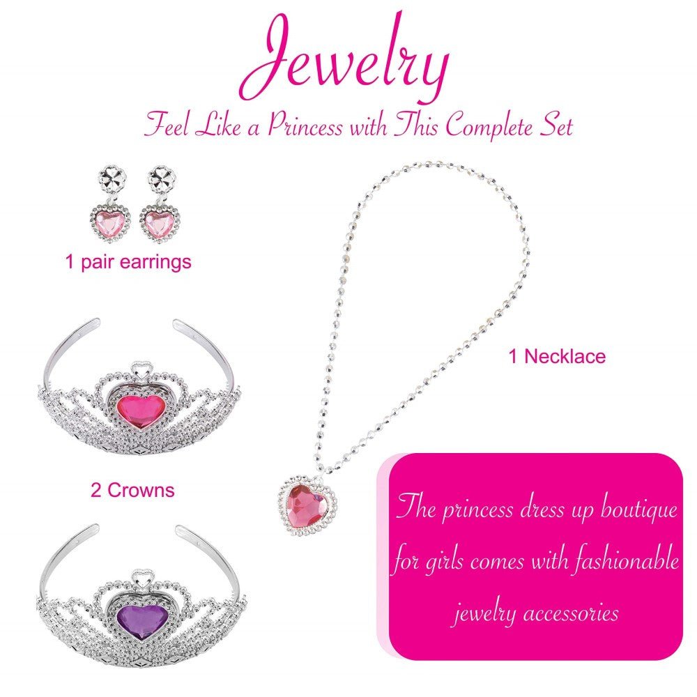 WHEN A LITTLE GIRL DREAMS IT SURELY TAKES PLACE IN HER FAIRY TALE CASTLE. With this set, she will prance around in true princess attire and will admire herself all day! Choice of 3 different slippers and 2 matching tiaras with a necklace and earrings all ready for the ball! This is a great gift for any little girl whom you want to make smile.