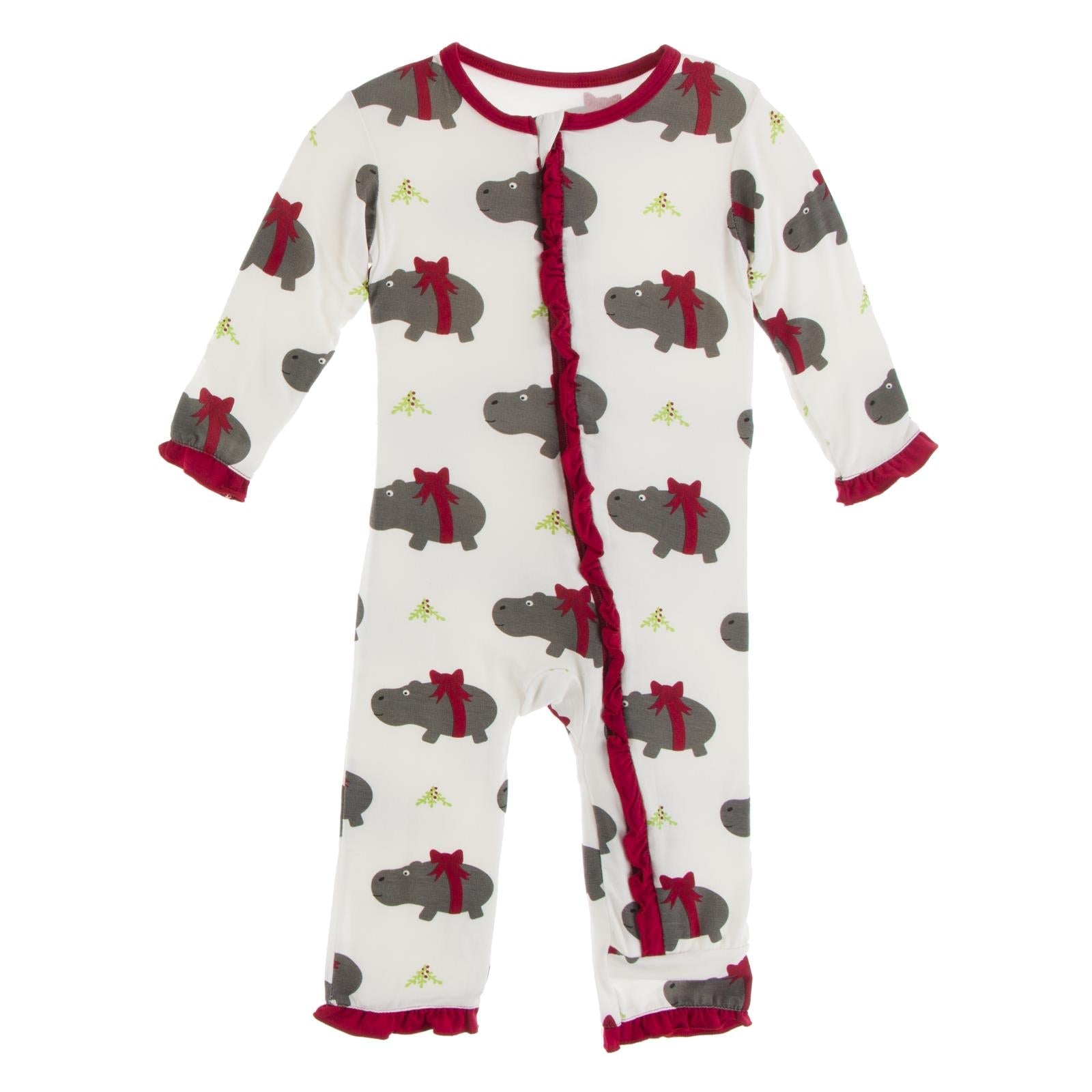 Print Layette Ruffle Coverall with Zipper in Natural Christmas Hippo