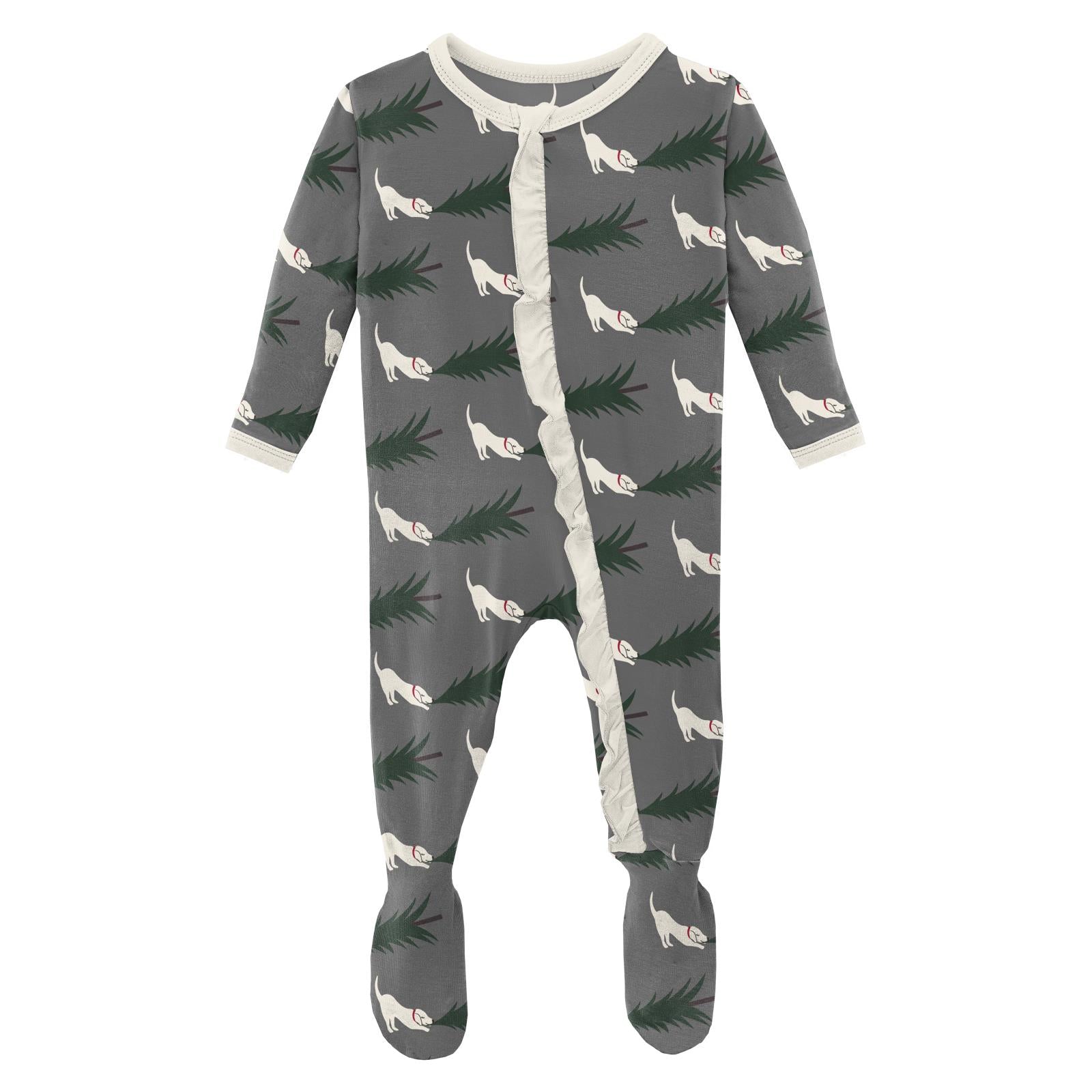 Print Layette Ruffle Footie with Zipper in Pewter Christmas Tree Drag