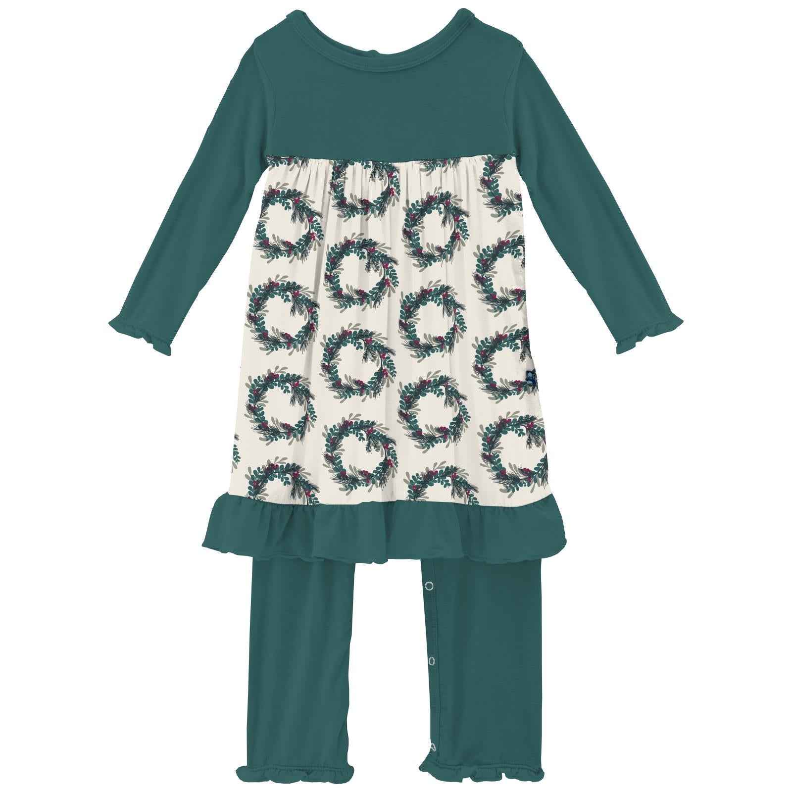 Print Long Sleeve Dress Romper in Natural Holiday Wreath