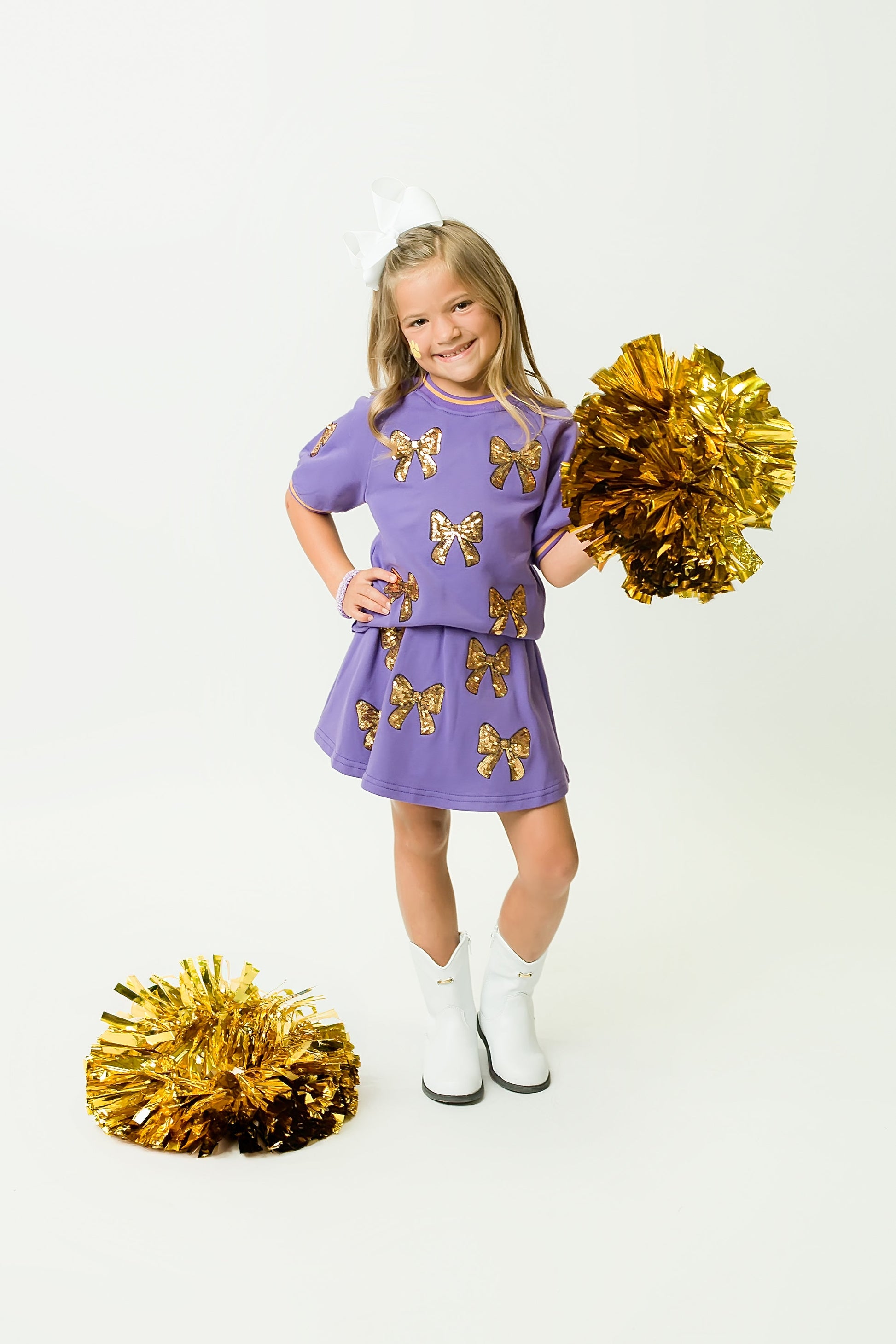 Add a fun twist to any outfit with the playful Purple and Gold Bows Skort! Featuring charming bow details and vibrant colors, this skort combines the ease of shorts with the flirty flair of a skirt. Comfortable and cute, it’s perfect for twirling, running, and shining all day long!