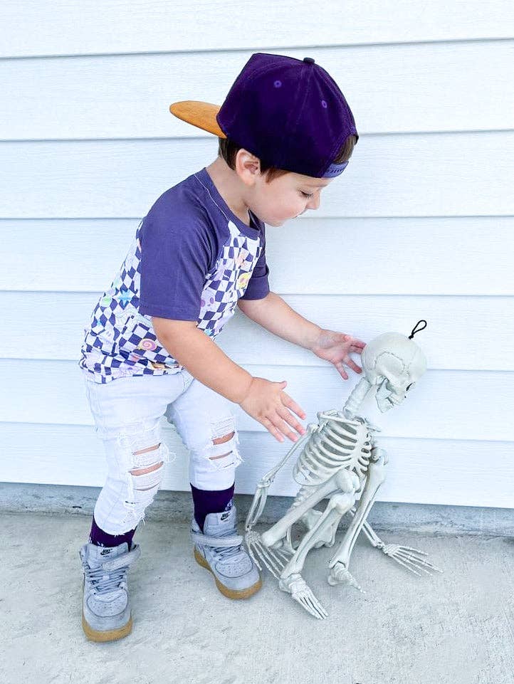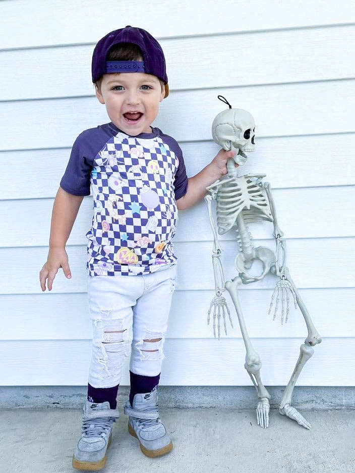 Experience the magic of the spooky season with our Creep It Real - Raglan Tee. The trendy checker print in solid purple and gray is accented with festive Halloween details for a fun and stylish look!