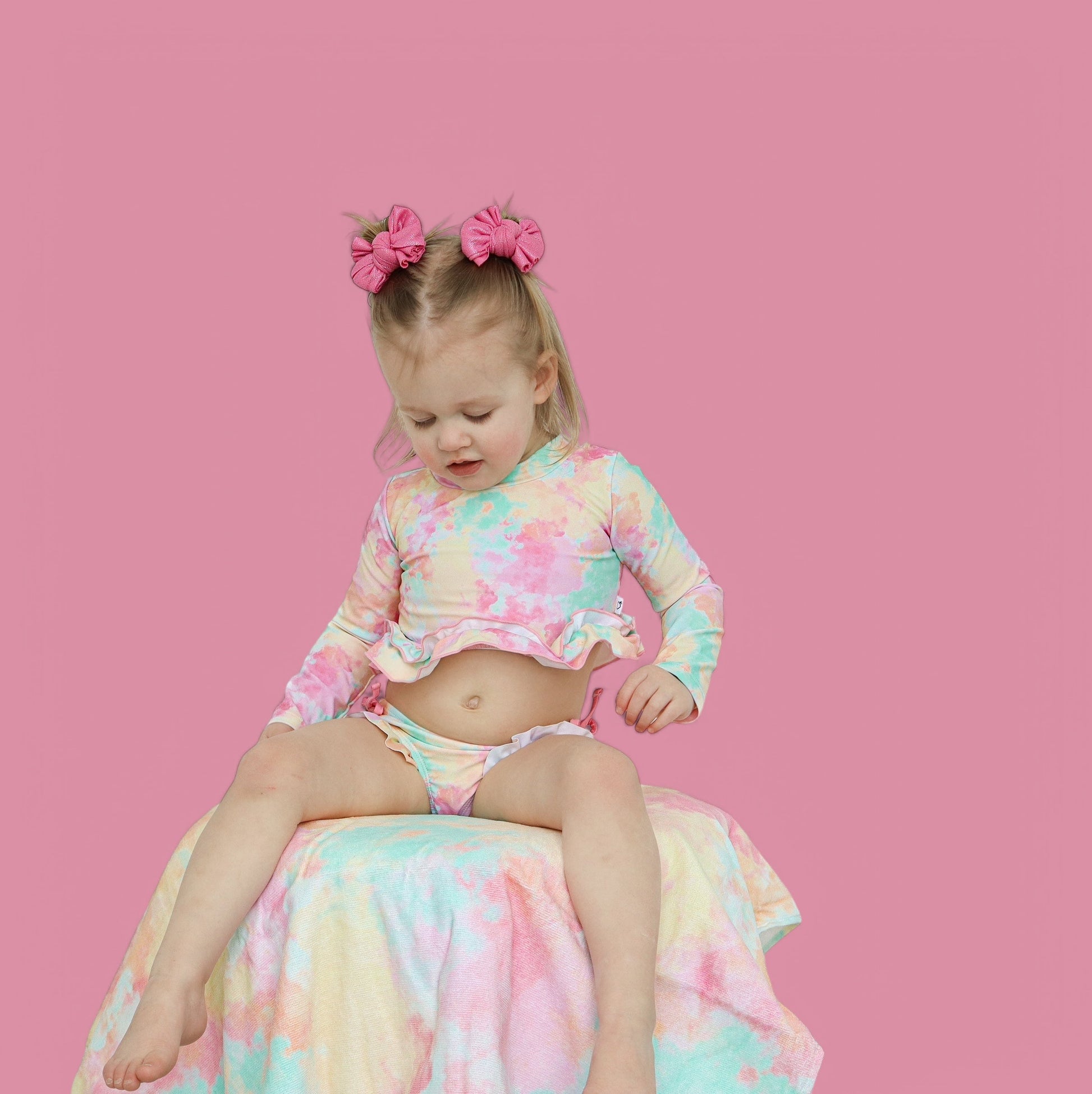 Designed with fun and function in mind, the long-sleeve rash guard offers UPF 50+ protection, so your little adventurer stays sun-safe all day. The adorable ruffled details and side bows add an extra sprinkle of charm to this swimwear ensemble, ensuring your beach babe makes waves in style.