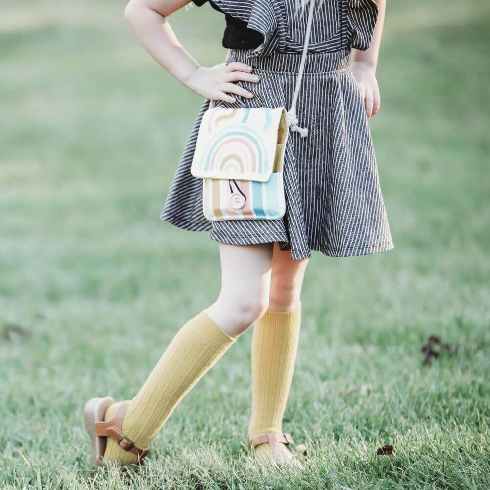 Our Rainbow Purses are made with the creative child in mind. The rainbow bag an art kit all-in-one so kids can draw, doodle and color on the go. The crossbody bag has a stripy colorful pocket in the front to store the 6 crayons and another pocket to store the paper pad. Little girls love to carry this everywhere!