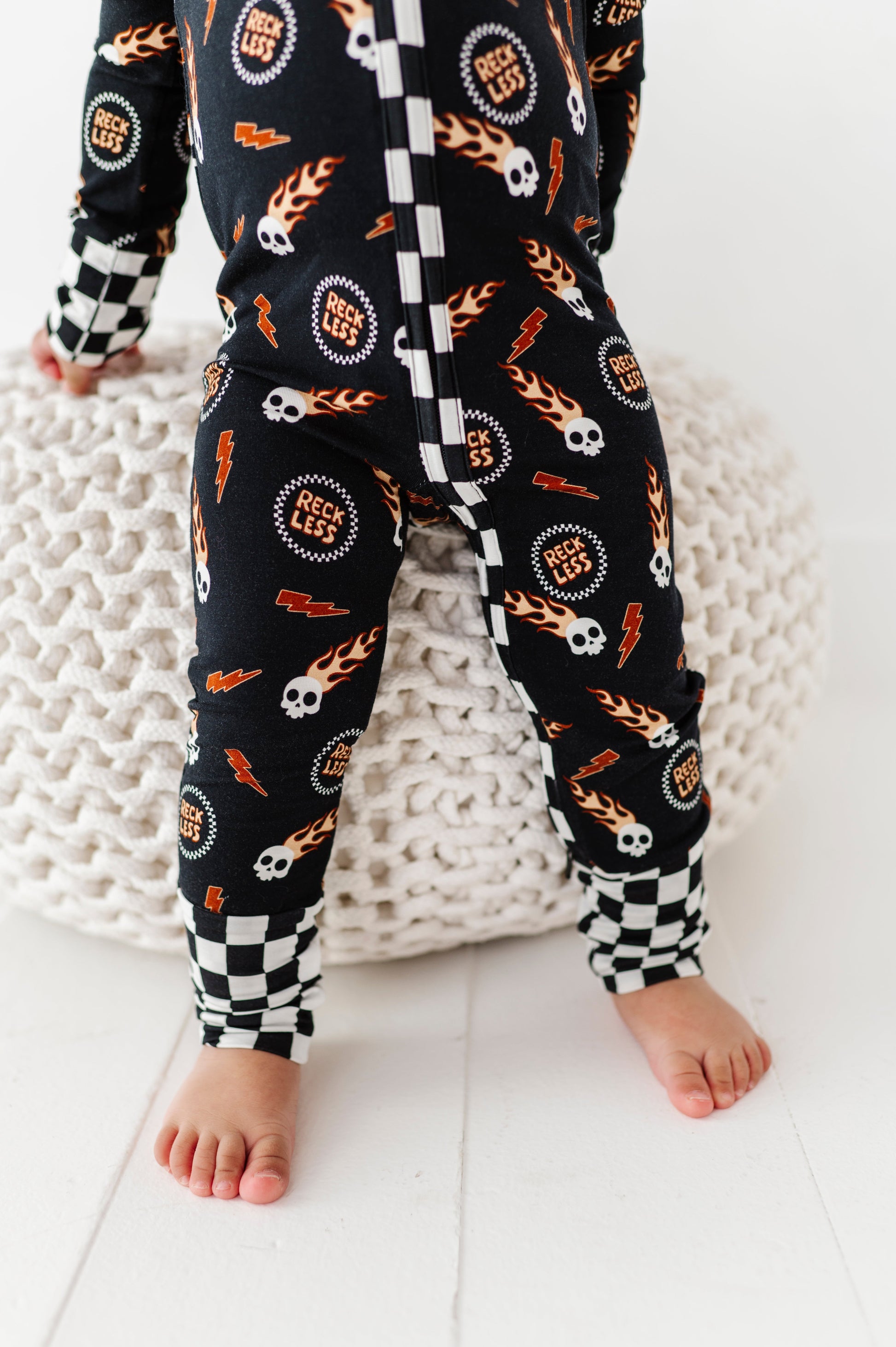 Let your little wild one live life on the edge in comfort. The Reckless bamboo onesie is made for tiny rebels, decked out with a bold checkered “Reckless” print, flaming skull graphic, and checker pattern along the zipper. It’s soft enough for snuggles, tough enough for play.