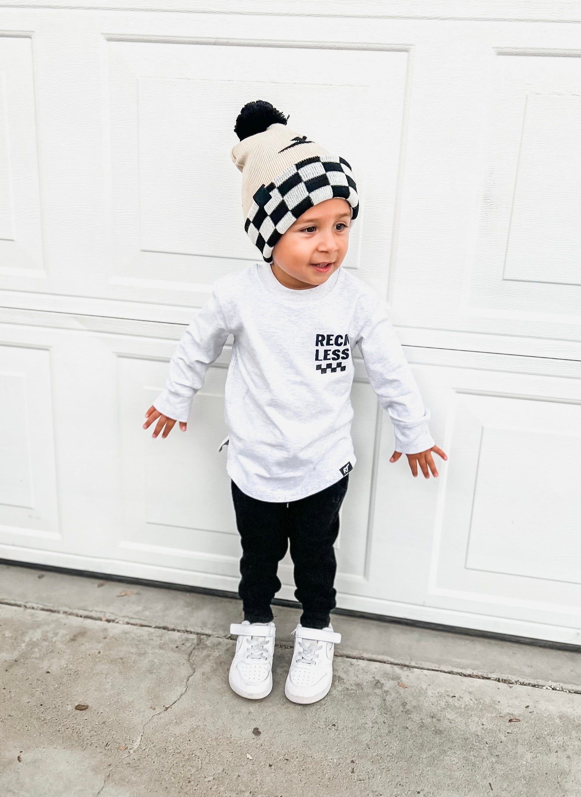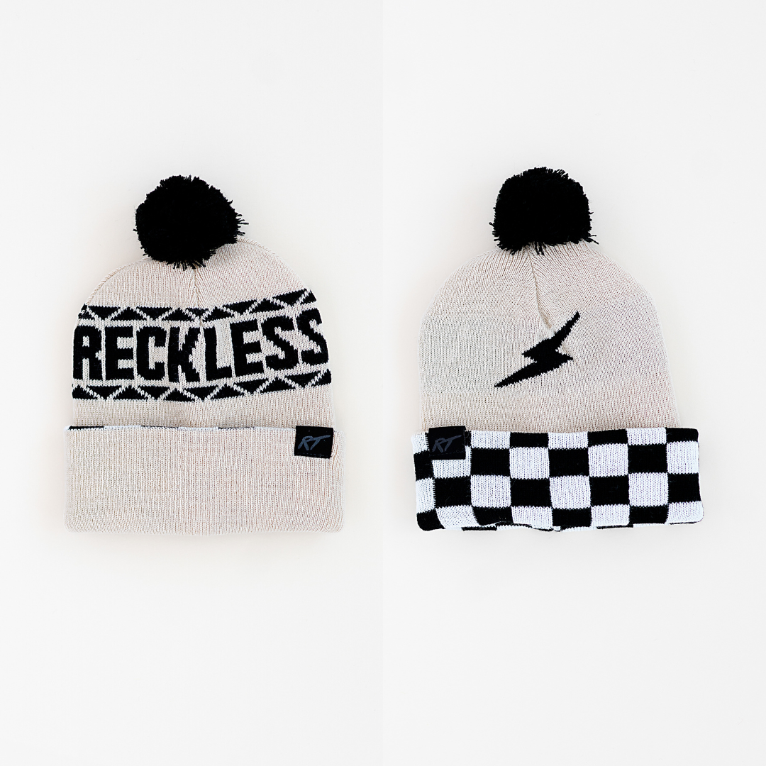 Two in one reversible toddler beanies?! Let the fun begin with our "reckless" design on one side and a lighting bolt on the other. The perfect way to stay warm this winter and complete the look with any of our jackets this season!