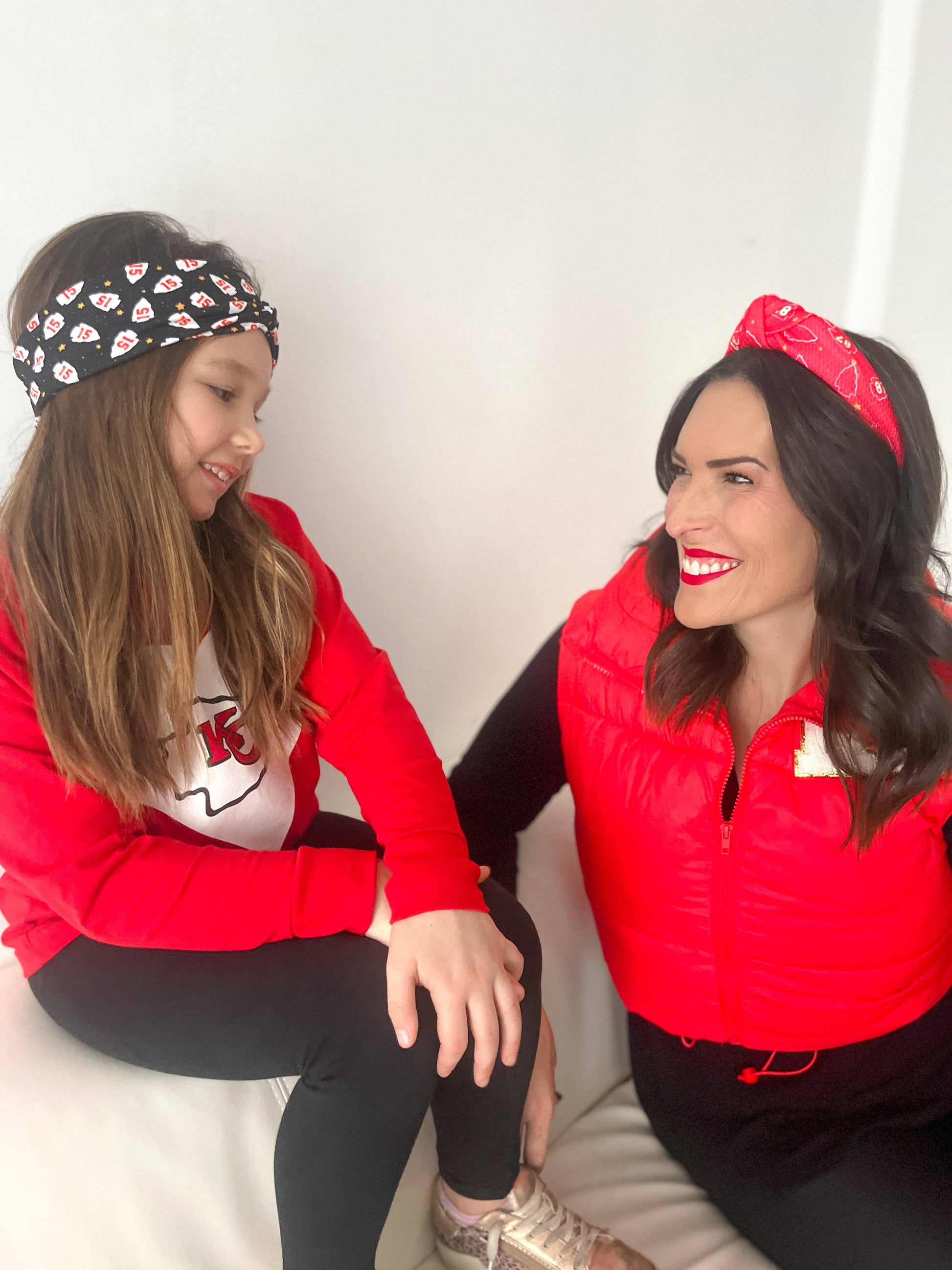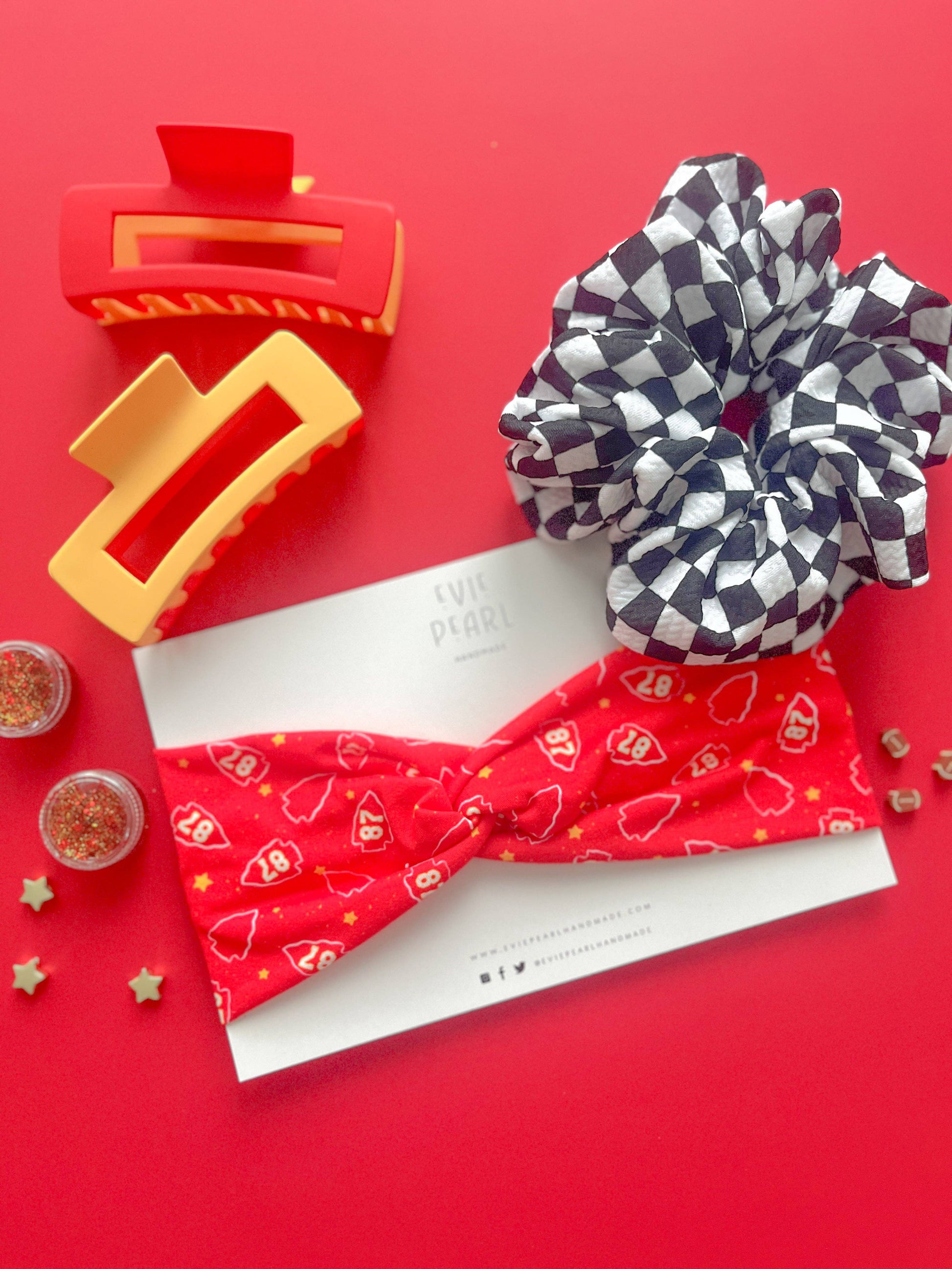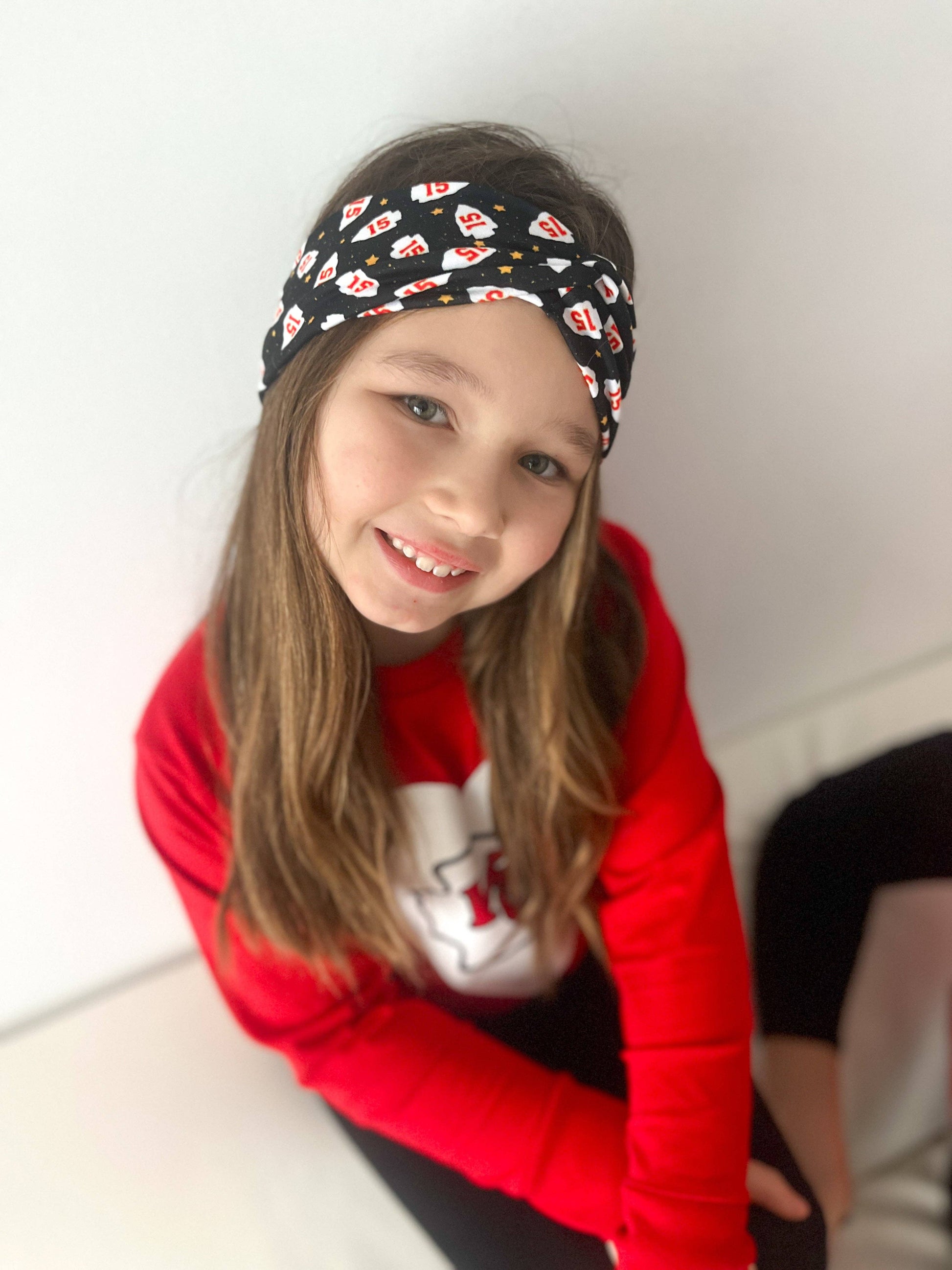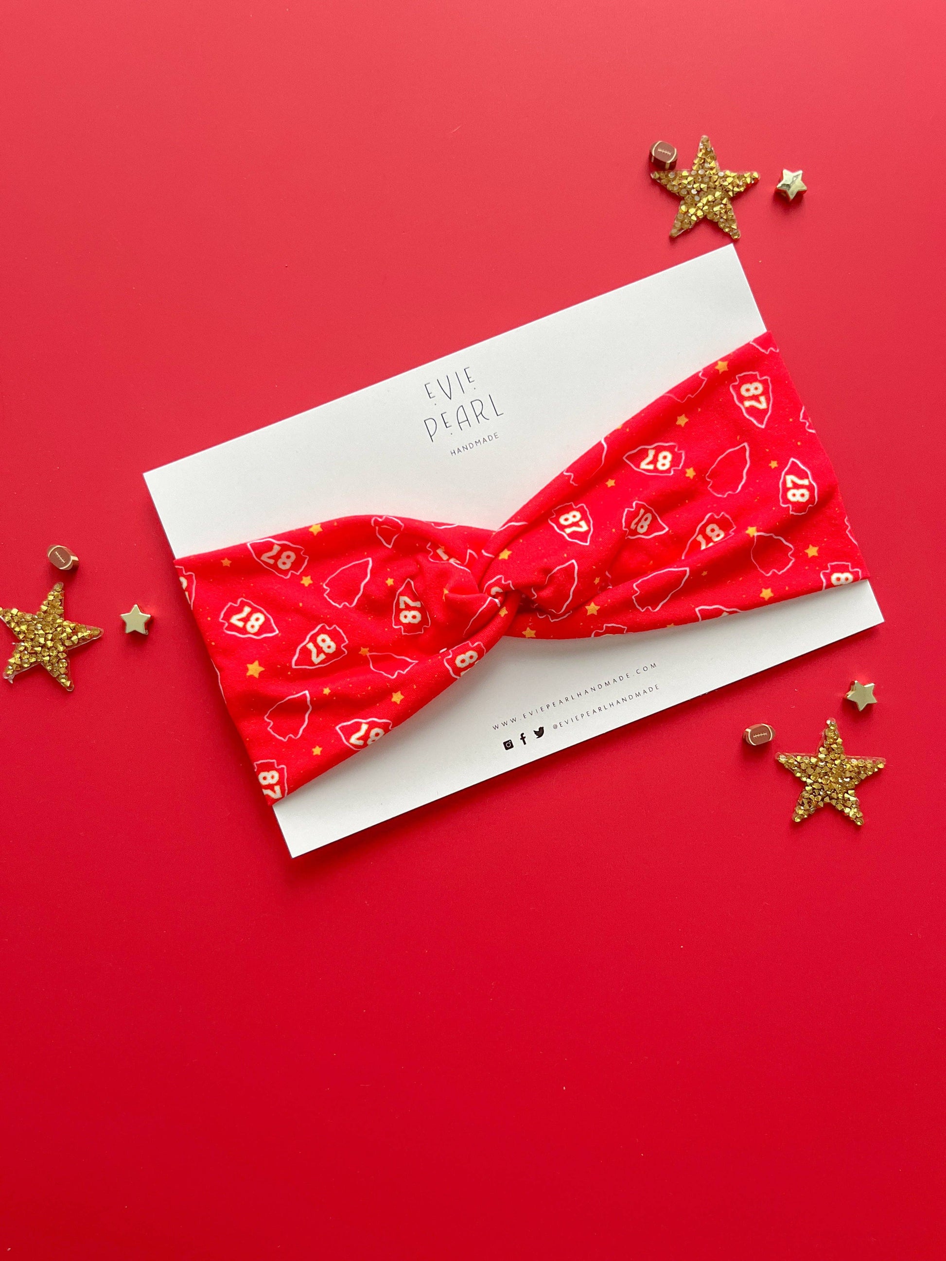Cheer on the Kansas City Chiefs in style with this handmade twisted turban headband! Designed to fit girls through adults, this soft knit fabric headband is non-slip, ensuring it stays in place during Red Friday, game days, tailgates, and watch parties. Available in two bold patterns—red leopard or white leopard—both featuring Kansas City Chiefs colors, this headband is the perfect way to showcase your team spirit.