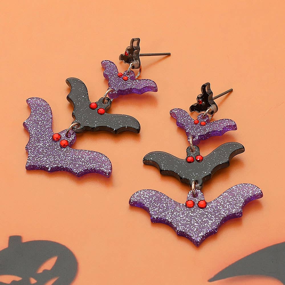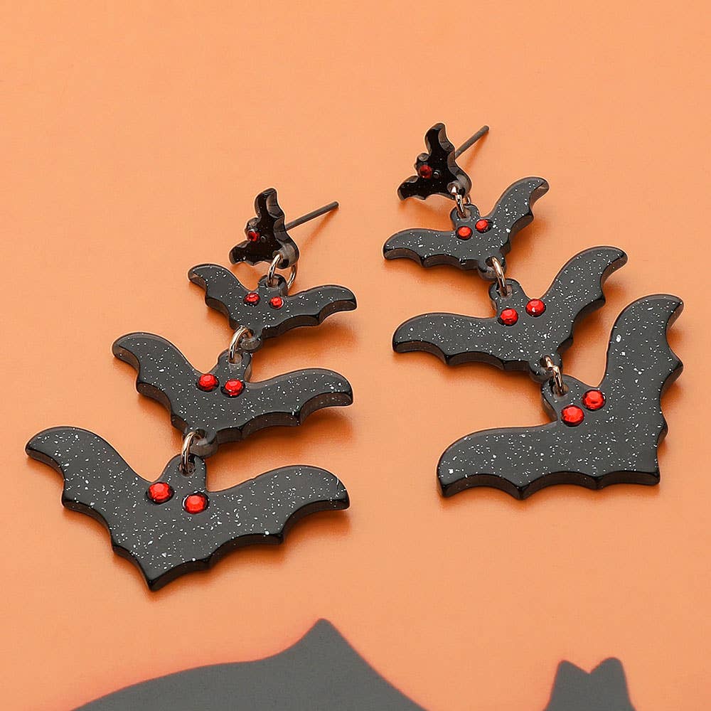 Spooky stacked bat dangle earrings with shimmering details and striking red eyes—perfect for Halloween parties and festive outfits.