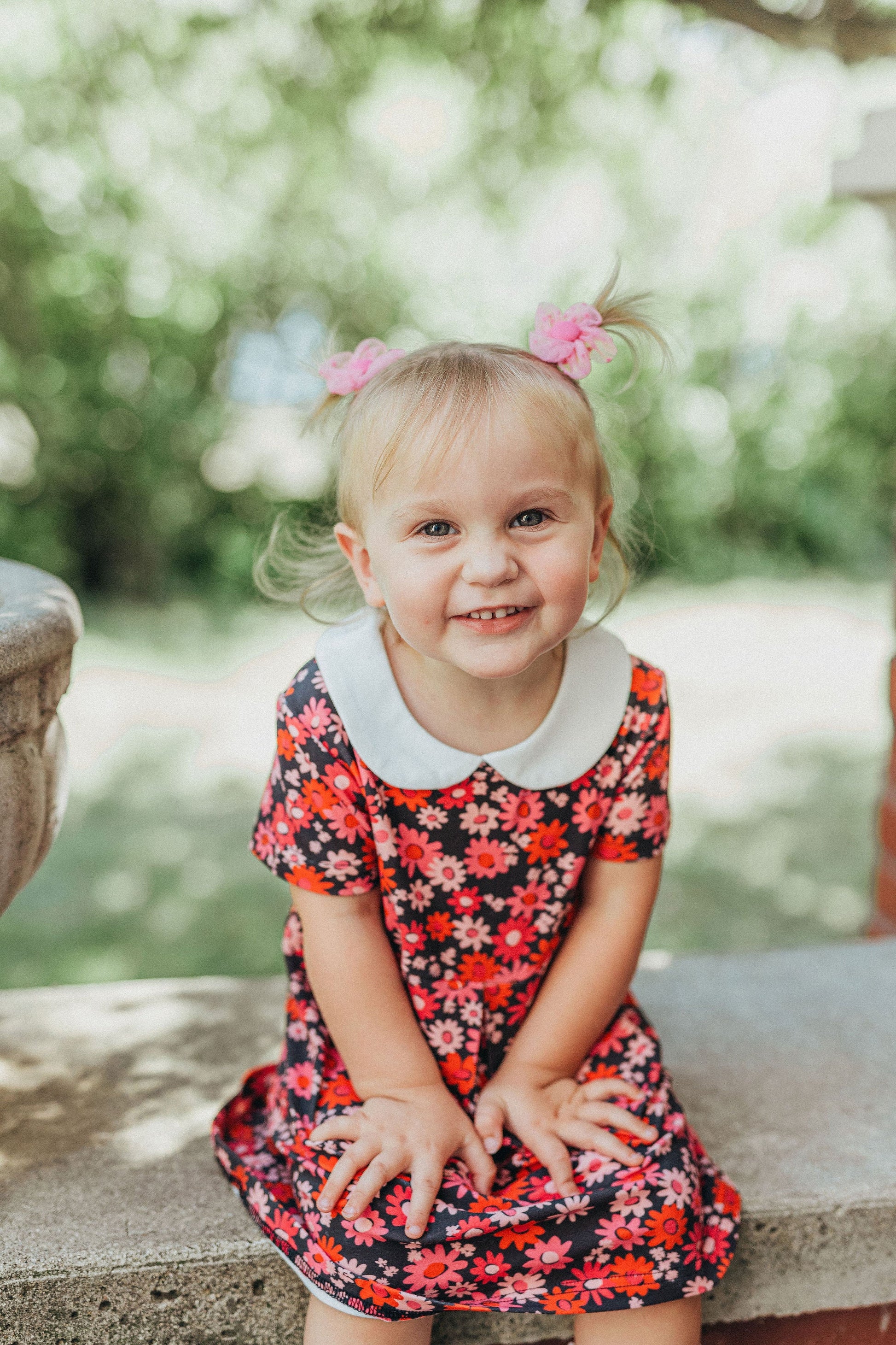 The retro mod navy and pink peter pan collar floral dress is the perfect vintage-inspired piece for your little girl. Featuring a fun flower power print in the perfect fall colors, and the sweetest peter pan collar, your little one will be irresistibly cute. Not only will they look absolutely cute in this timeless piece, they will be so comfortable since it's made from a stretchy cotton spandex blend material. What's better than sweet vintage style with modern comfort for a little one? Sizes 3-6 months-18-24 months come with a matching diaper cover.