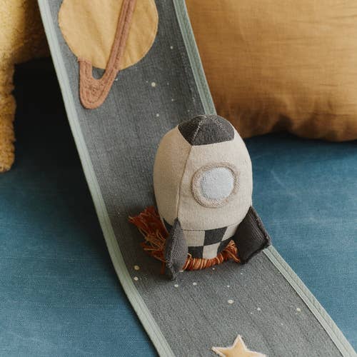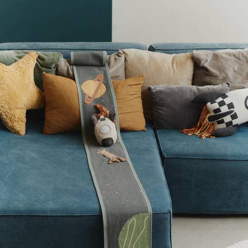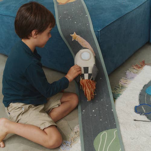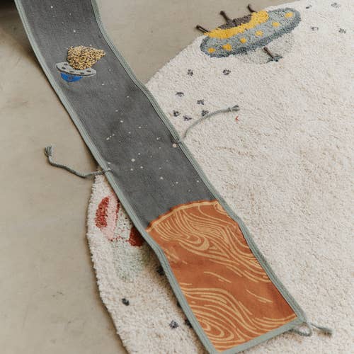 Embark on an amazing space journey with the Milkyway Ride & Roll! This handcrafted textile toy features a soft rocket made from natural and dark grey cotton canvas, with fringed edges that look like rocket flames. It unrolls from a 4-meter canvas base in dark grey and petroleum colors, showcasing detailed elements such as tufted planets, patches for planets made of canvas, stitched cords, a canvas UFO with playful tufted lights, and a shooting star with colorful streamers.