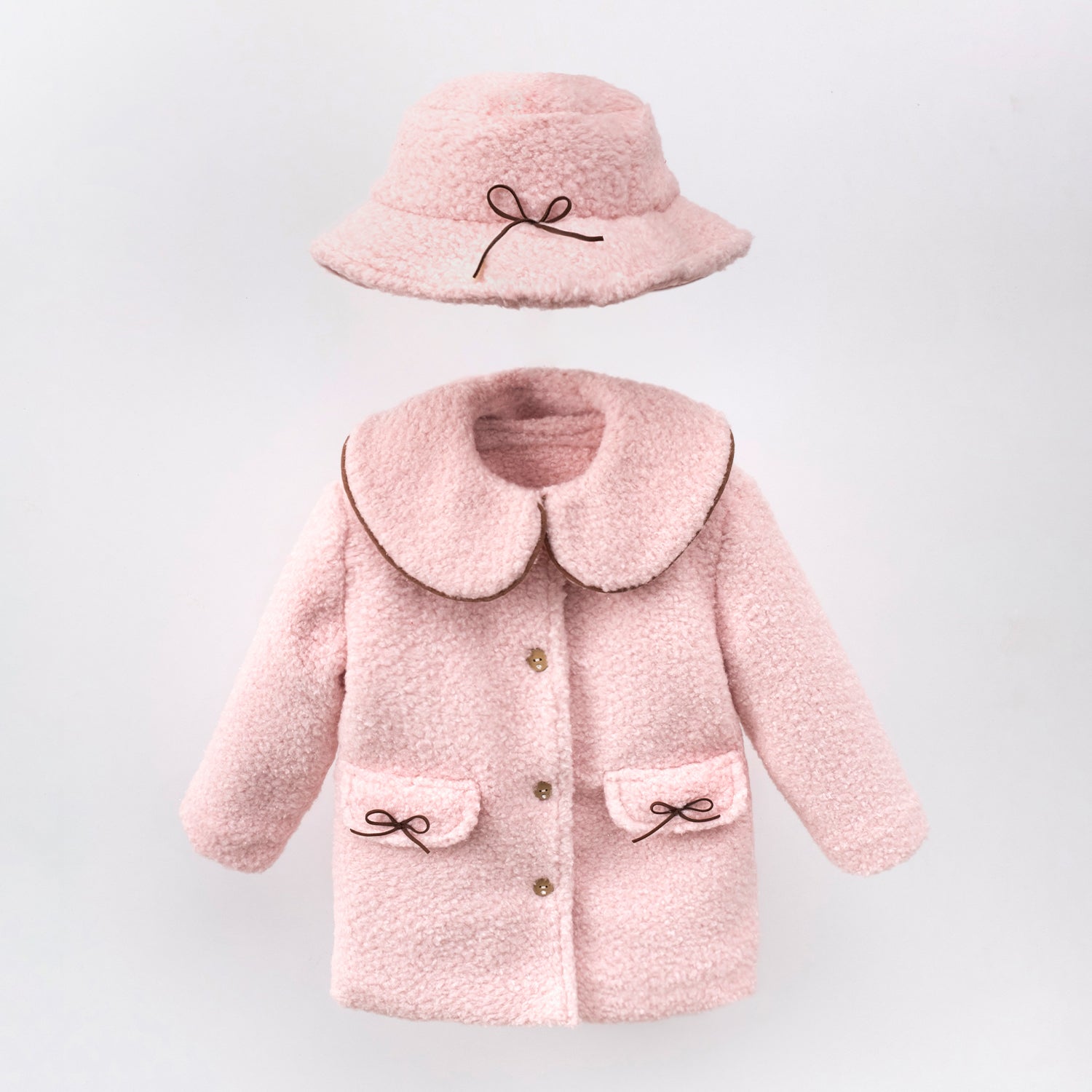 Wrap your little one in cloud-soft coziness. The Rosalie Coat Set is crafted in a plush bouclé with a classic button-front and oversized Peter Pan collar trimmed with delicate contrast piping. Two bow-topped pockets keep tiny treasures safe, while the matching bucket hat completes the picture-perfect look. Dress it up with the collar for special moments or wear the coat alone for every day—either way, it’s irresistibly sweet and snug.